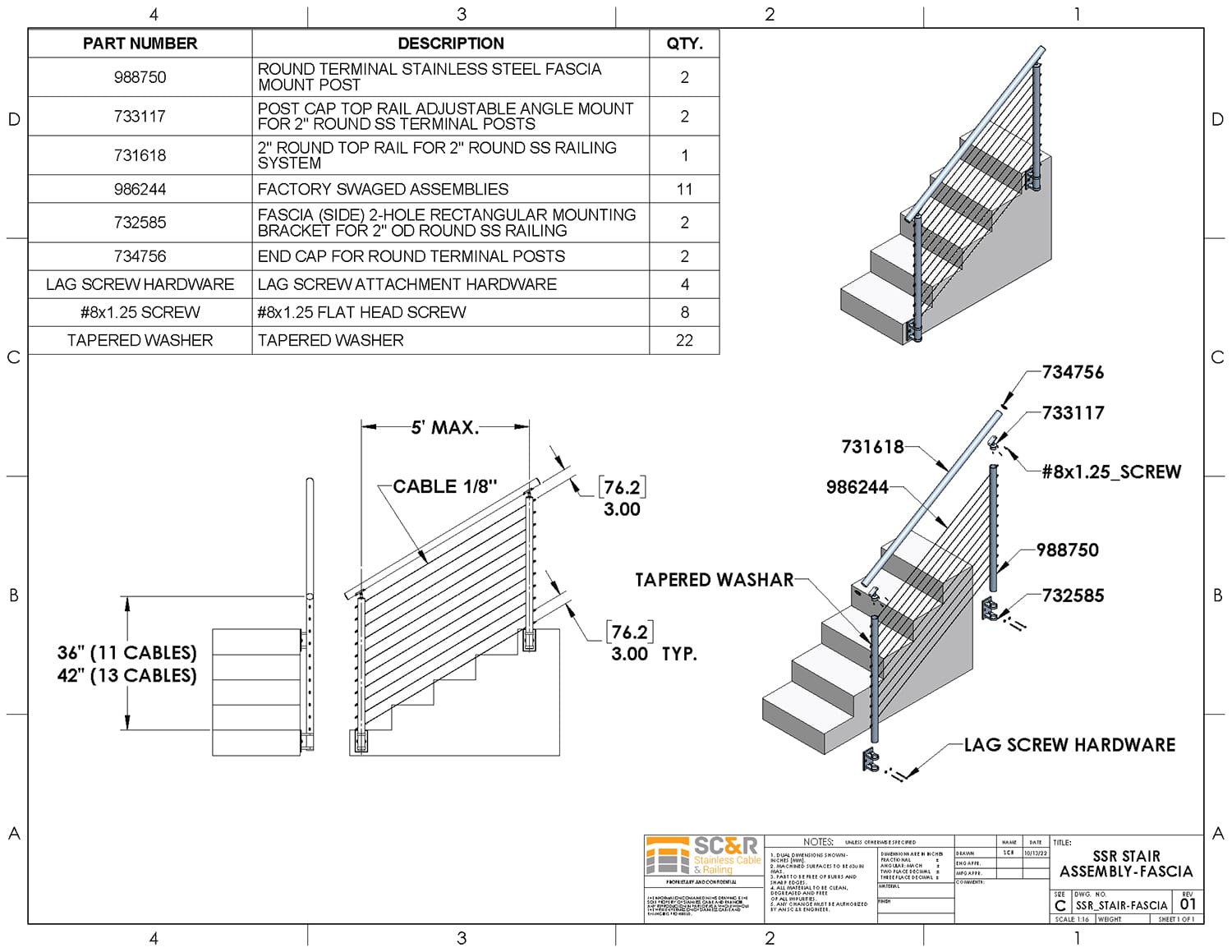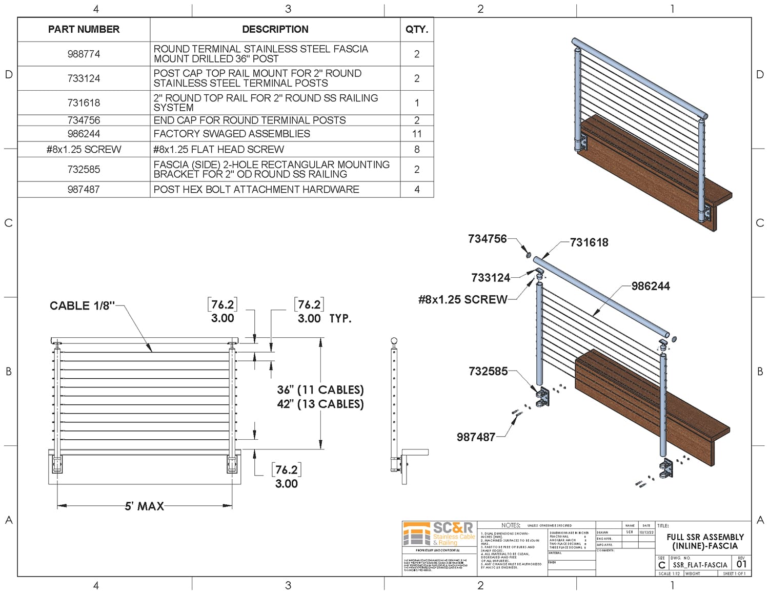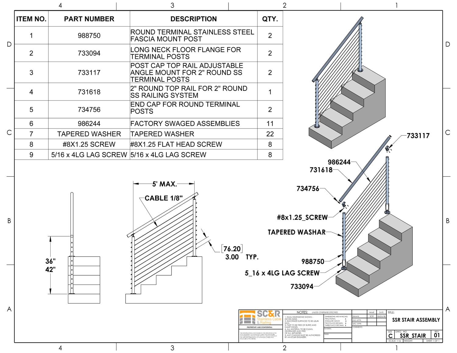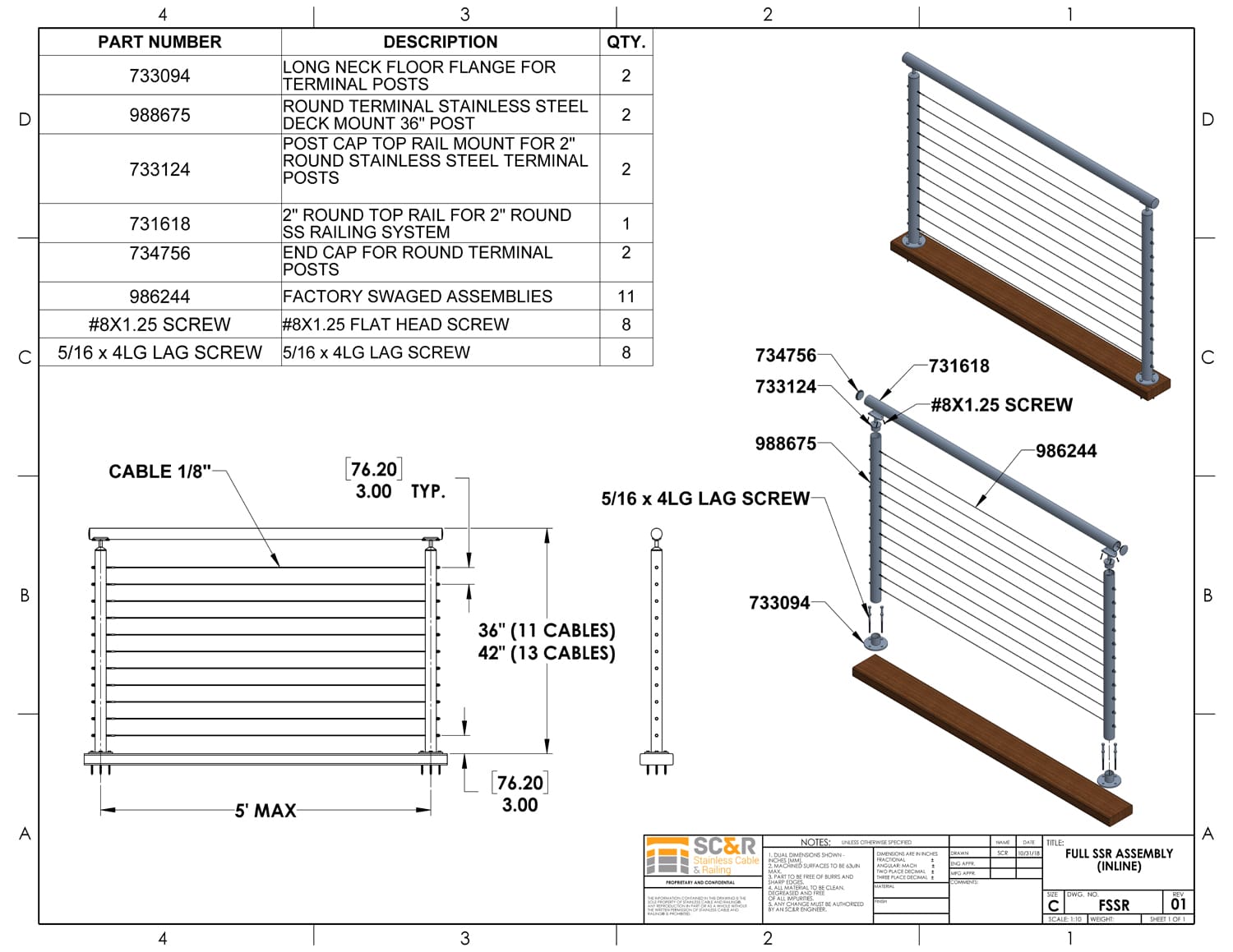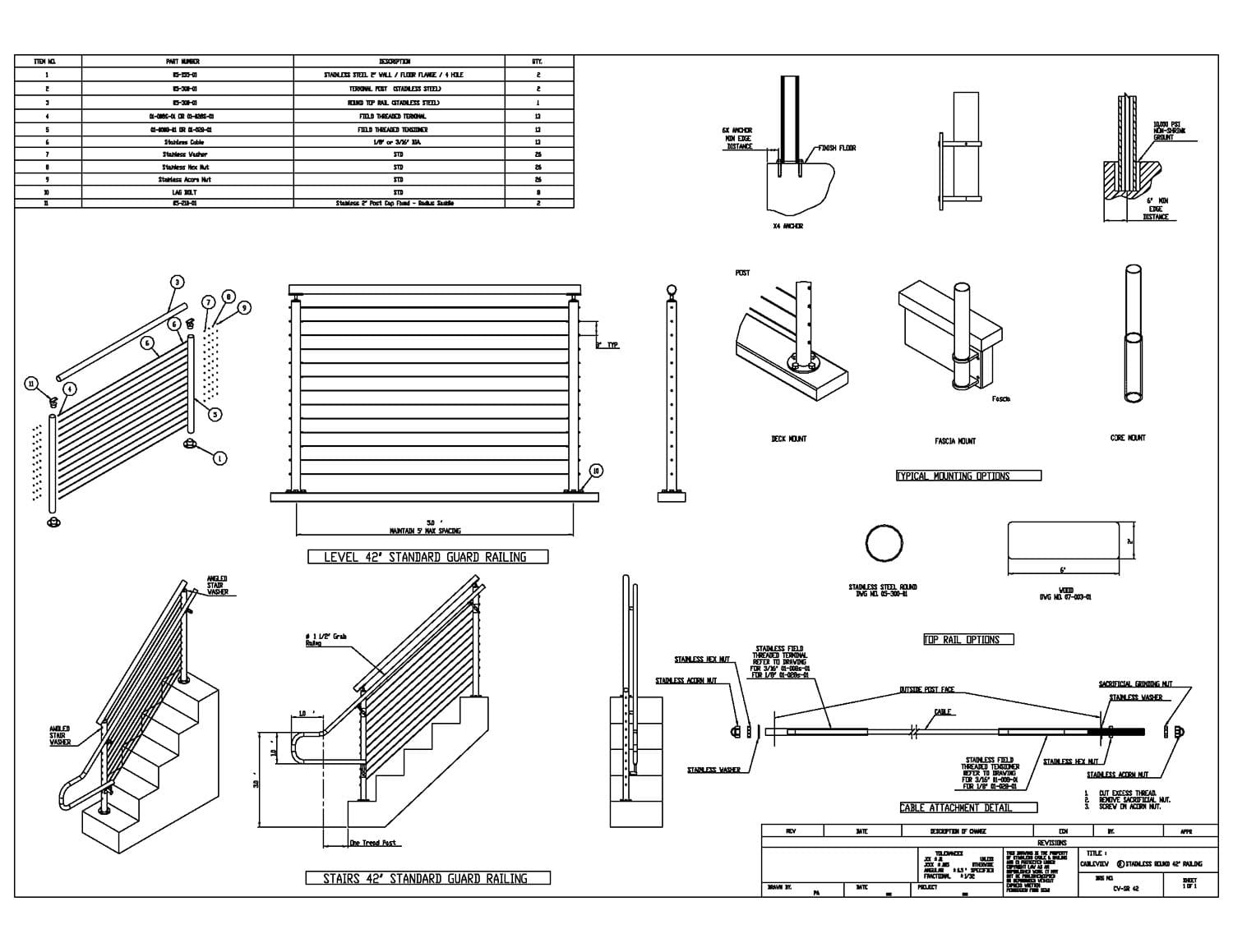 - Rail Height: 36in, 42in, or Custom