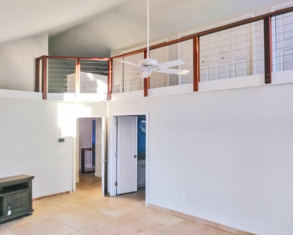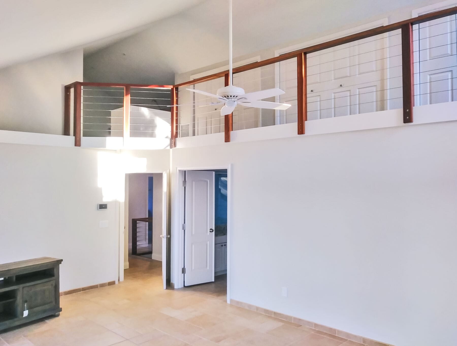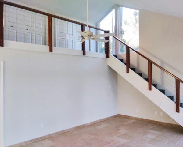 With clean white walls acting as a blank canvas, the strongly-colored balau wood railing frame and accents make a statement in this Floridan home.
