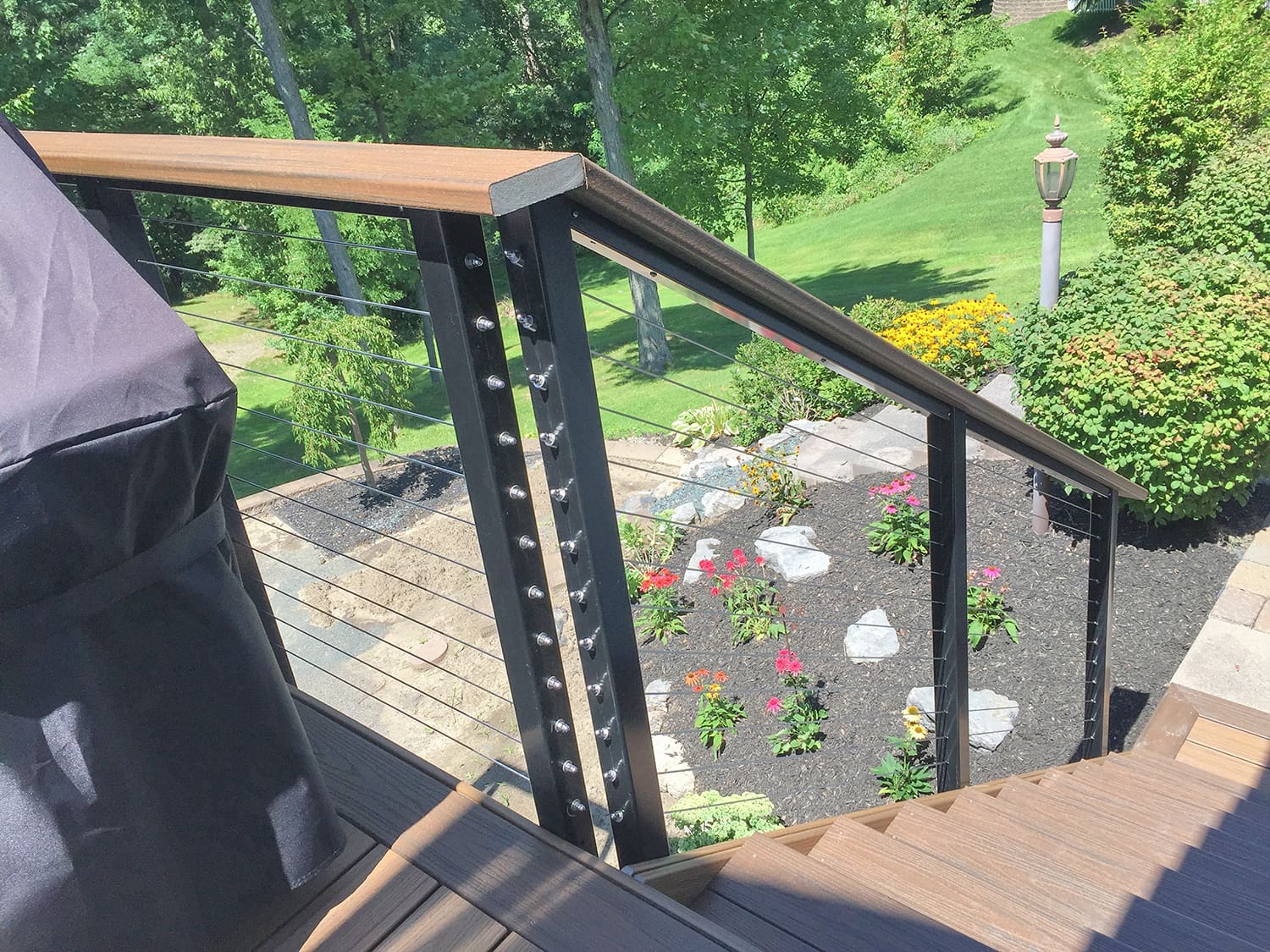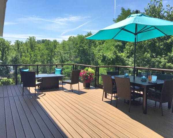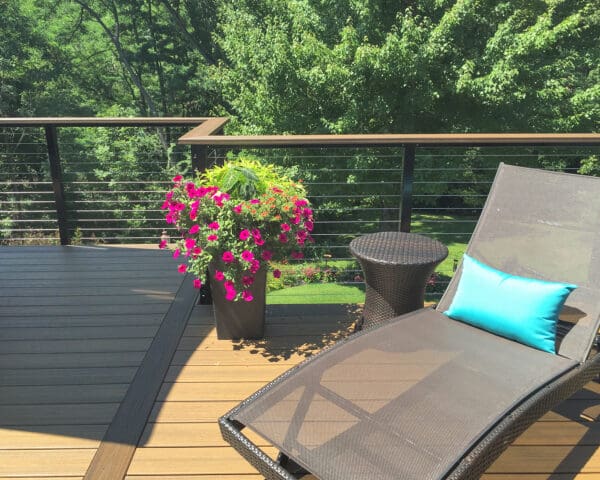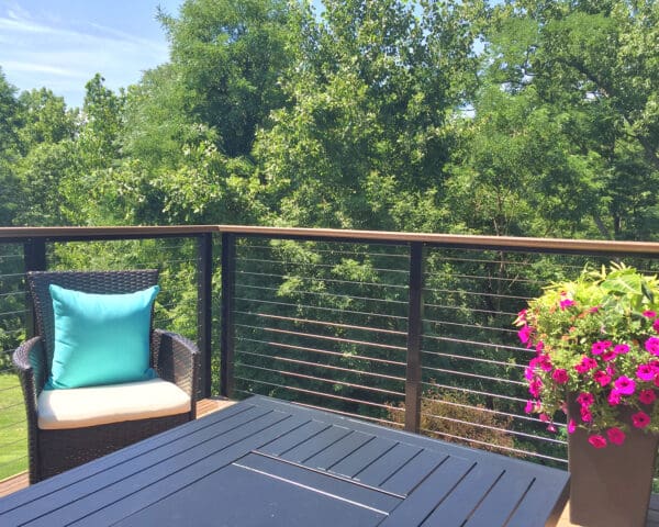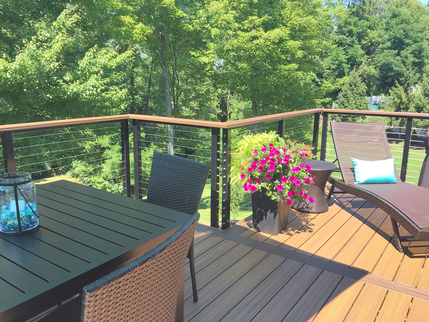 This stylish deck in Albany, New York was built for entertainment. With multiple areas for lounging and socializing, the homeowners chose a fascia-mount railing that keeps the space open. The dark aluminum contrasts nicely with a light wood deck and vivid accent colors to create a refreshing, contemporary look.