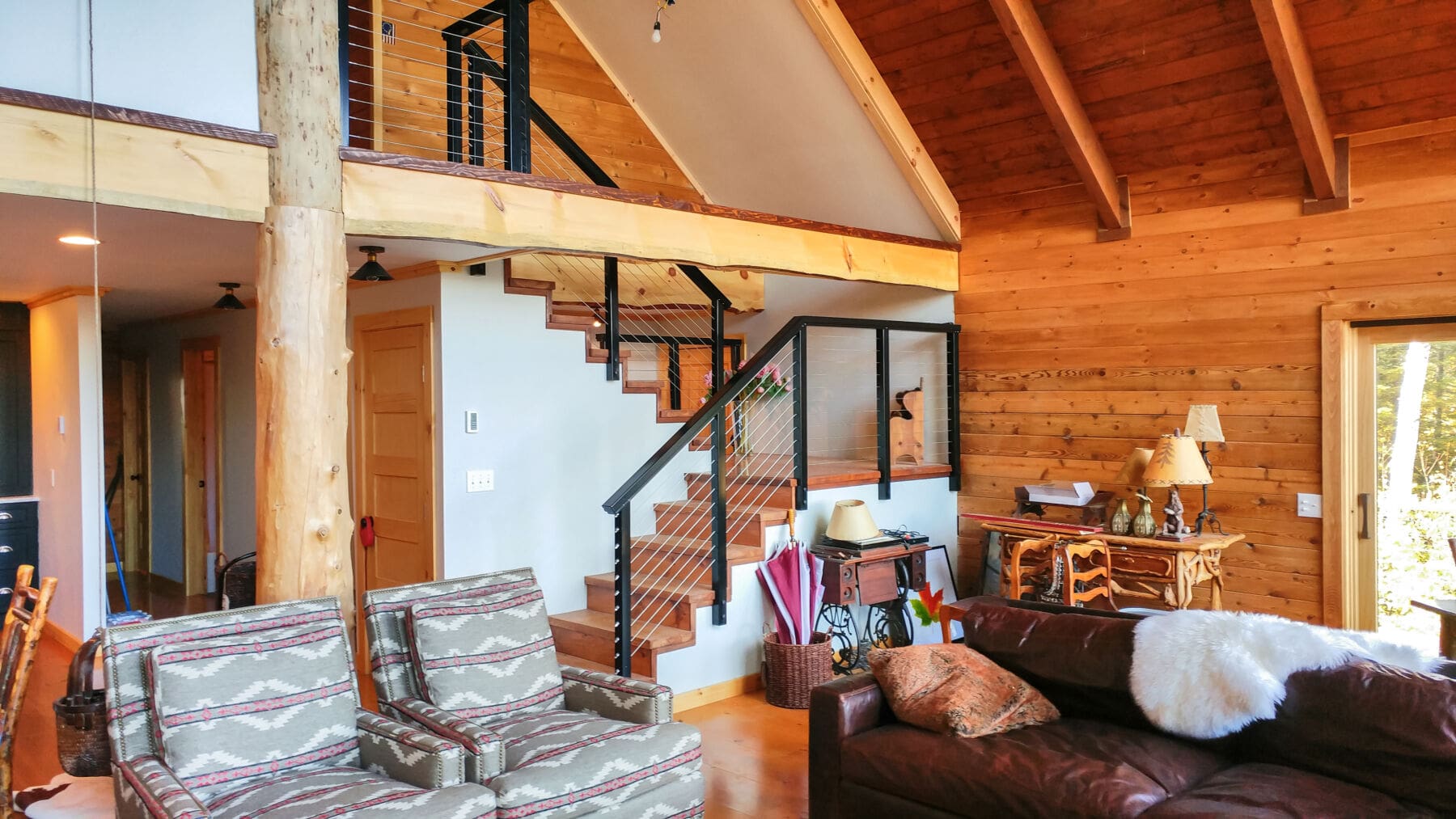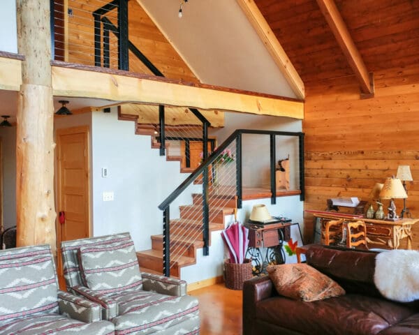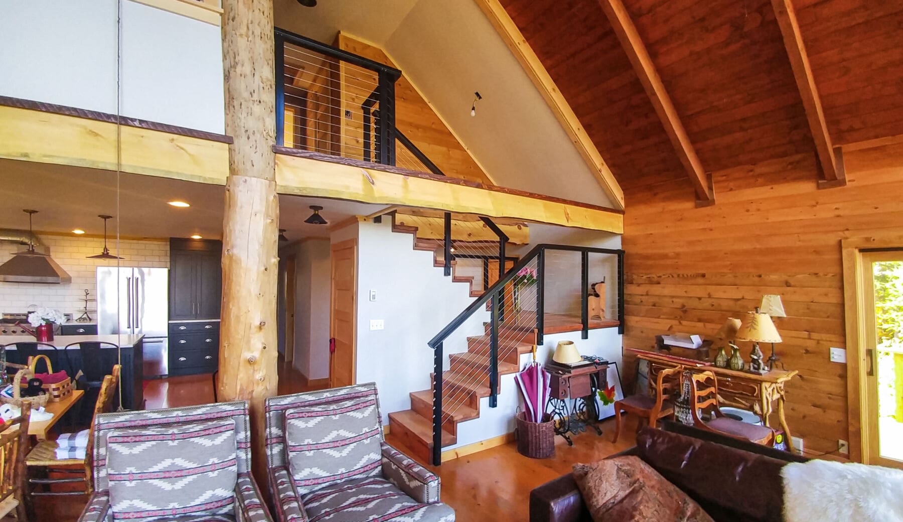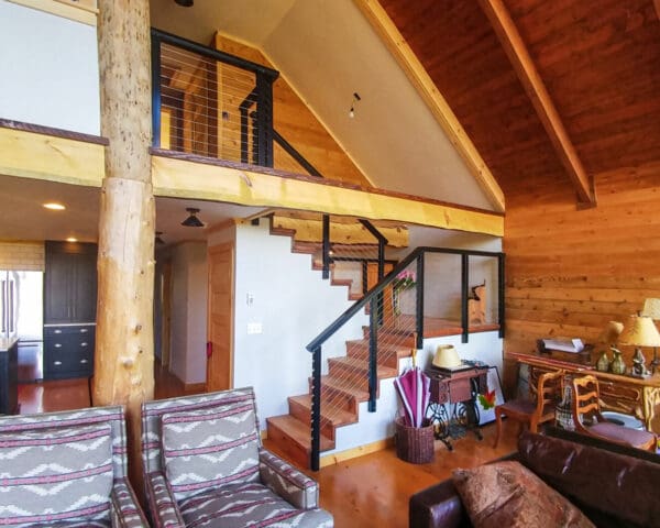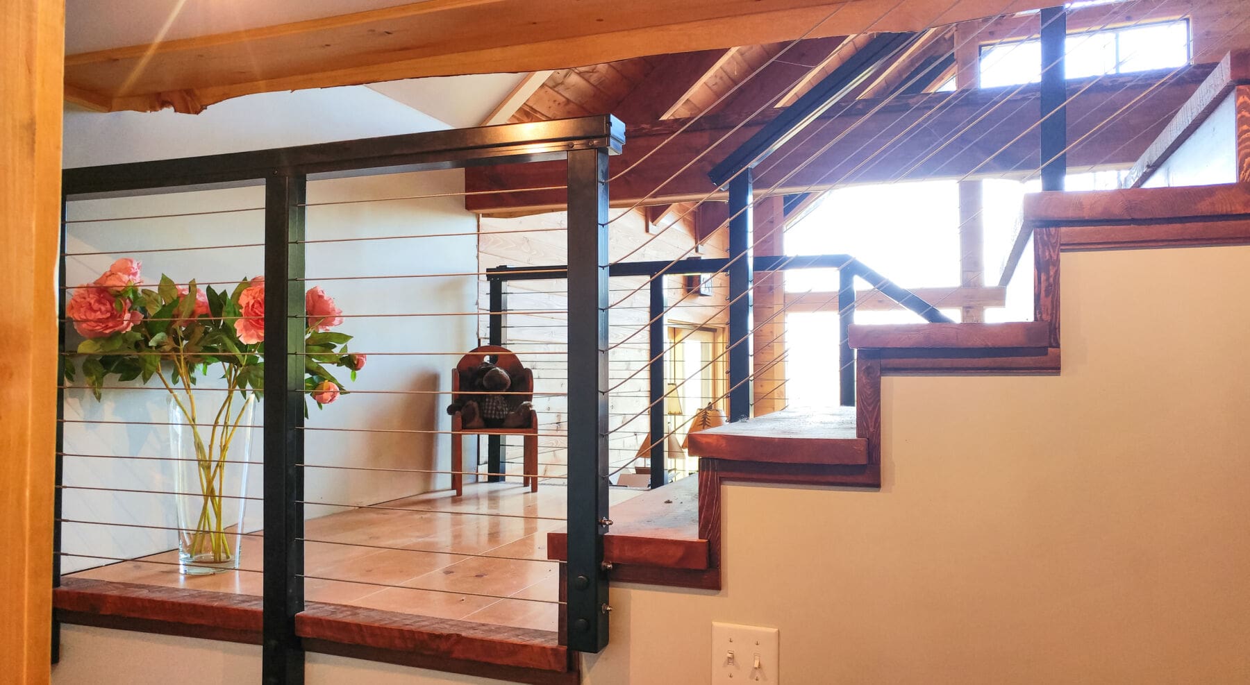 Black aluminum looks strong and stylish against the white and cedar interior of this rustic home. With a triangular opening on the far side of the staircase, this particular project needed a railing system that could keep the area open, but safe. Our surface mount toggle assemblies allow the cables to terminate on the ceiling rather than requiring a full railing up the other side.