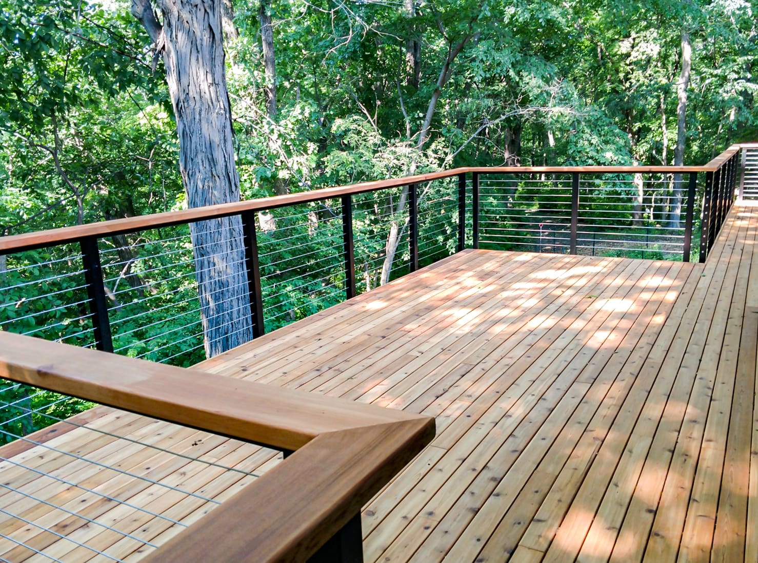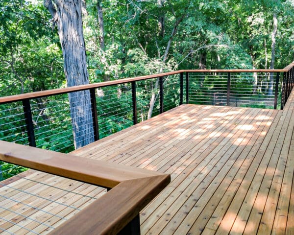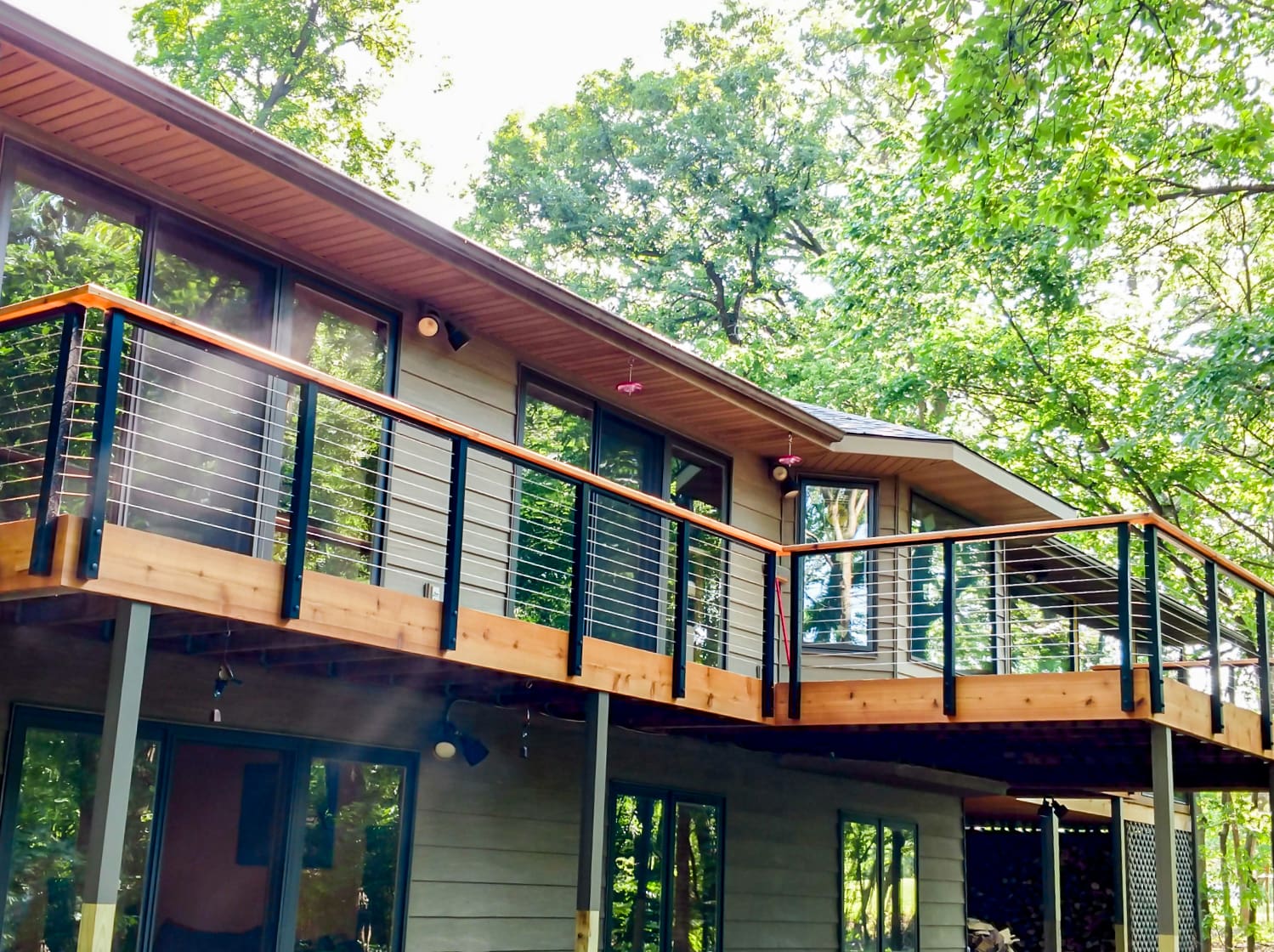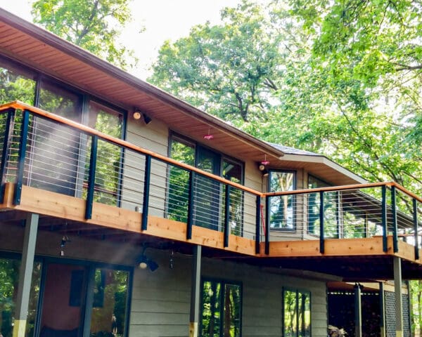 Surrounded by greenery, this backyard area blends into the forest without any physical or visual barriers. Cable railing aides in creating this effortless escape into nature.