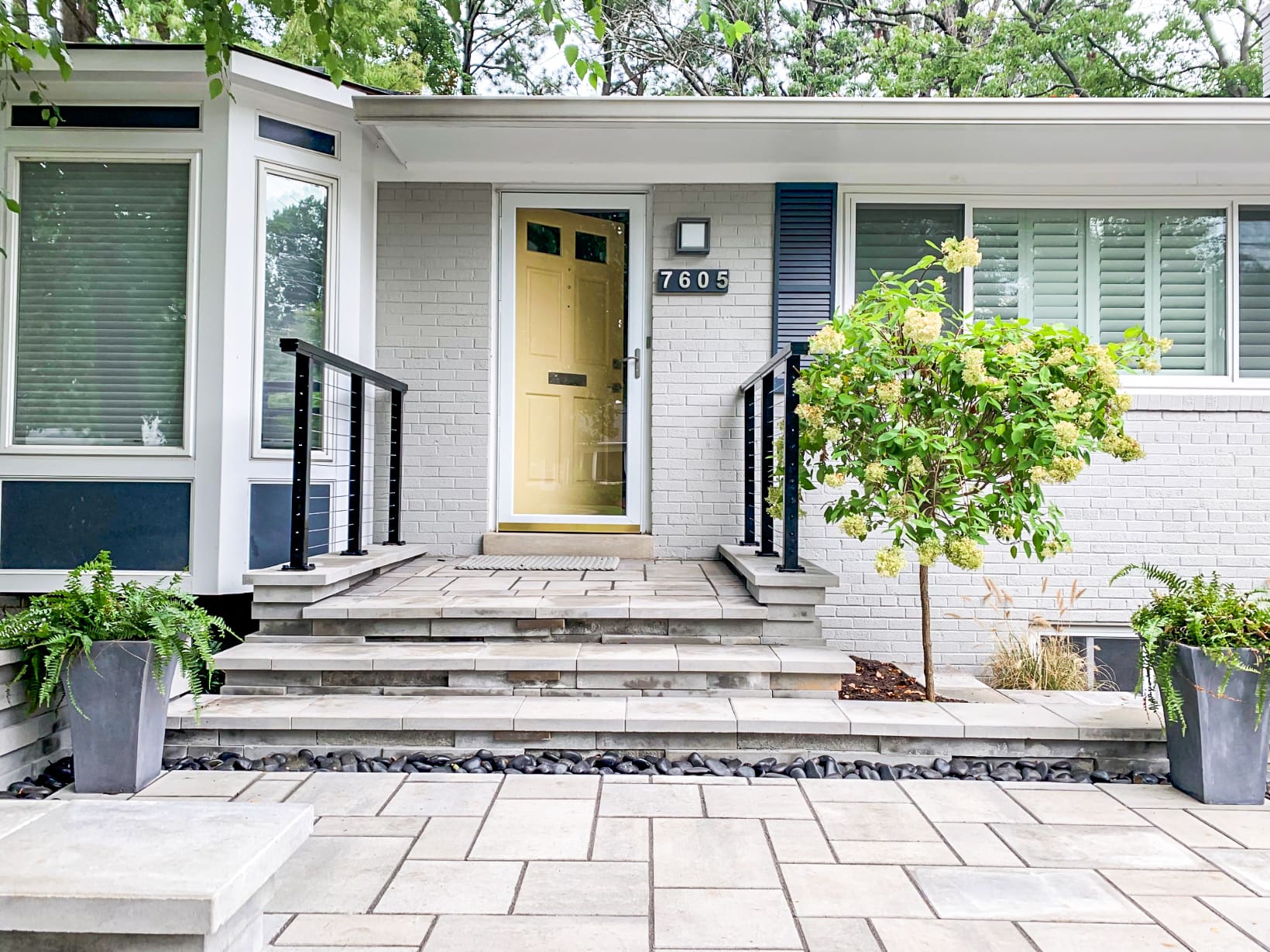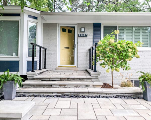A simple black aluminum railing stands out dramatically against the light stone of this elevated contemporary entrance. Clean lines draw the eye to a bright, welcoming door.