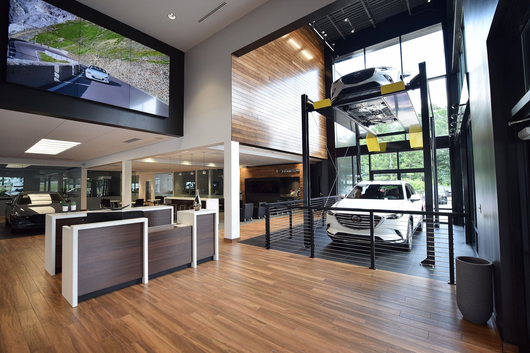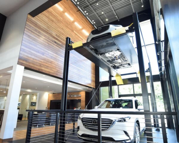Our black aluminum railing adds to the modern and minimal feel of this Mazda showroom in Birmingham, AL. There are many different ways to use our railing.