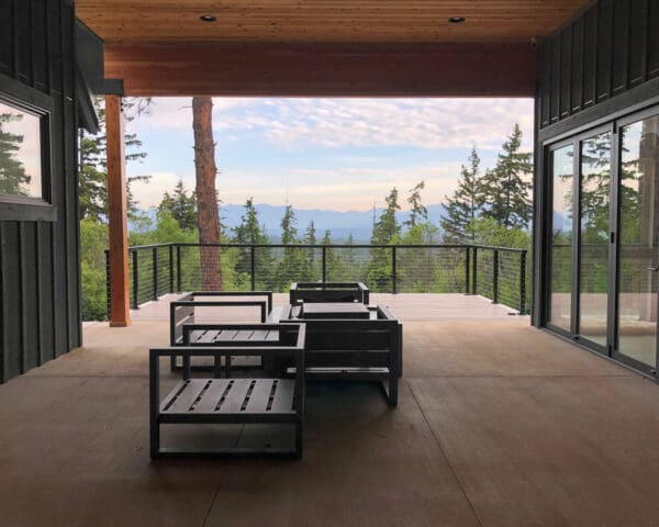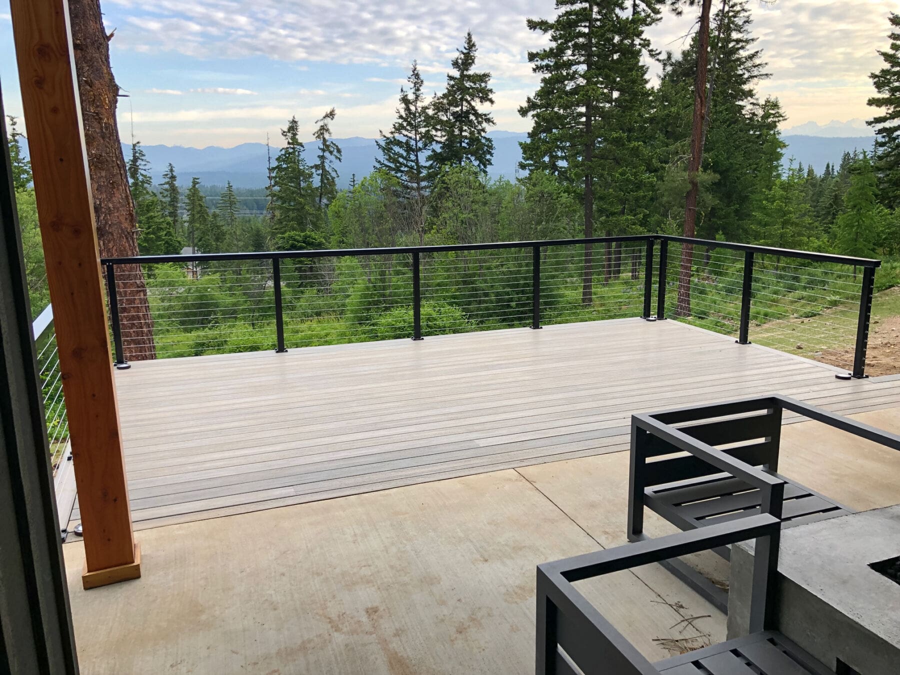 Black cable railing lines this slope-facing deck on a contemporary home in Ellensburg, WA. With an open view of the trees and sky beyond, residents resting in the covered lounge area can easily enjoy moody sunsets like this one.
