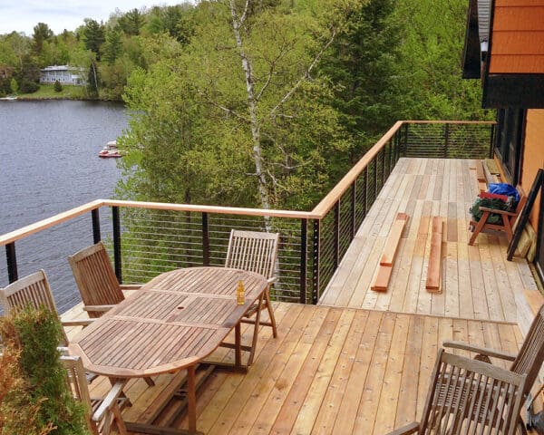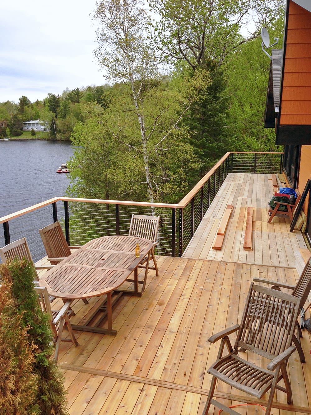 Dangling over a serene lake in Quebec, Canada, this deck required an open railing design for its remodel. The black aluminum posts and thin cable disappear against a view of trees and water, and contrast nicely with the fresh wood deck and top rail.