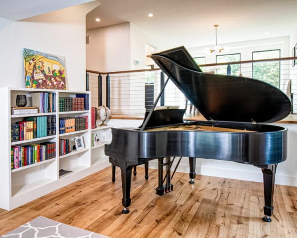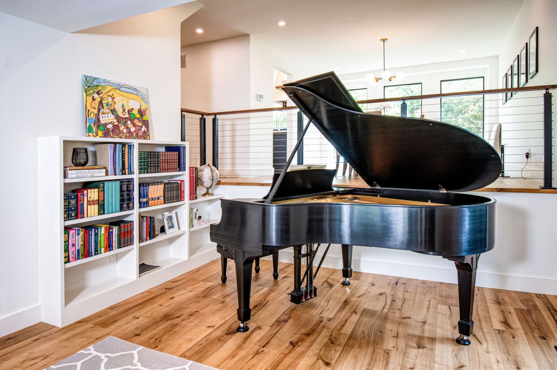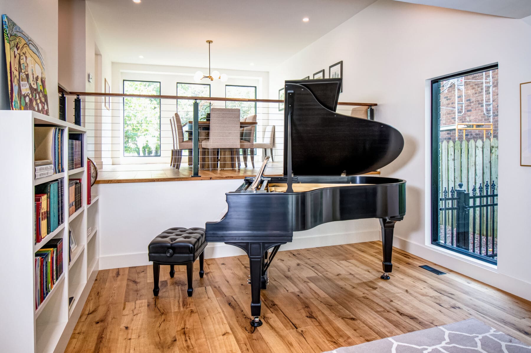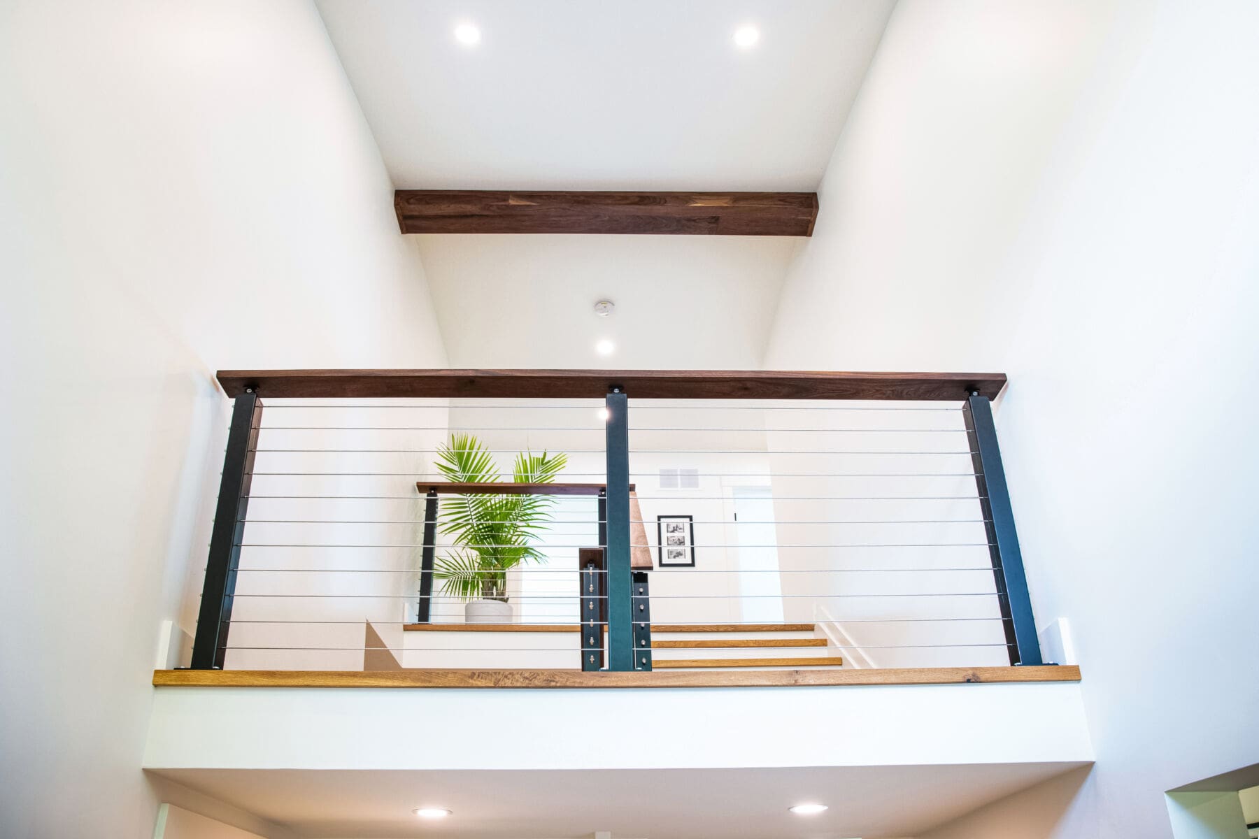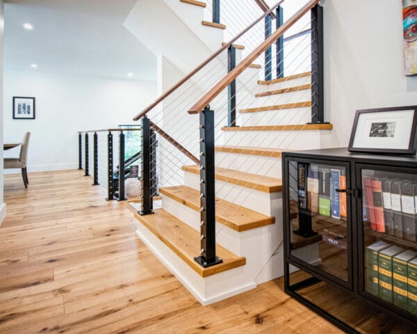 Featuring white walls and rich woods, this home in Oakville, Ontario is both impressive and inviting. Black aluminum cable railing keeps the space open and adds dark accents to the bright color scheme.