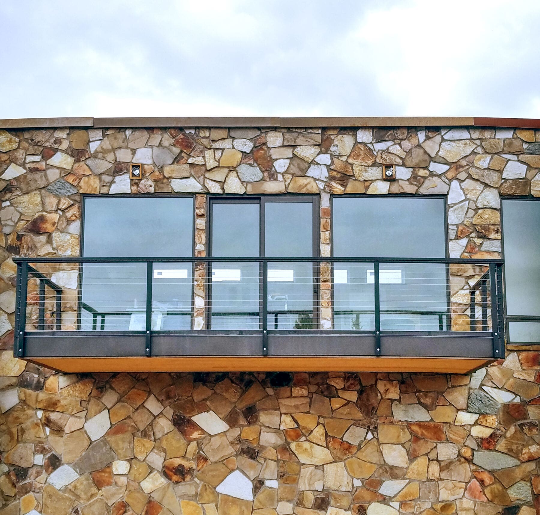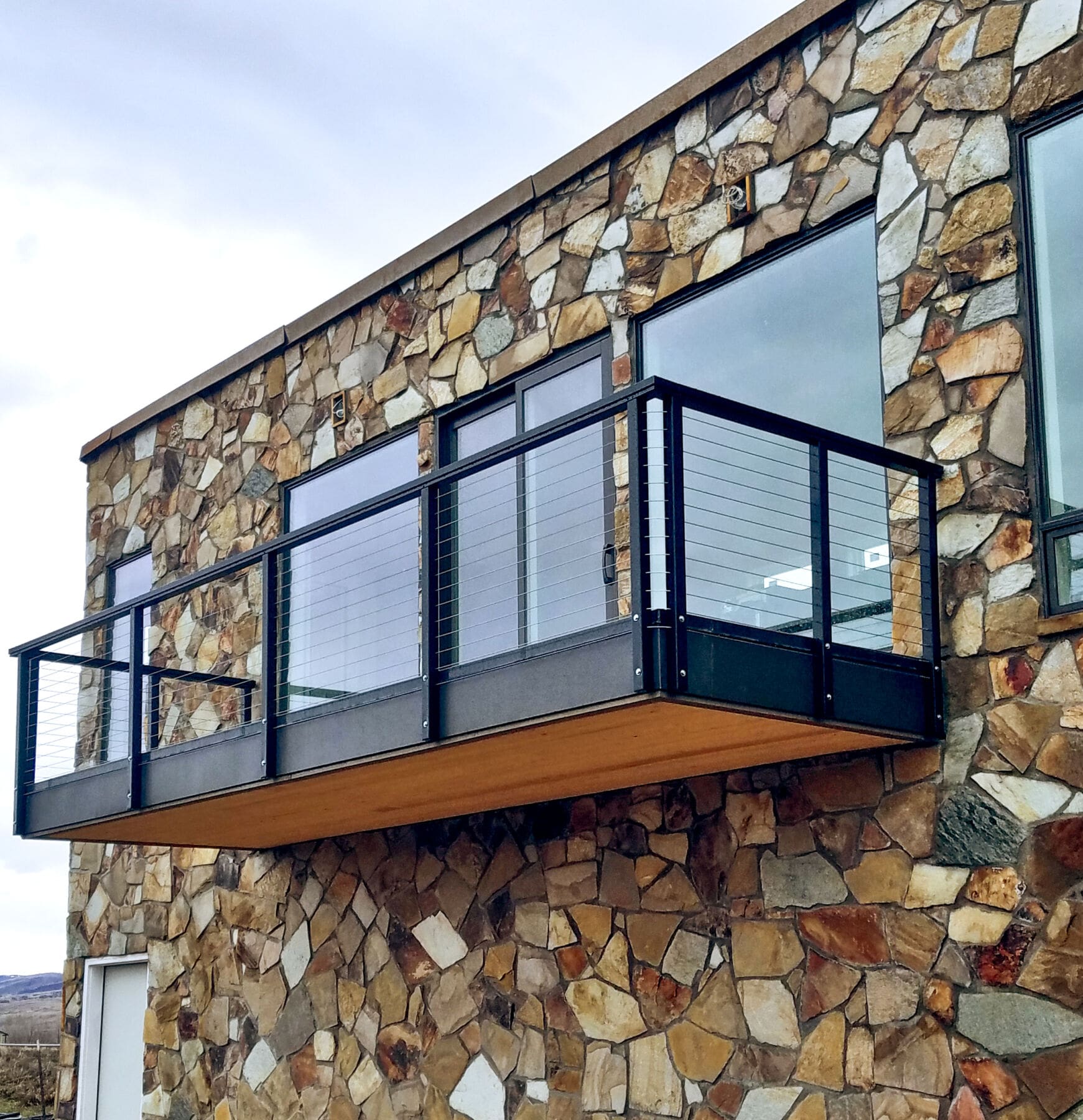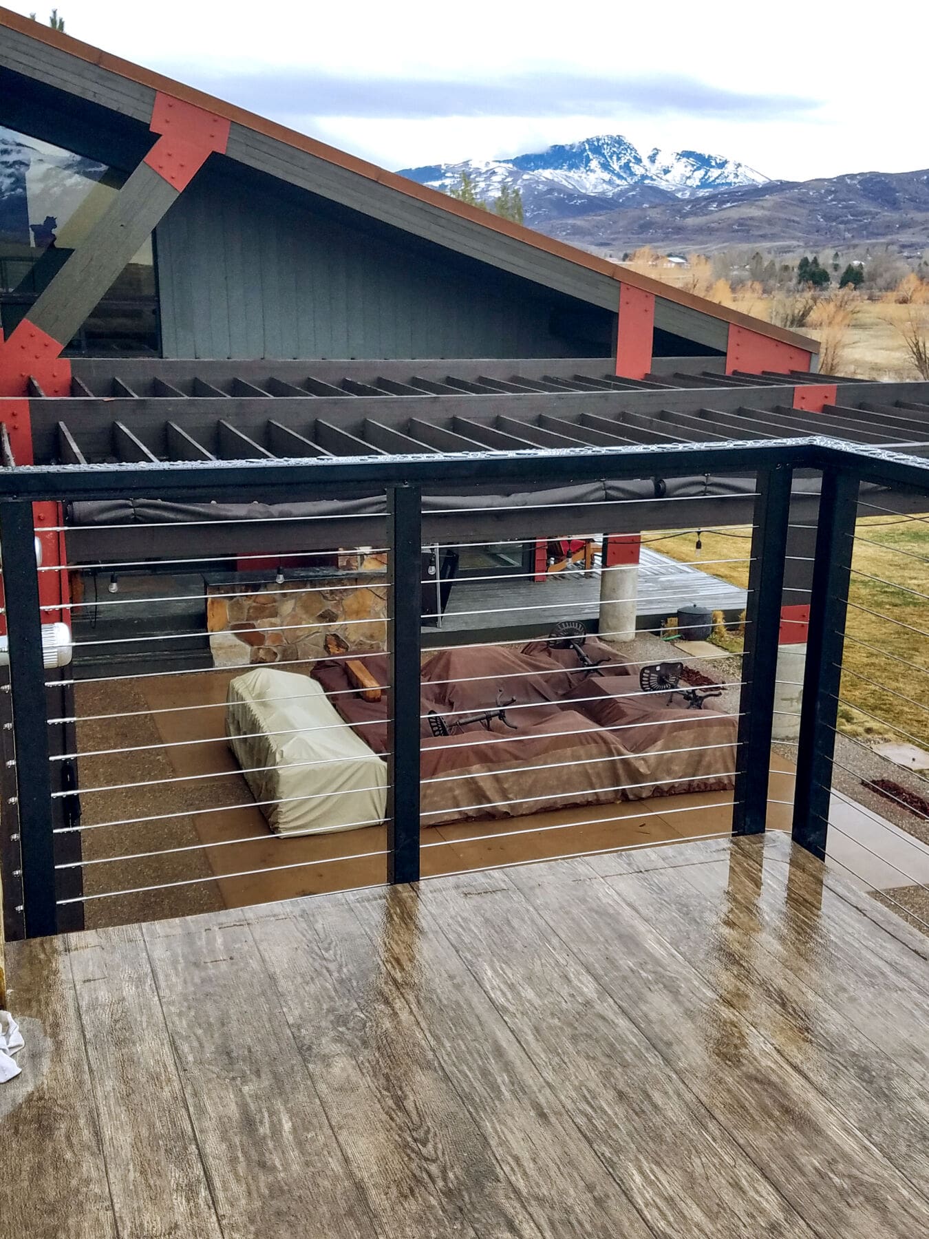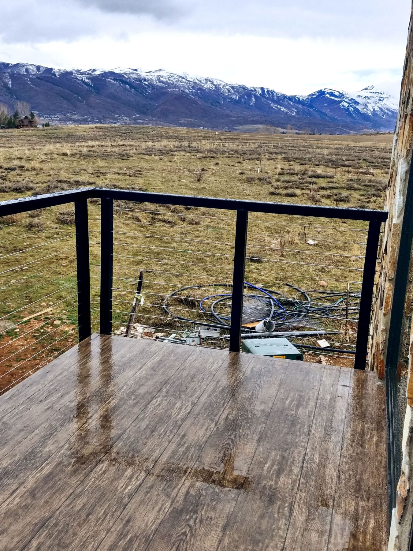 With such a stunning view of a Utah mountain range, this deck required a simple, open railing. Our fascia-mounted black aluminum cable railing keeps the view and surface area open, and works well aesthetically with the rich palette of this home's stone siding.