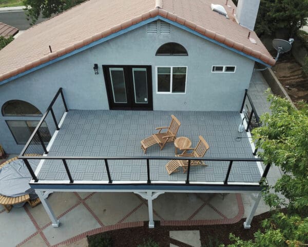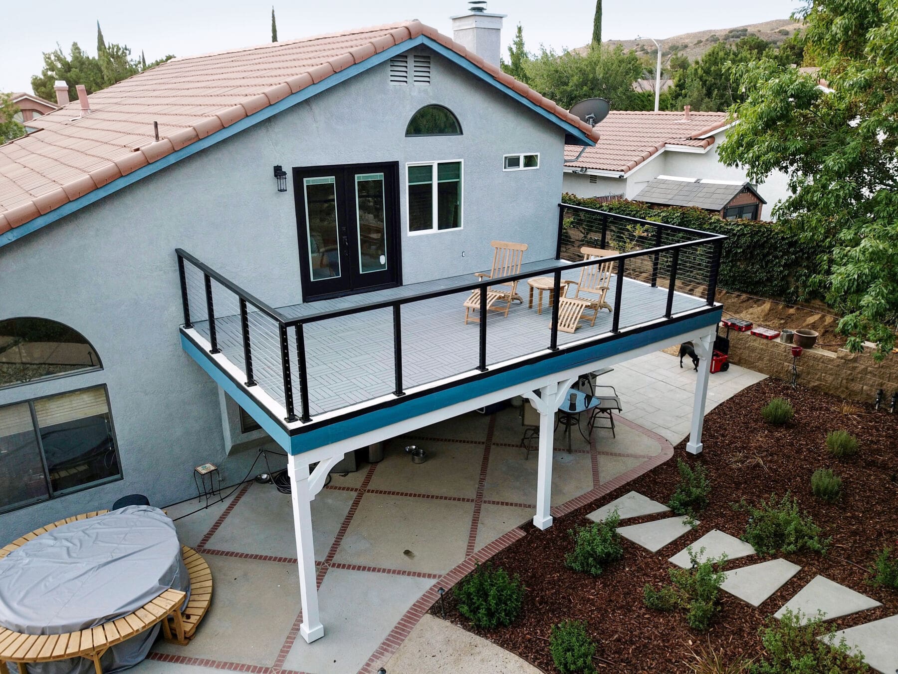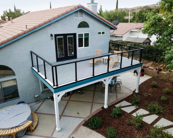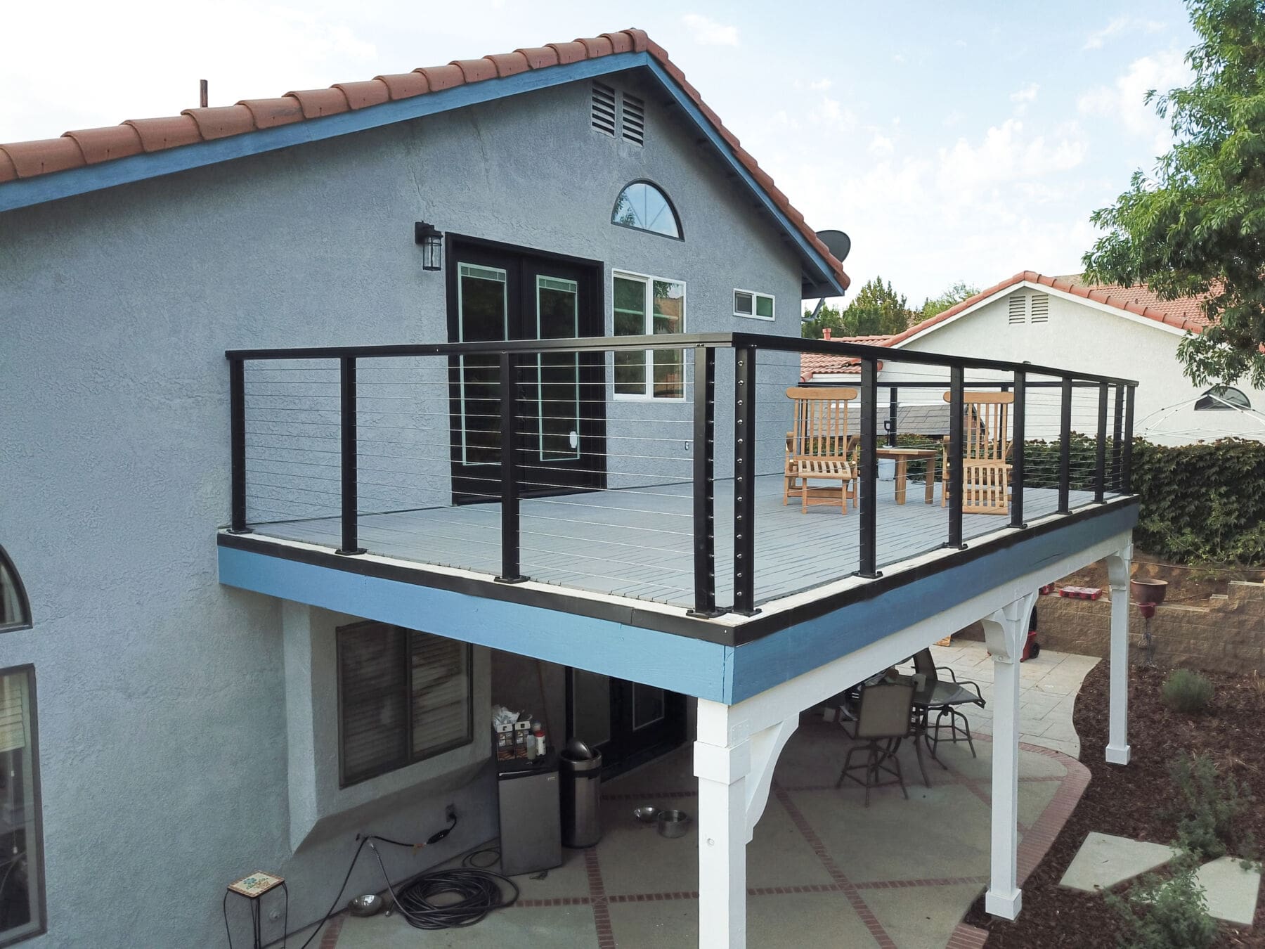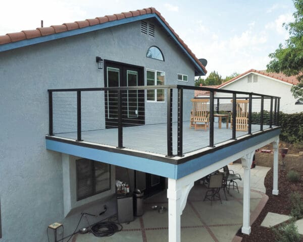 Black cable railing lines this perfect deck in Palmdale, California. The black goes great against the unique blue color of this house. Deck mounted posts mirror the vertical lines of the columns below, making the space seem unified and intentional.