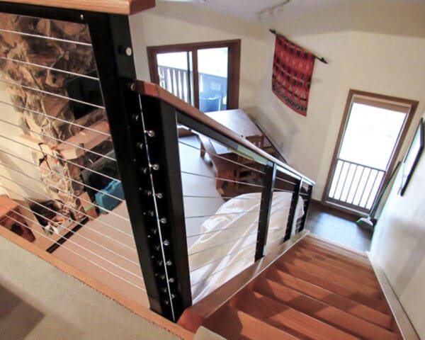 Black cable railing adds a contemporary flair to this southwestern cabin. The fascia-mount posts keep the stair and loft area open, while the black color contrasts nicely with the lighter, earthy palette of the space.