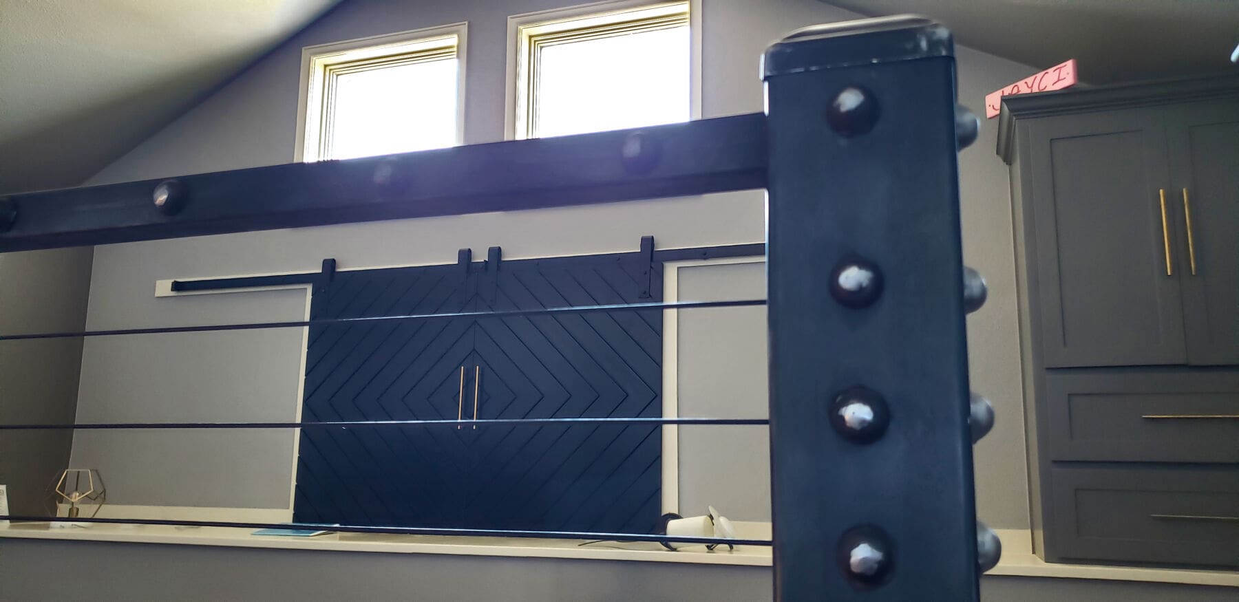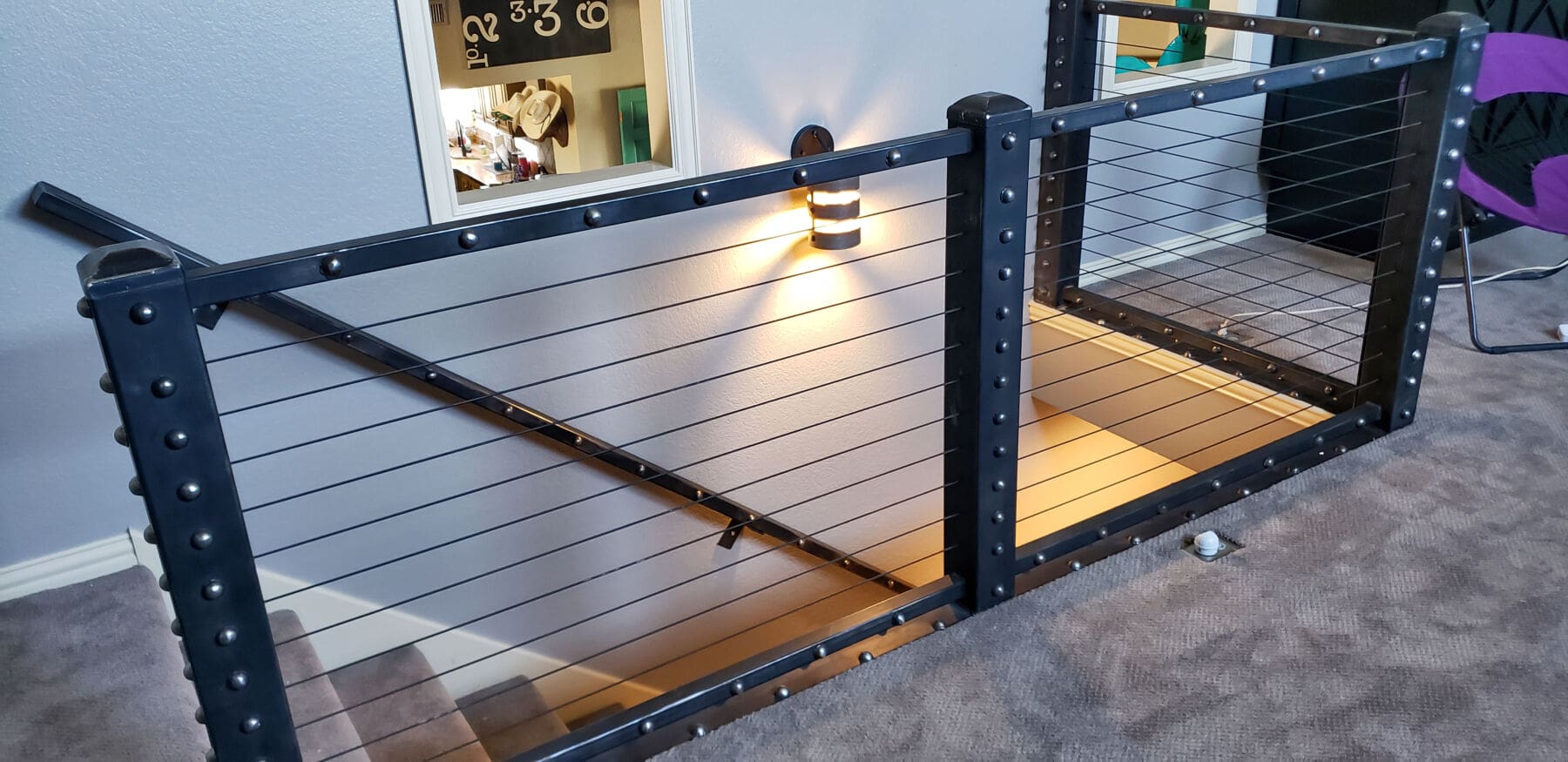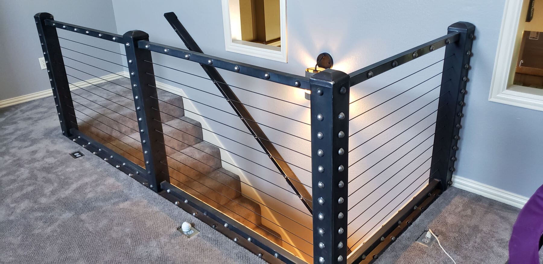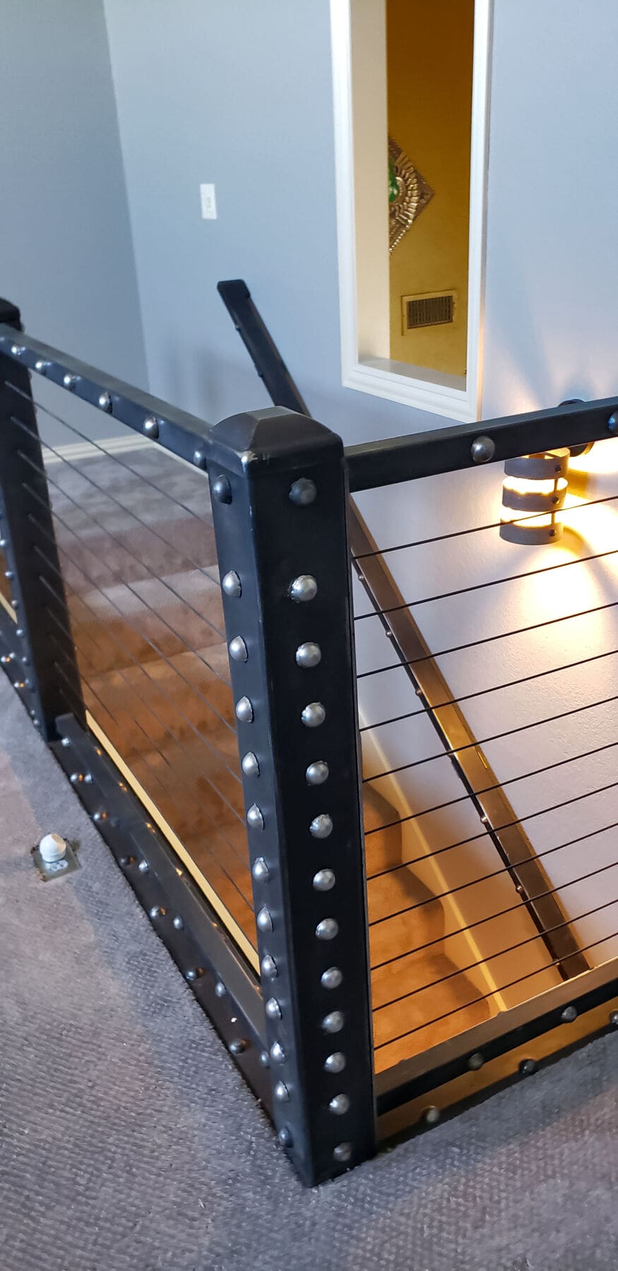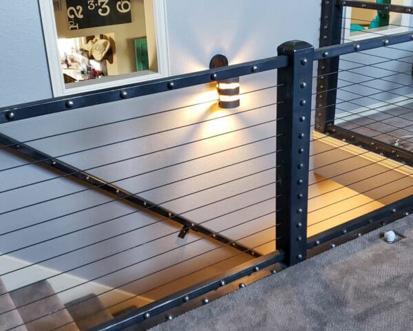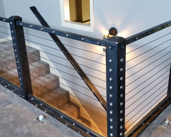 A dramatic railing crowns this staircase in Amarillo, TX. Black oxide cable infill matches the robust aesthetic of the industrial stair rail frame without making the end result bulky or obstructive.