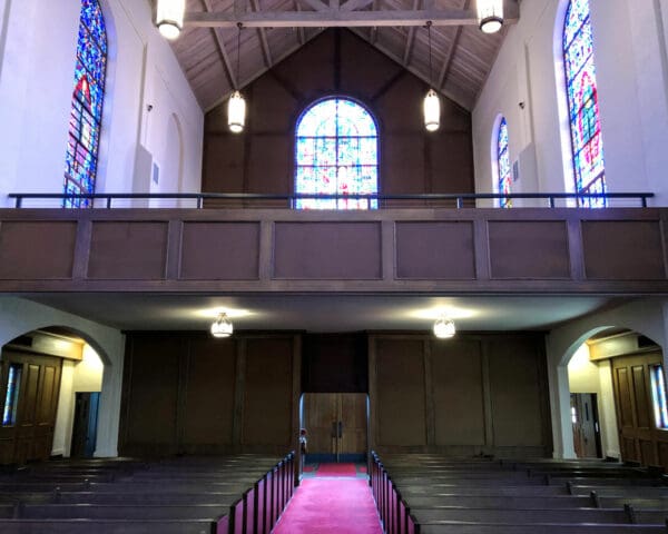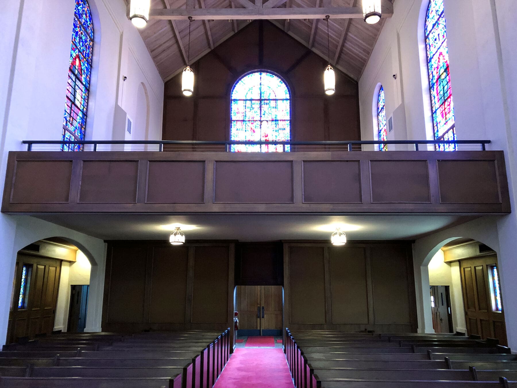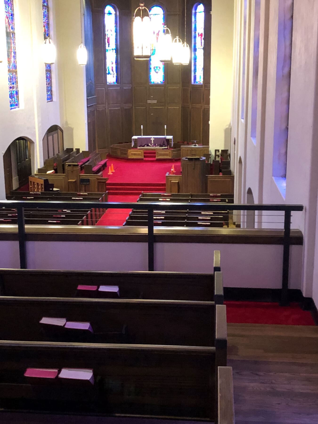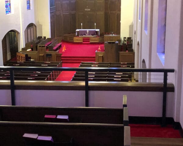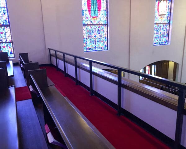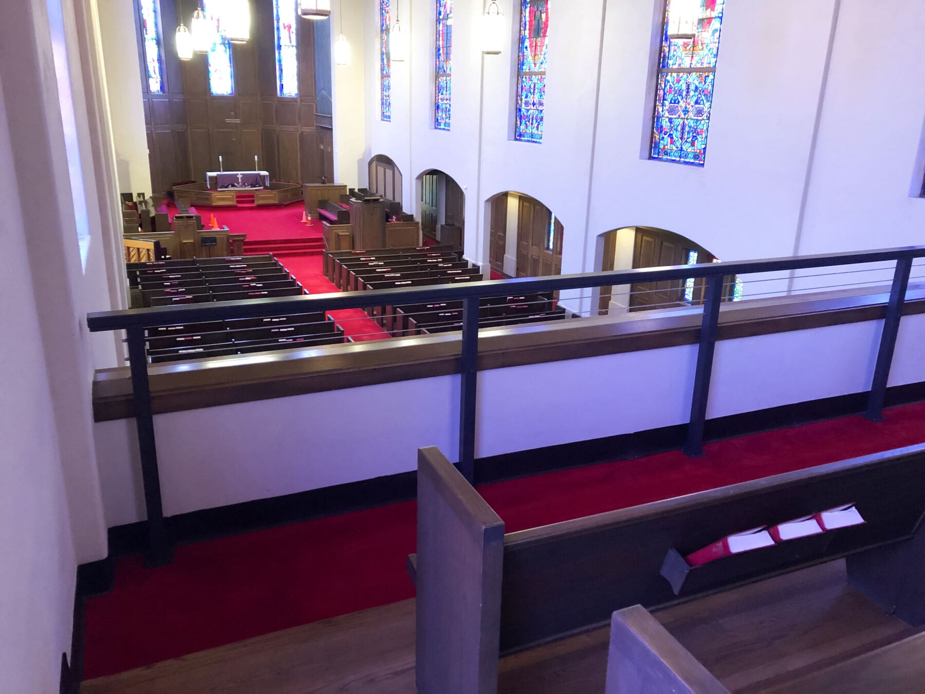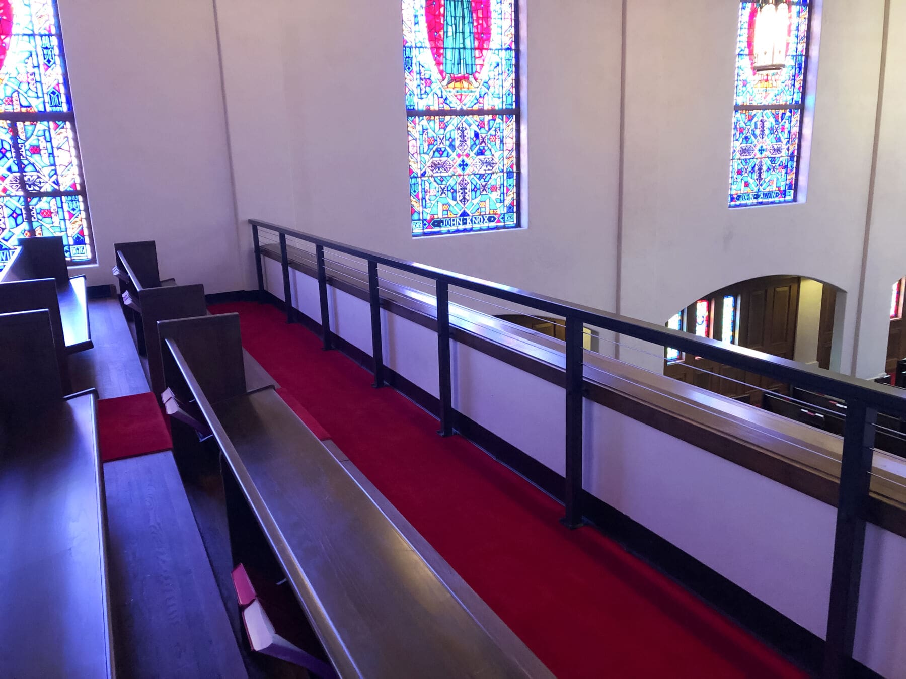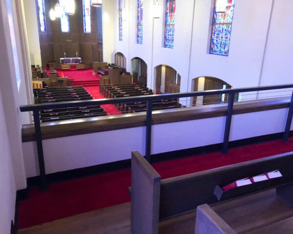 Local building code changes required this church in Georgetown, TX to increase the height of the balcony guardrail. Instead of making the solid guardrail taller, impeding church-goers' views of the service bellow, the owners chose an open cable railing design.