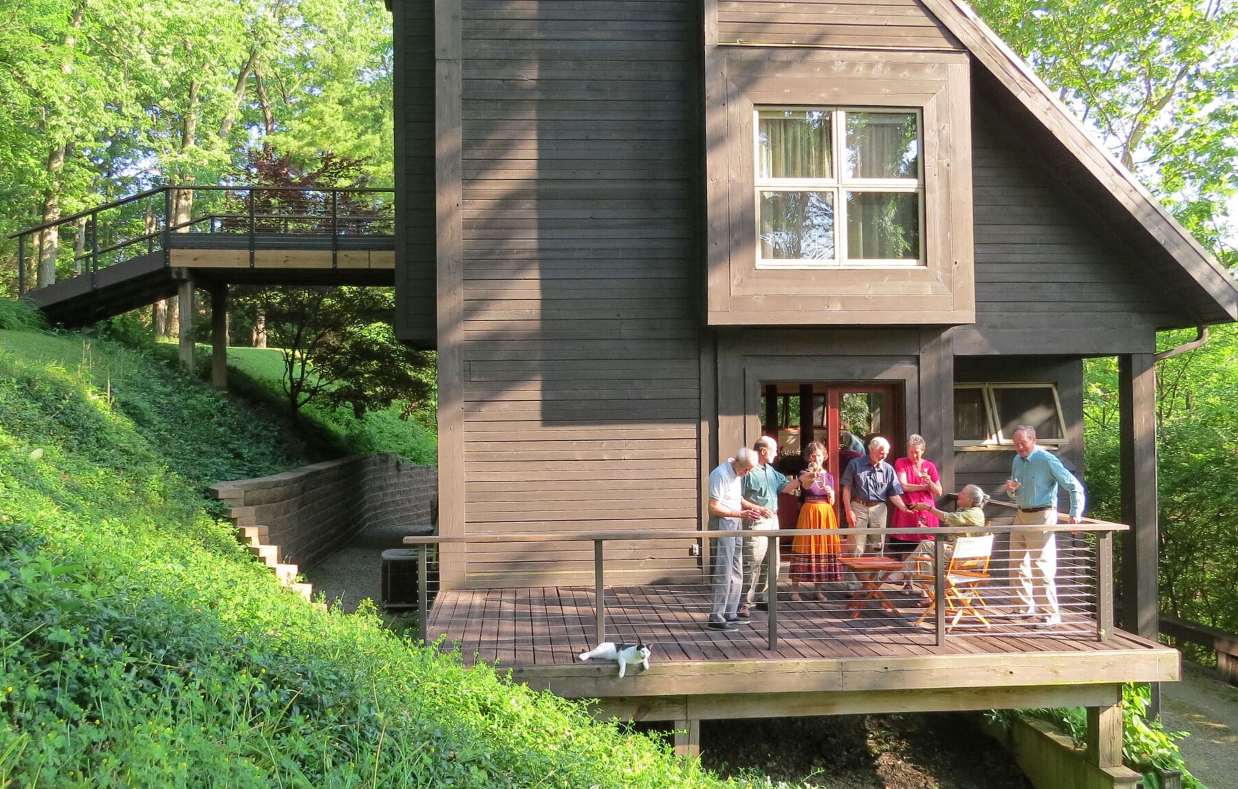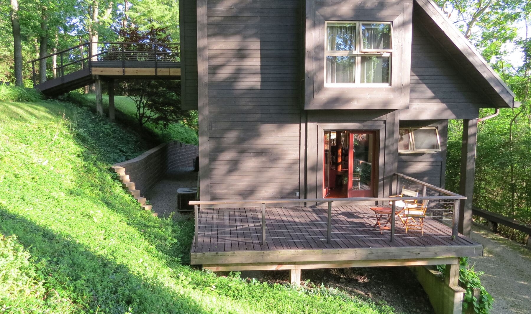 The style and color of our railing blends beautifully with the earthy tones and wood plank siding of this forested house in the hills of Ohio.