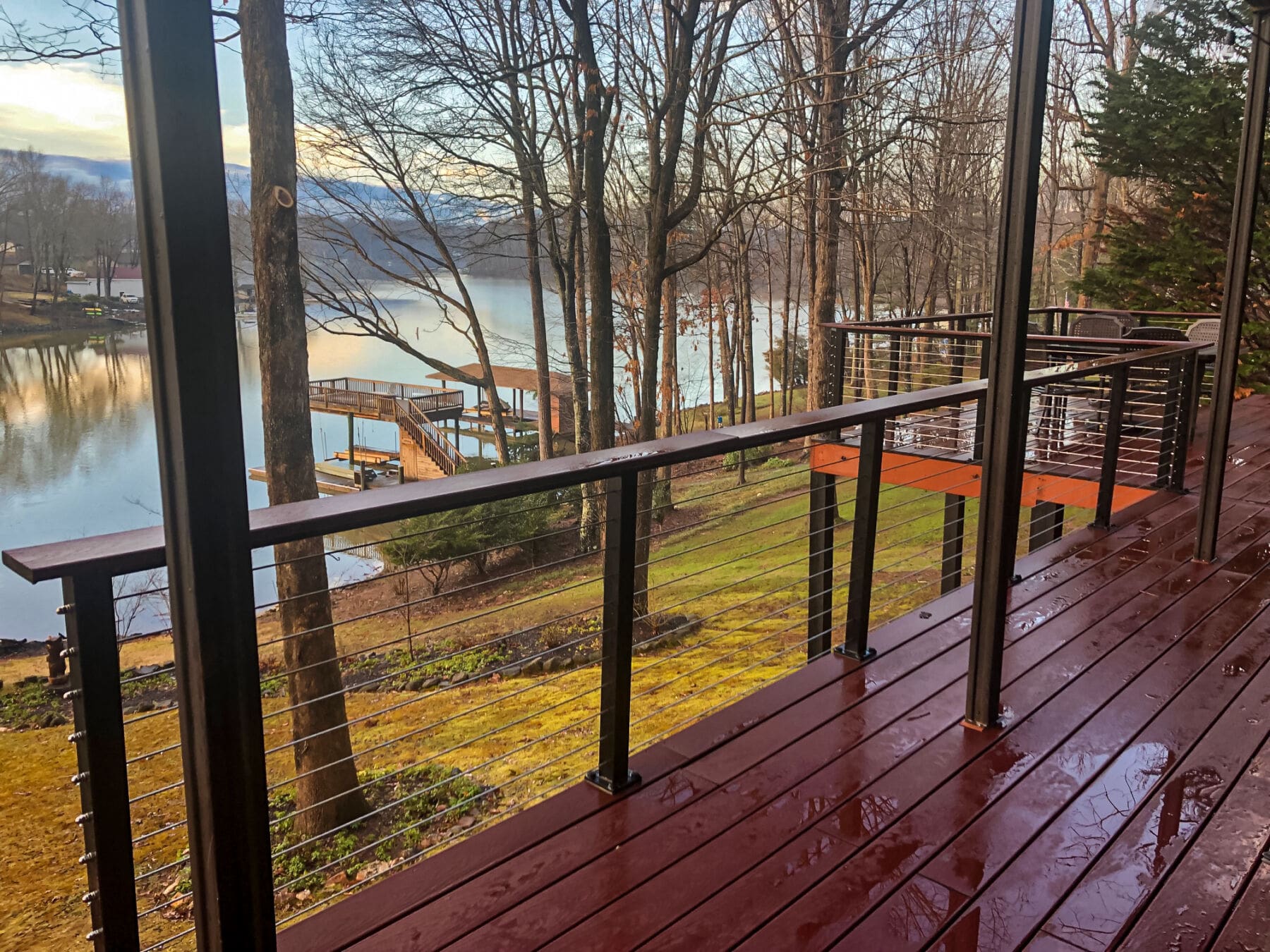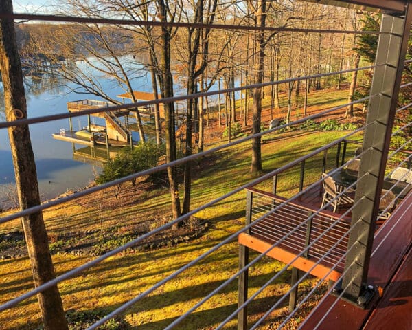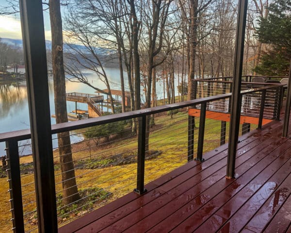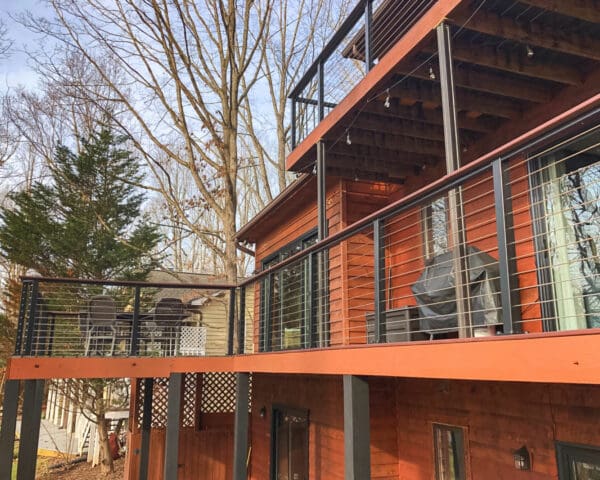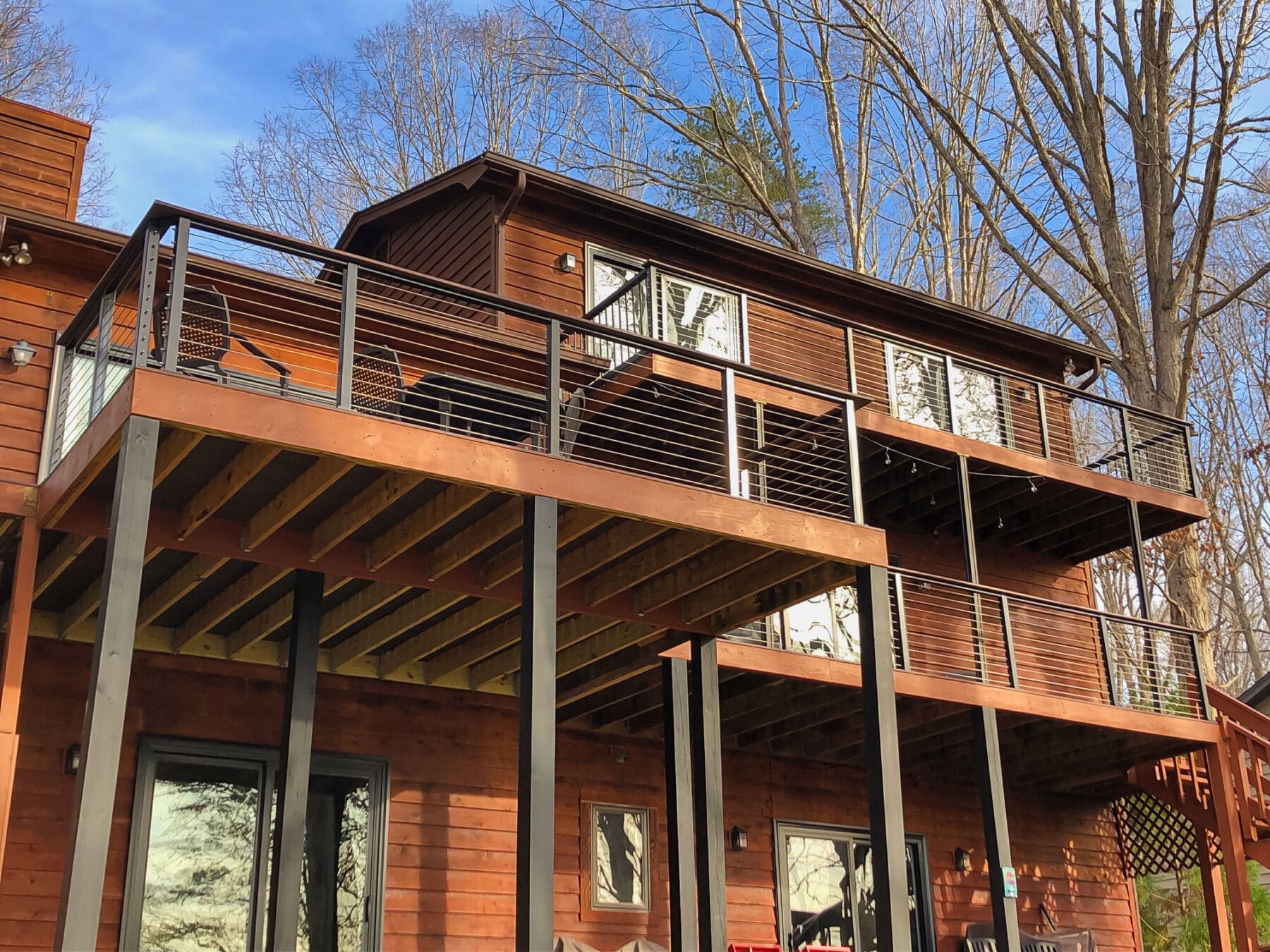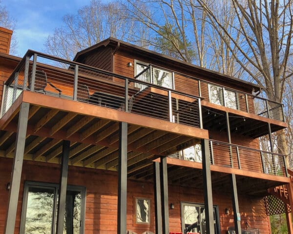 Overlooking the river, these multi-level decks demanded an open railing. Bronze aluminum and wood cable railing preserves the view while adding the perfect rustic touch.