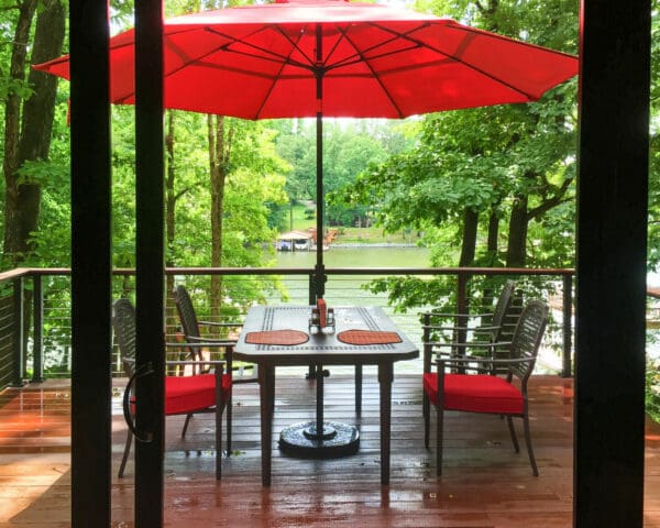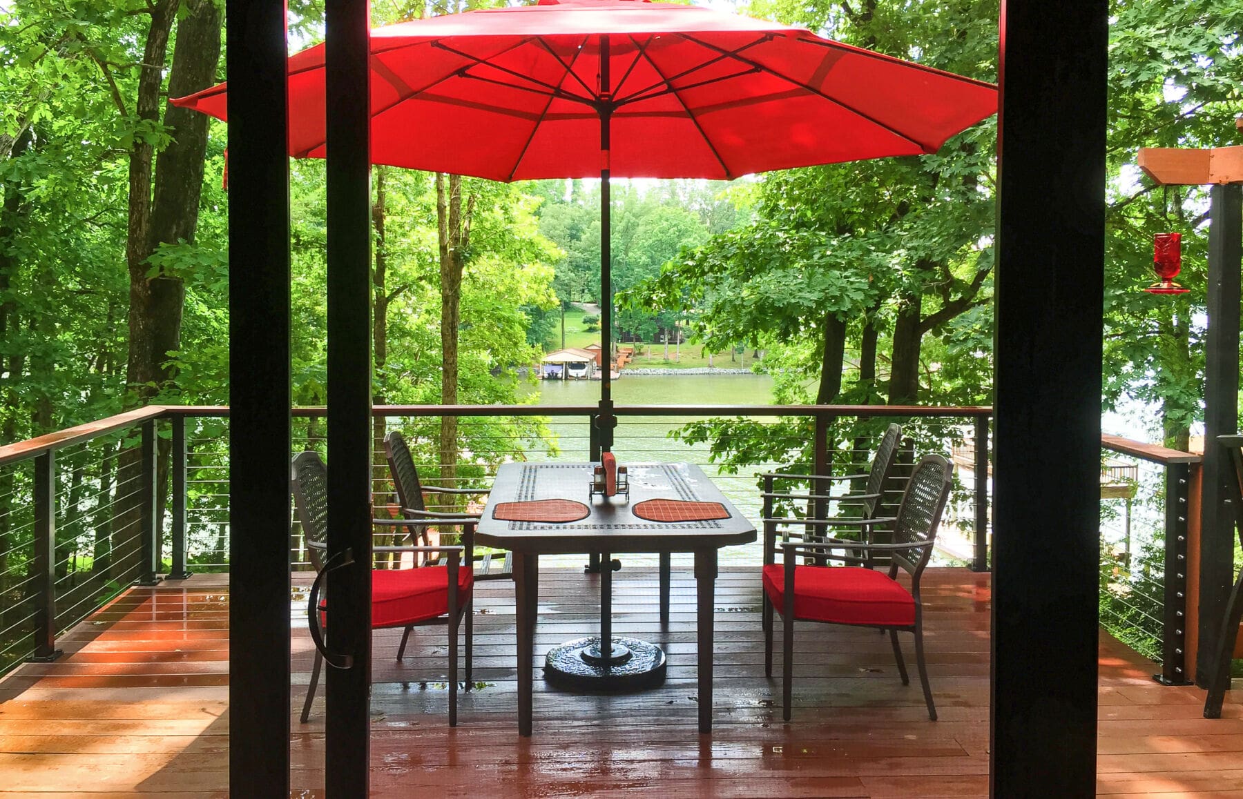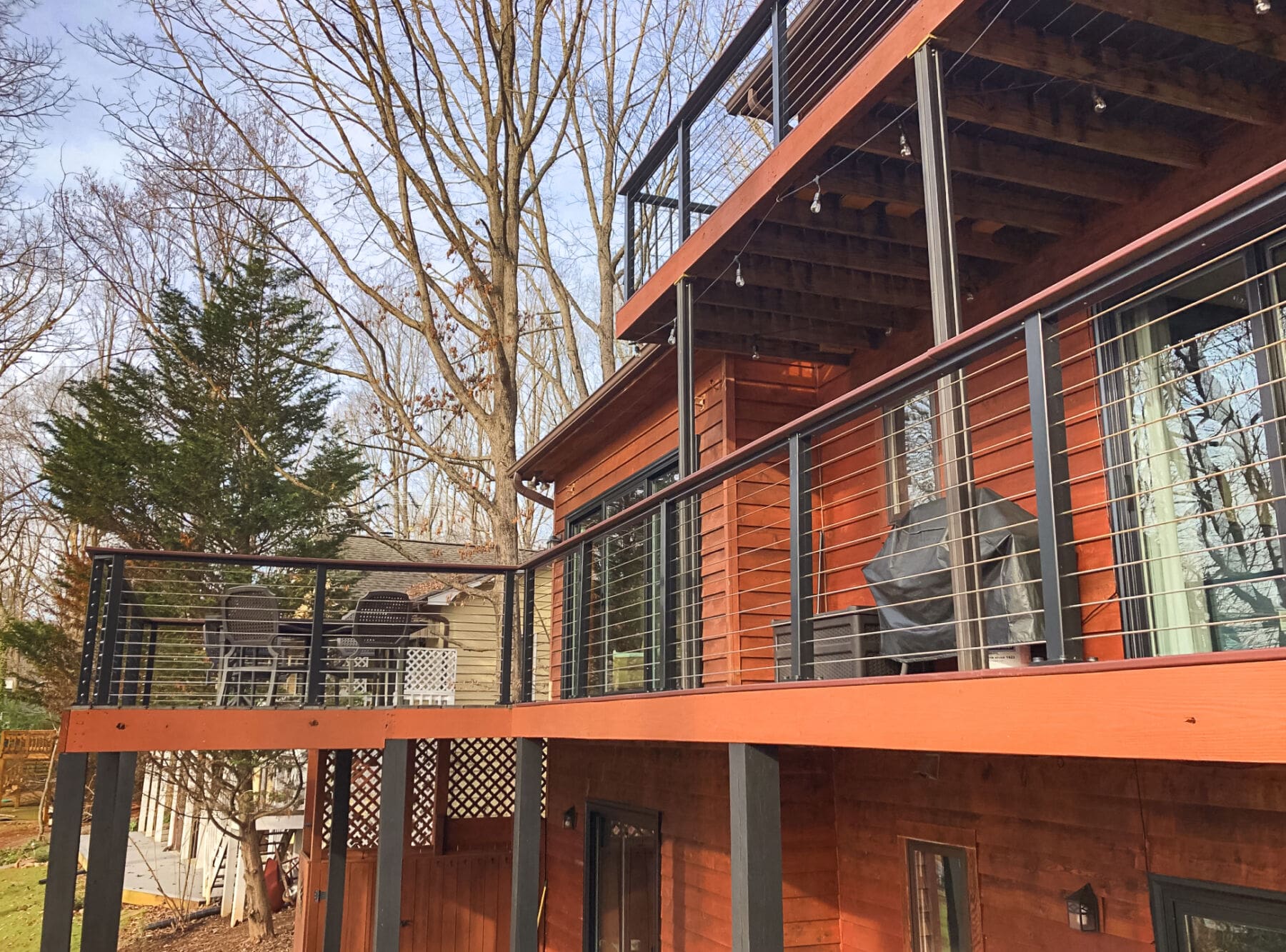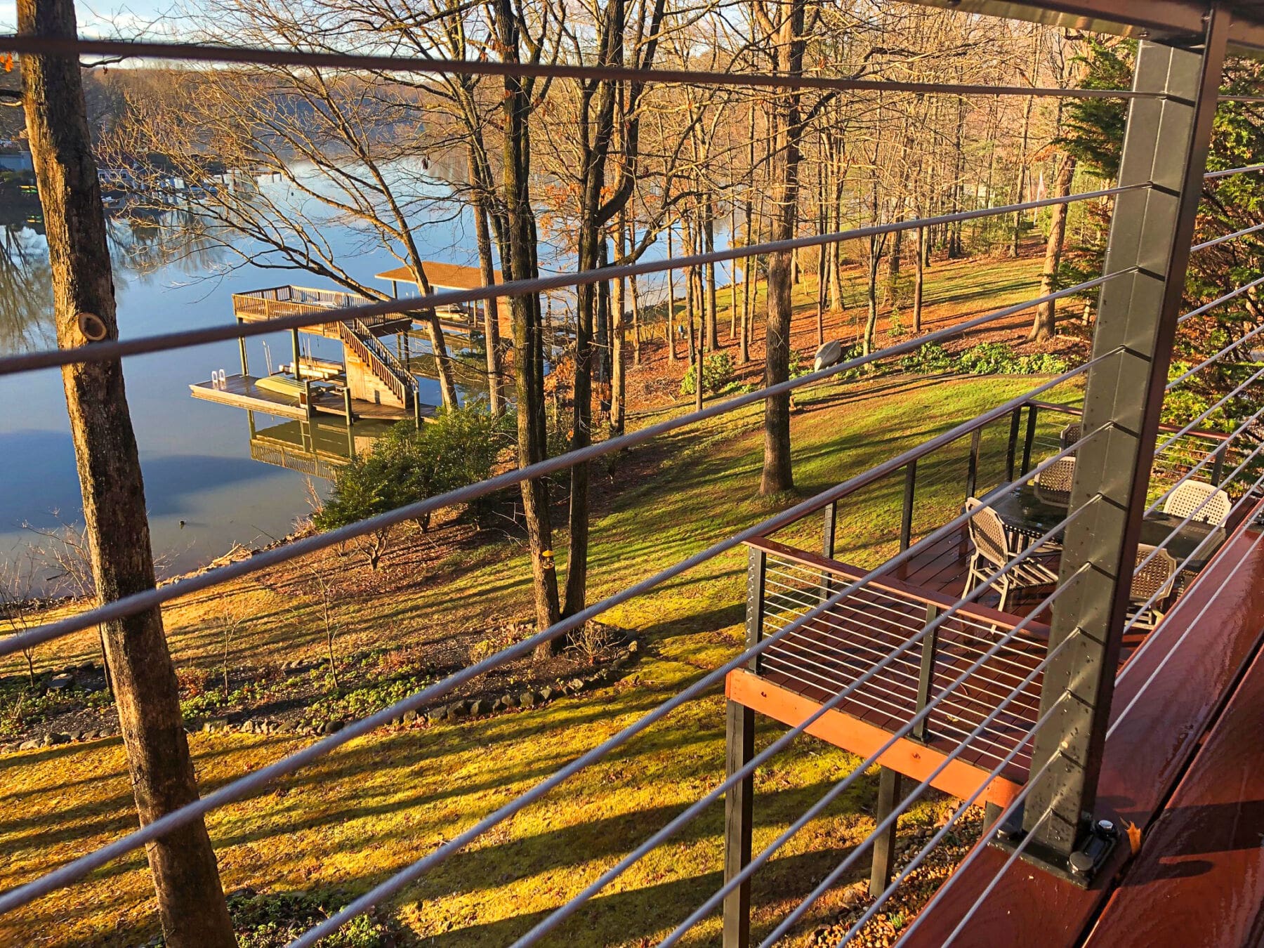 Overlooking the river, these multi-level decks demanded an open railing. Bronze aluminum and wood cable railing preserves the view while adding the perfect rustic touch.