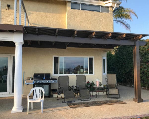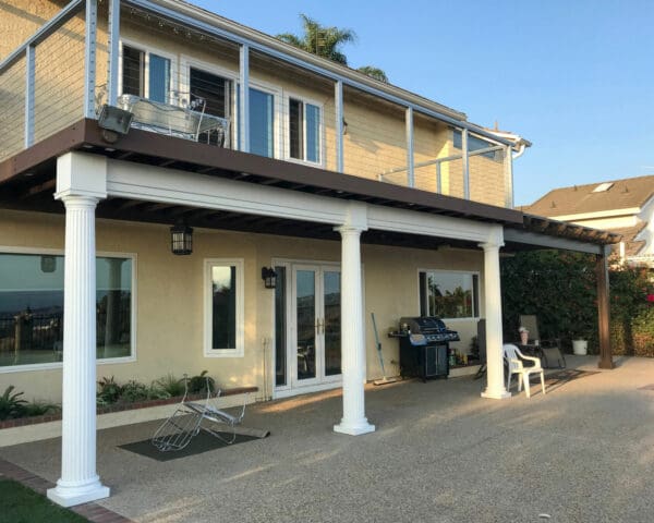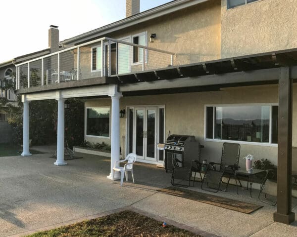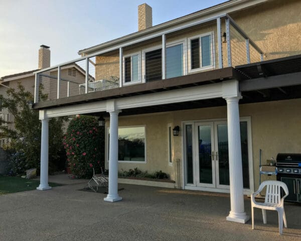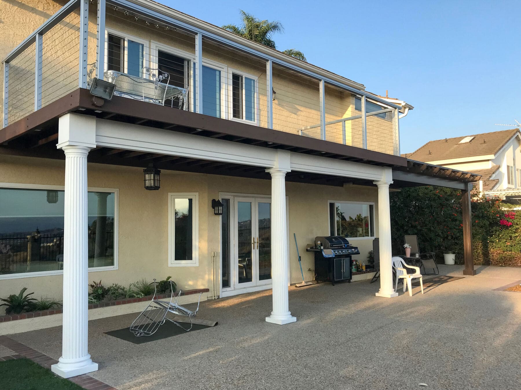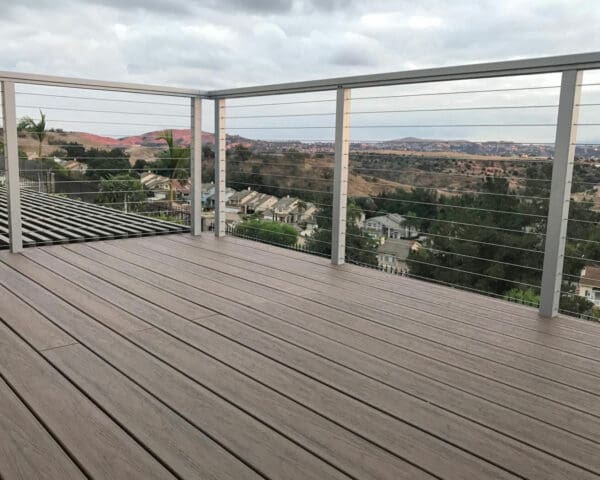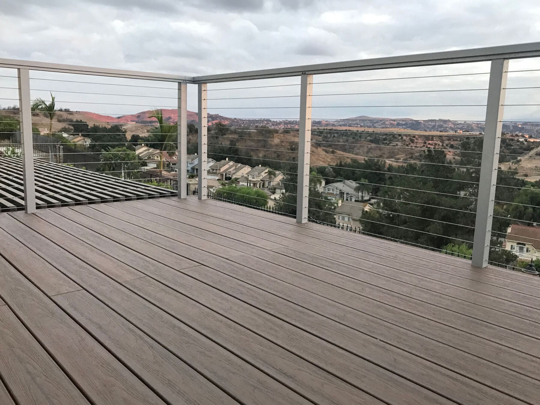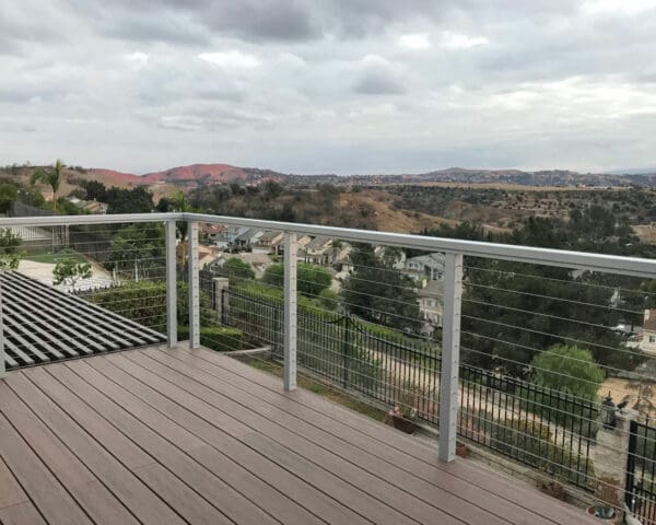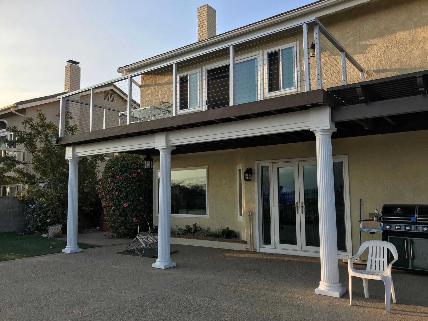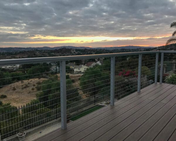 Natural metallic aluminum reflects the blue skies and creamy stucco of this property in Brea, CA. Perched over a backyard barbeque area with a view of the hilly landscape below, this deck was in need of an open, modern safety solution that blended with the classic elegance of the columned house.
