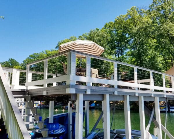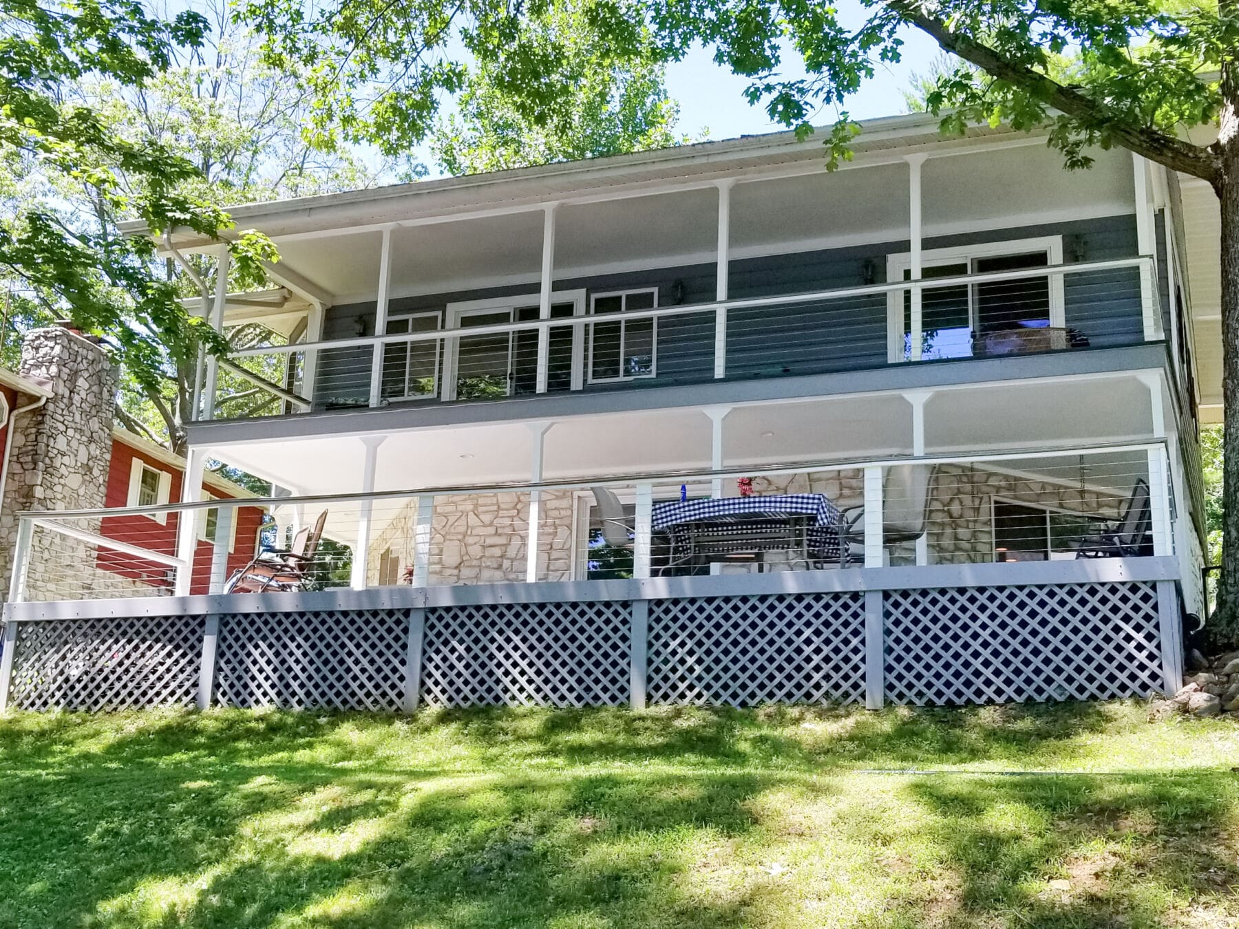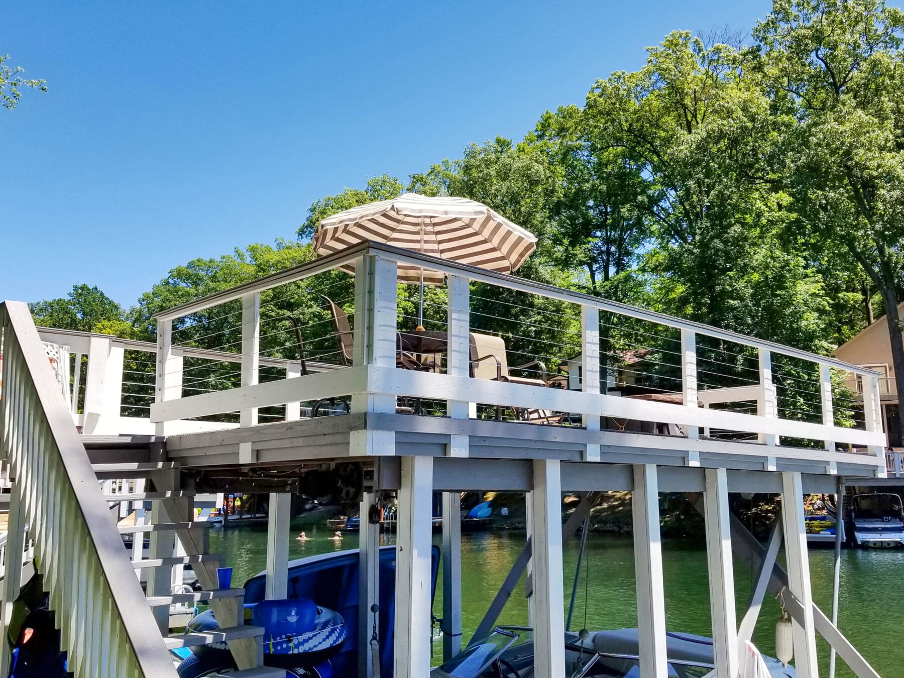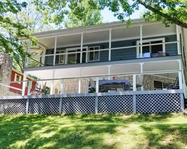 Our stainless steel cable and fittings fill in this simple painted frame on the back decks of a waterside home in Bloomington, IN.
