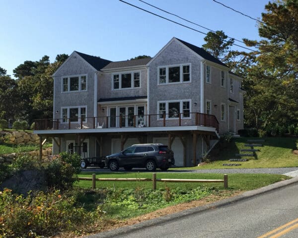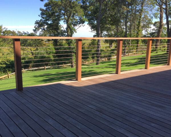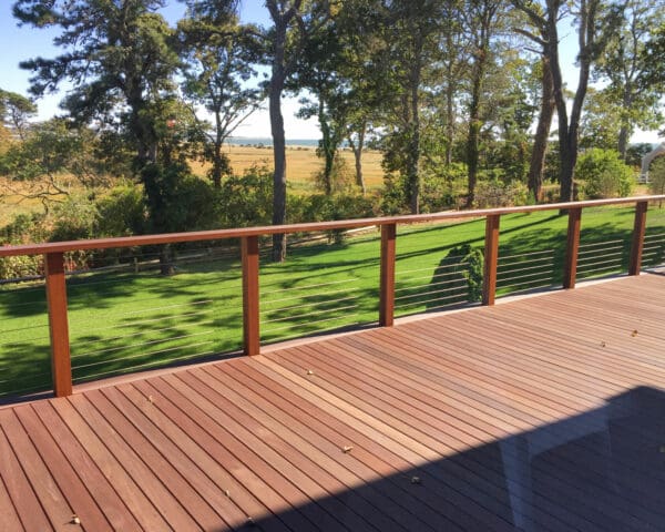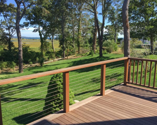 The view from this long deck overlooking the landscape of Chatham, MA is so tempting, even the wildlife can't help but lounge and enjoy. A simple wood cable railing blurs the boundaries between home and nature while providing necessary safety for all guests, including furry ones!