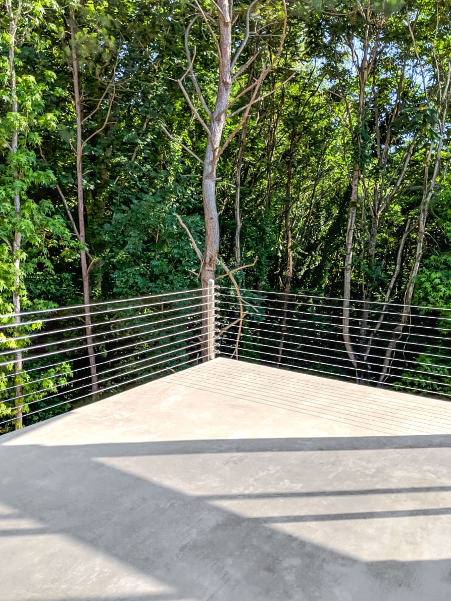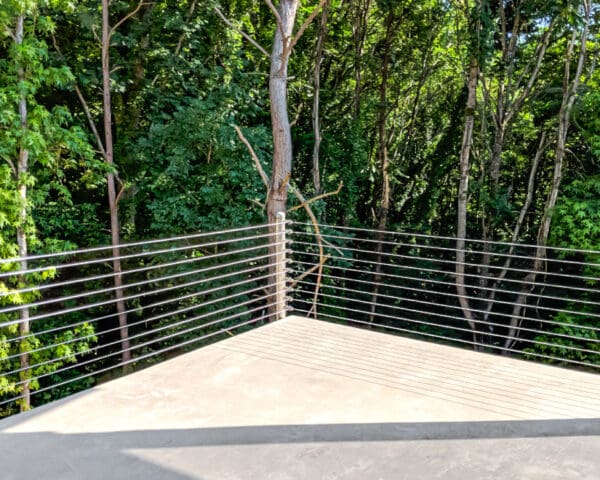This concrete elevated patio feels open to the elements thanks to cable infill and fascia-mounted posts.
