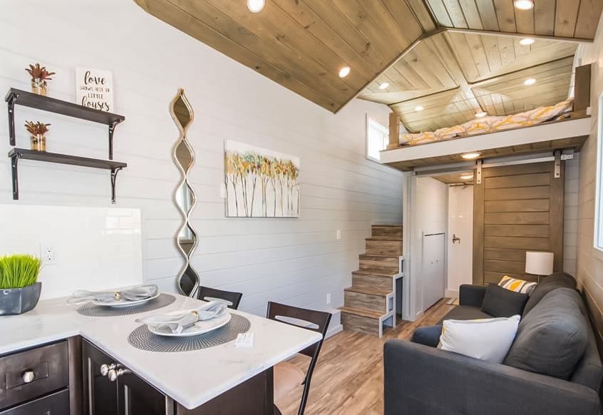 Exuding sophistication and simplicity, this micro home in Longwood, FL features a small loft area for the bed. Not wanting the sleeping area to feel too closed off from the rest of the space, the designers used thick wood posts with reinforced mounting frames and our stainless steel cables and fittings to create a guardrail that keeps the loft as open as possible.