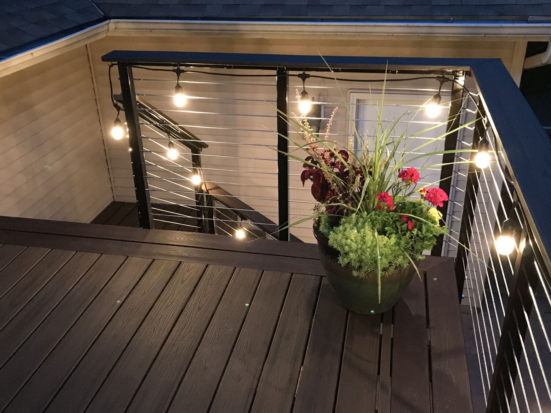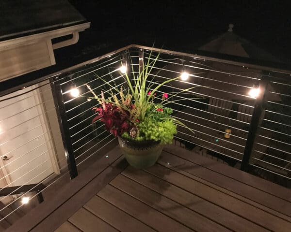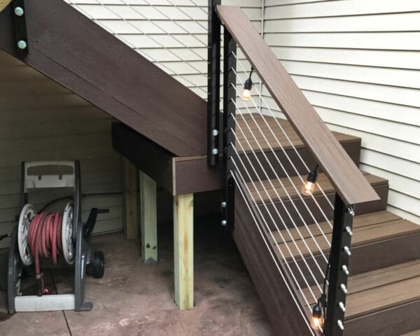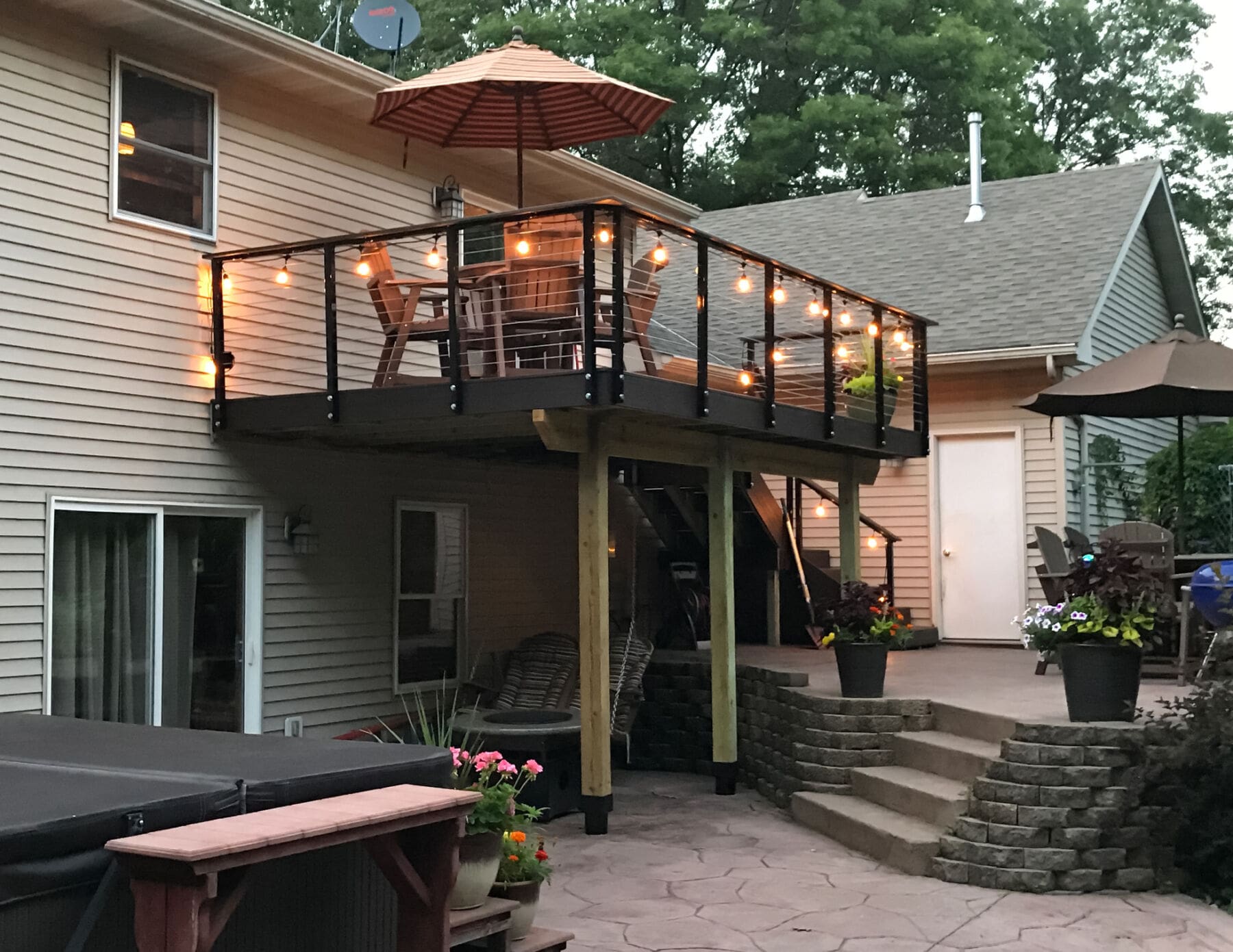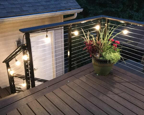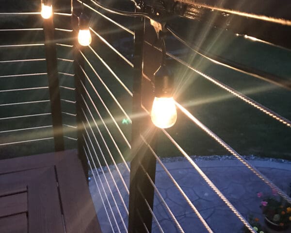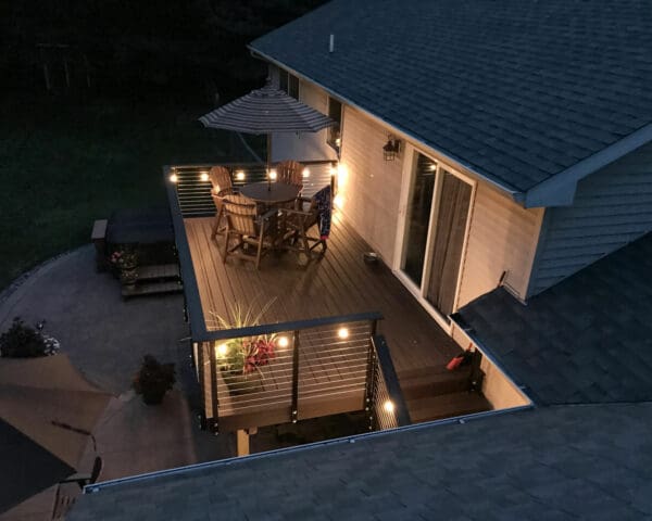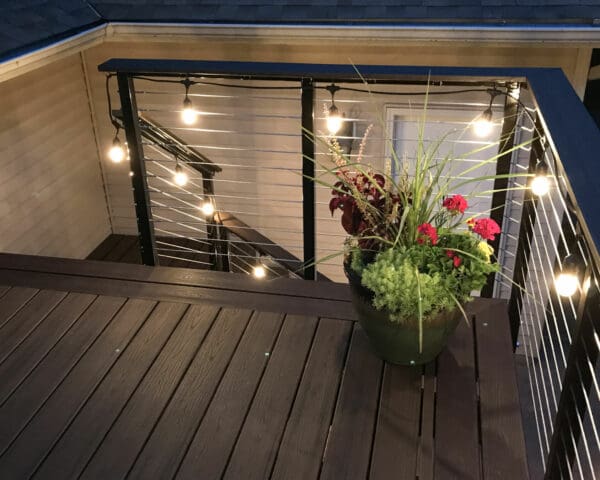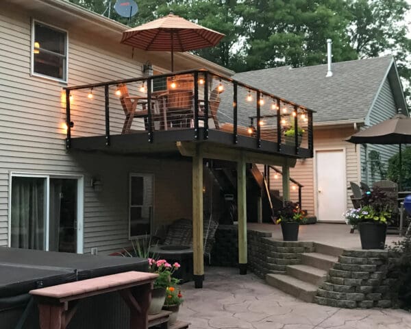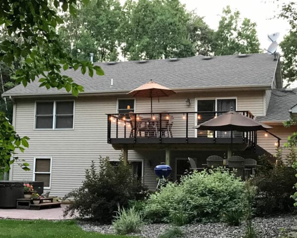 For this upper story deck in Princeton, Minnesota cable railing hardware was used. Cable railing allows the owners to enjoy the view of the yard.