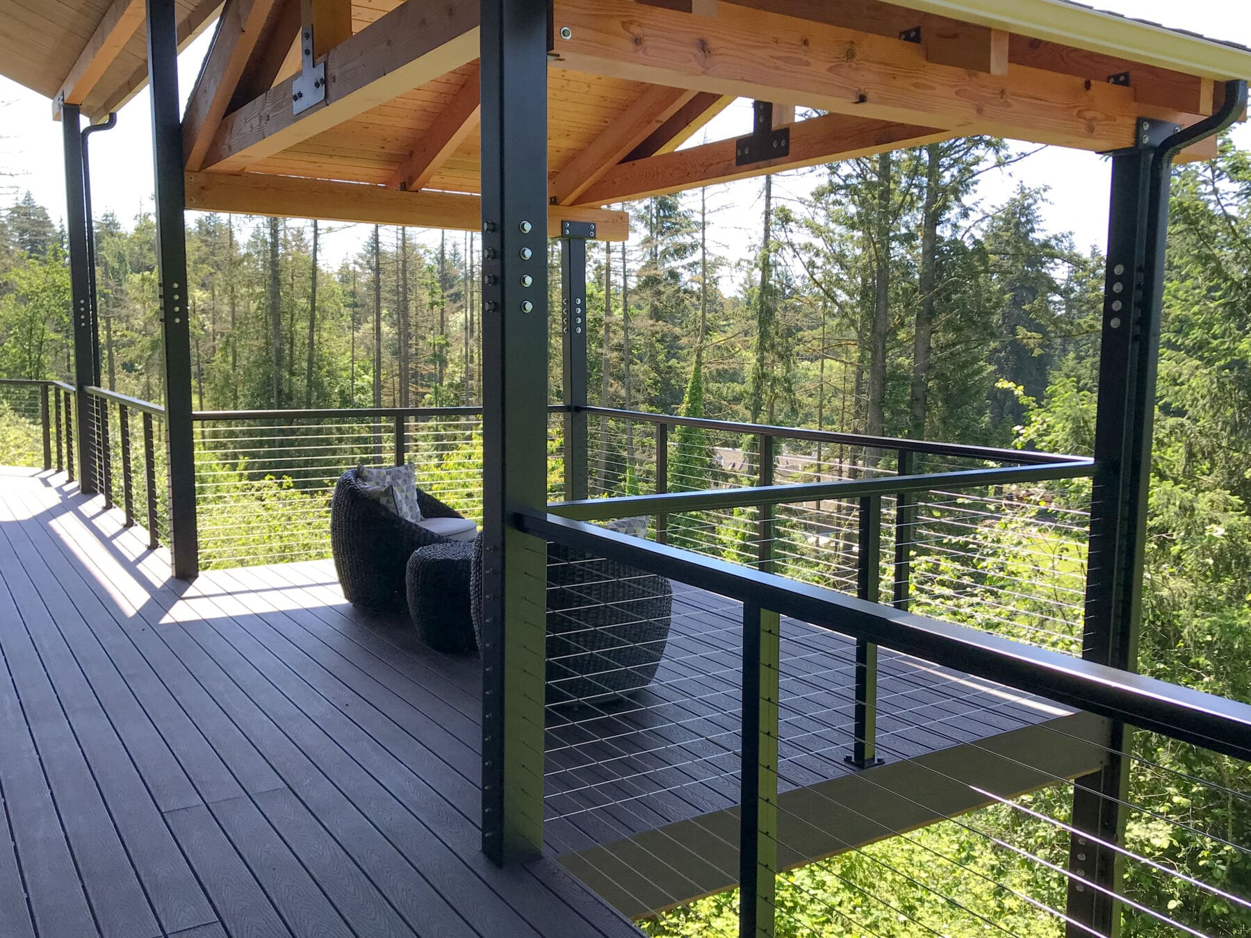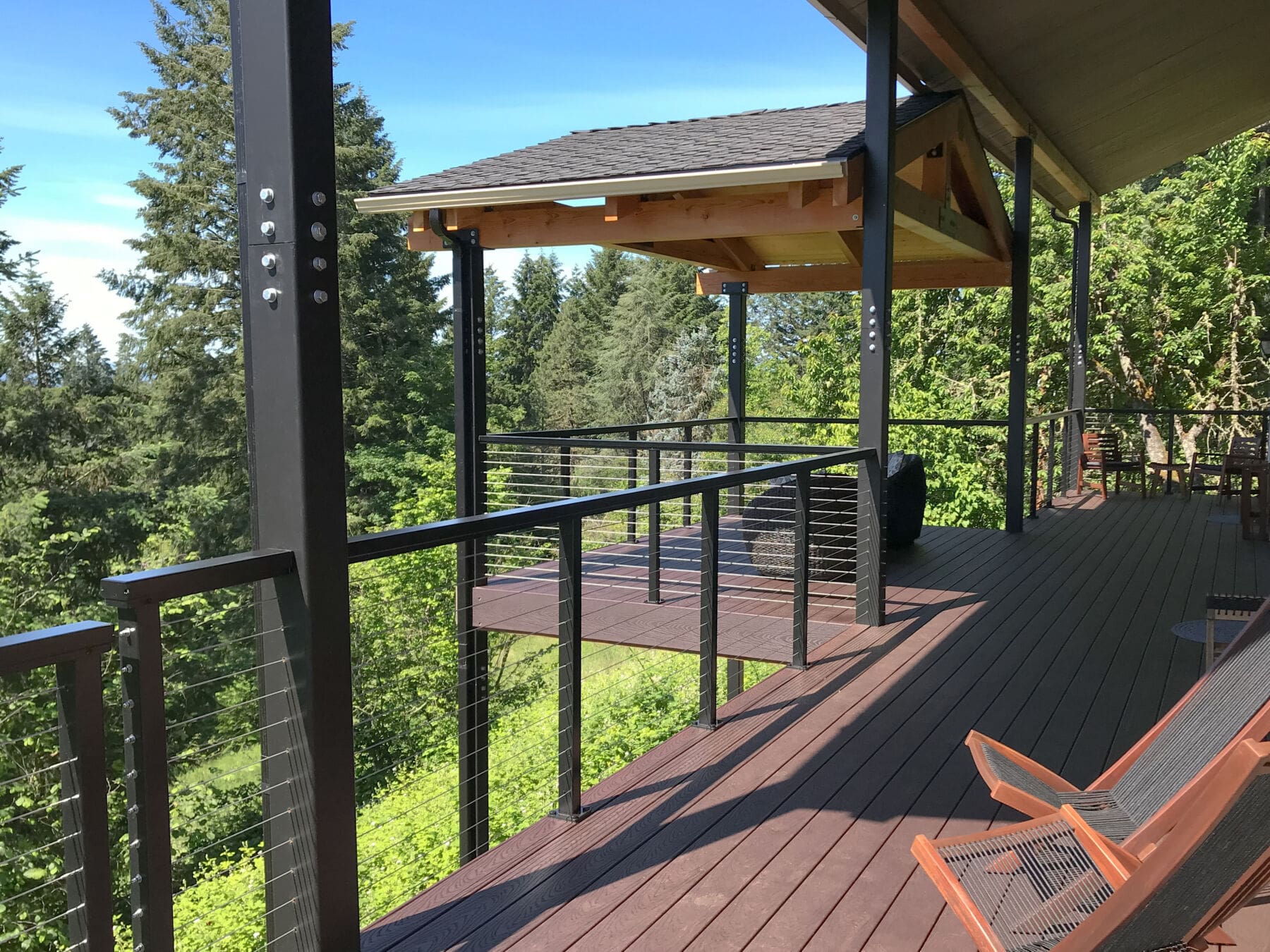 Overlooking a sea of forests, this expansive deck proudly offers unimpeded scenic views of Pacific Northwest greenery. Black aluminum cable railing matches the painted beams of the covered seating area, offering elegant and cohesive safety.