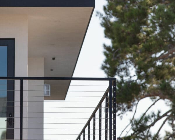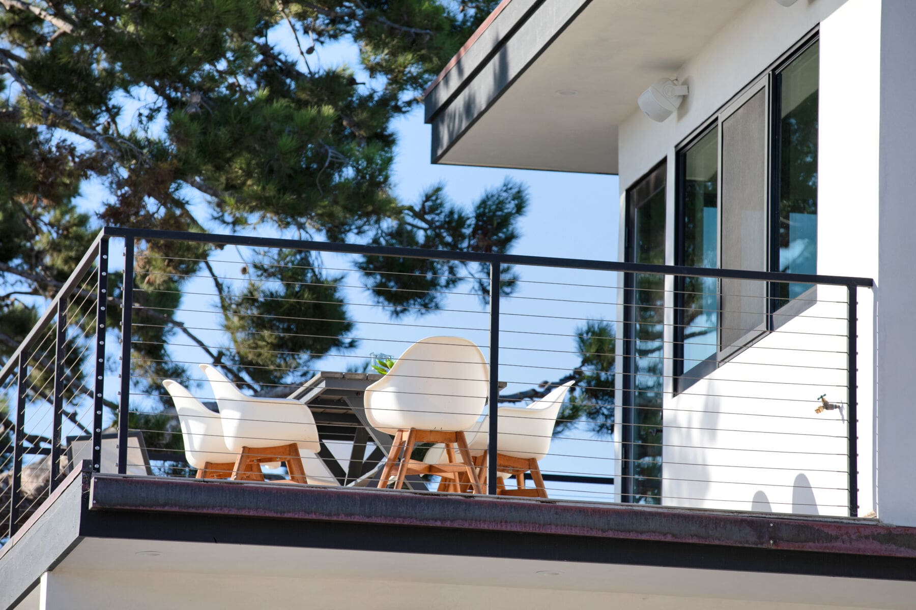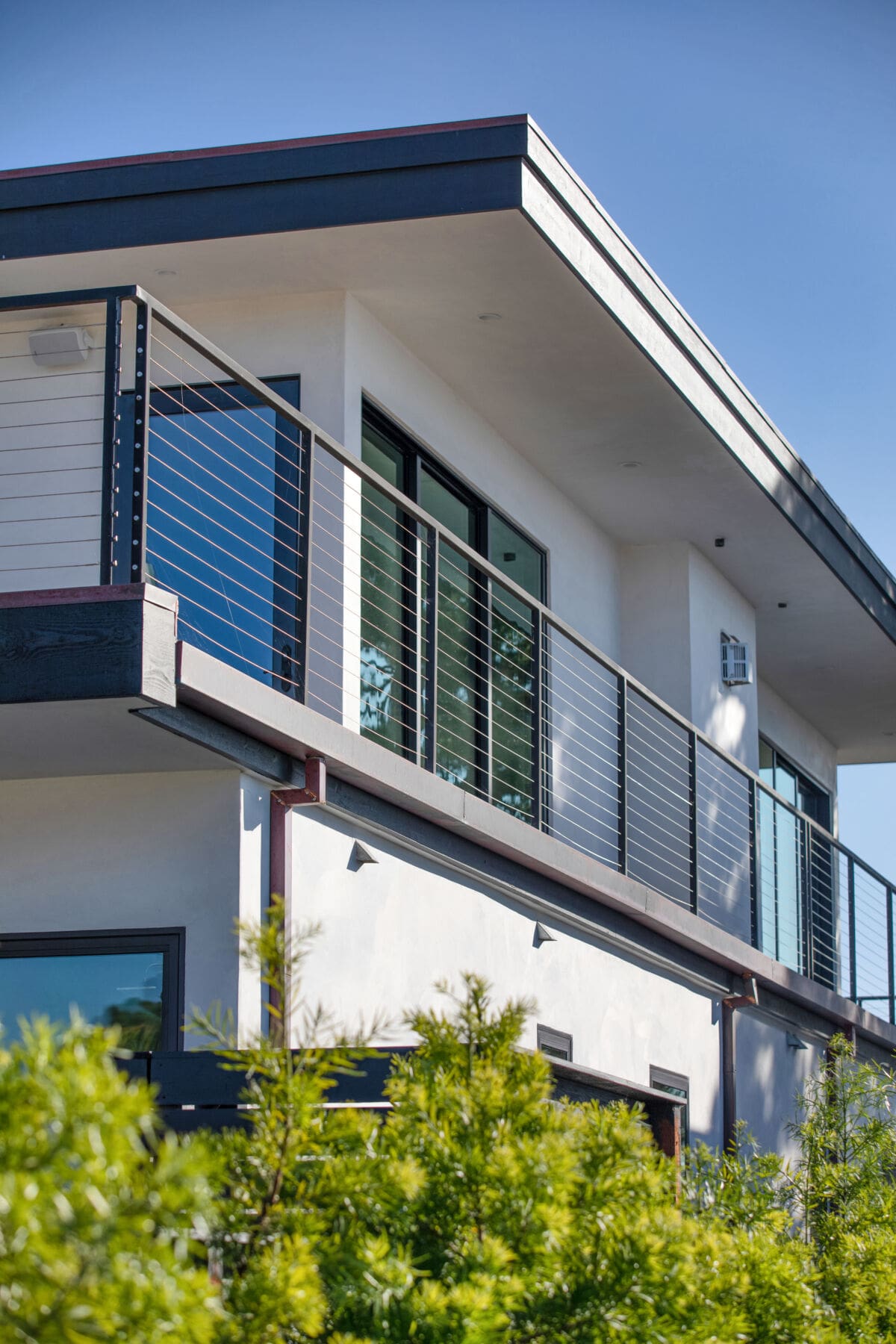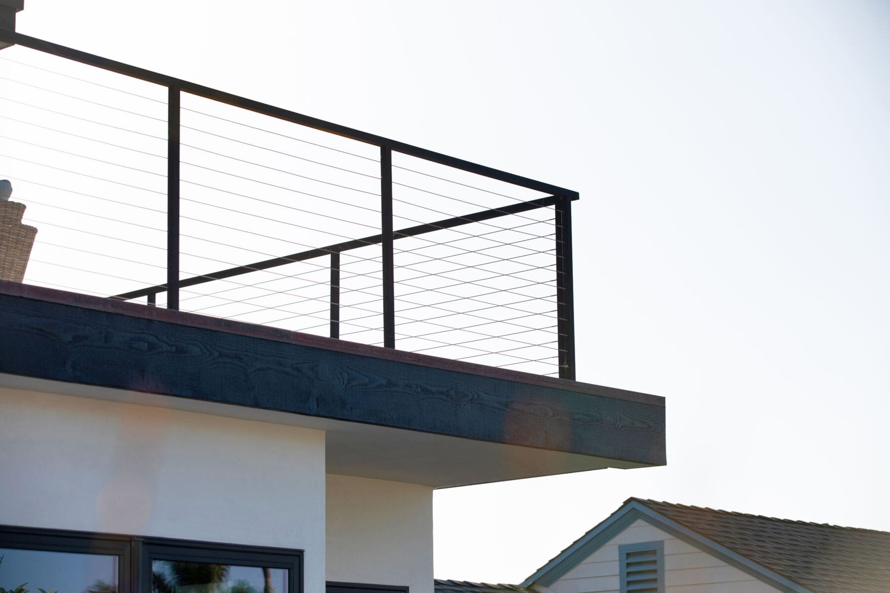 Stainless steel cable and fittings fill in this thin, welded metal railing frame, adding safety without obstructing the view from a wrapping second-story deck.