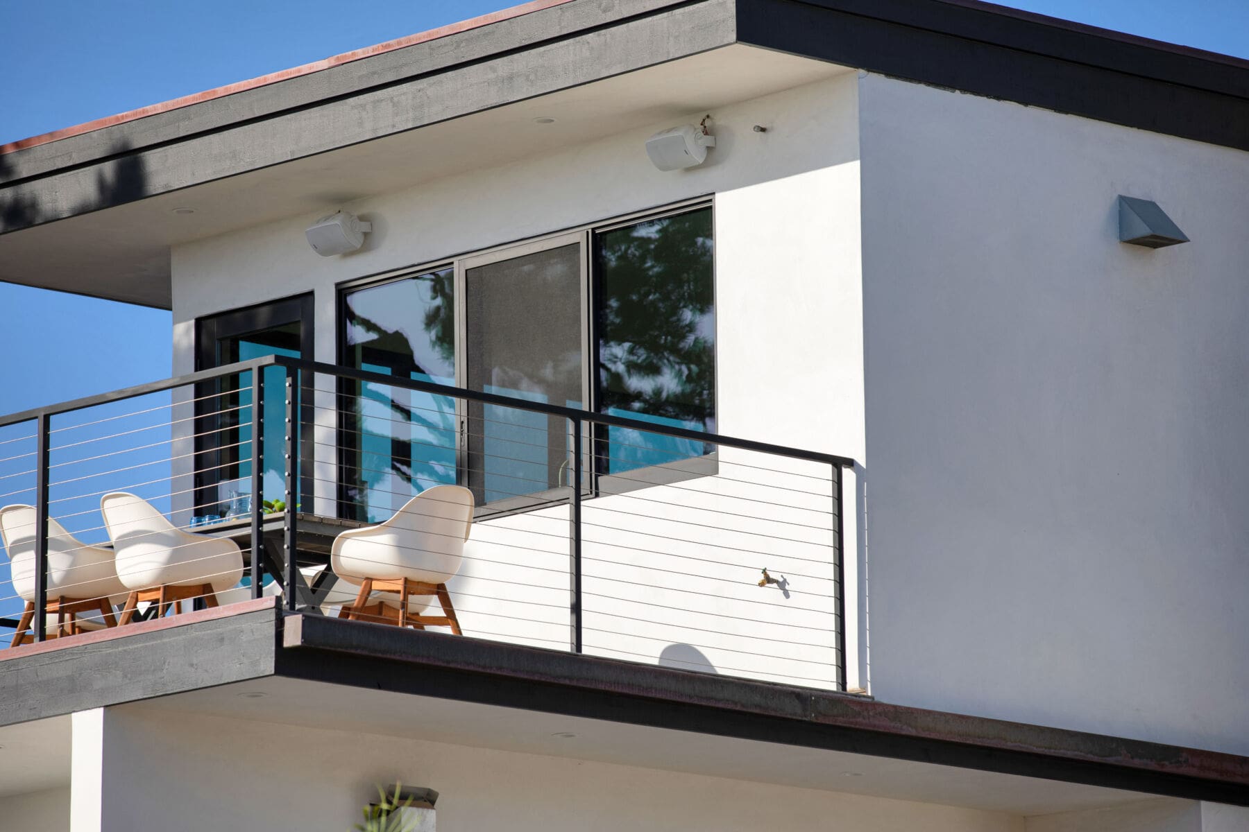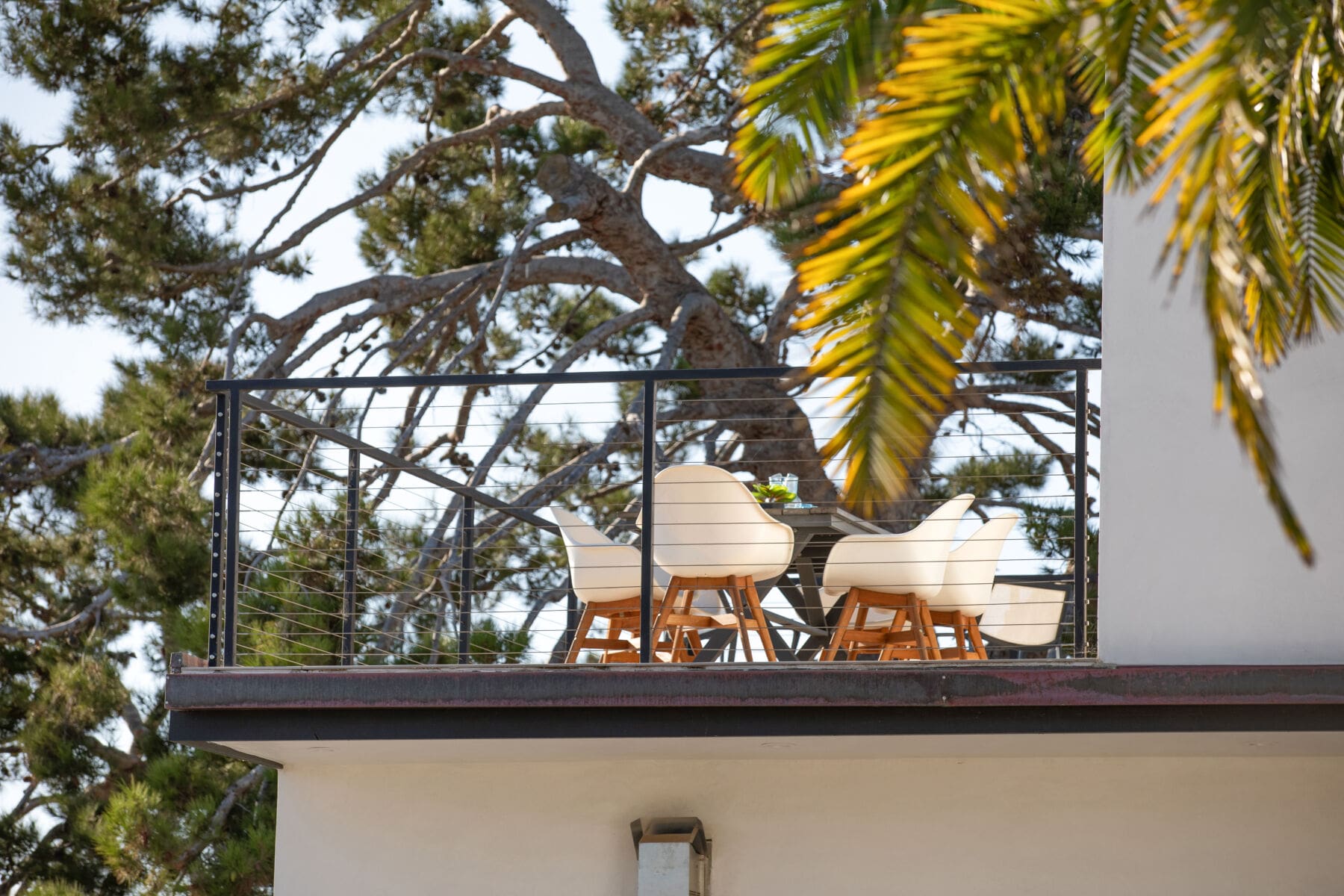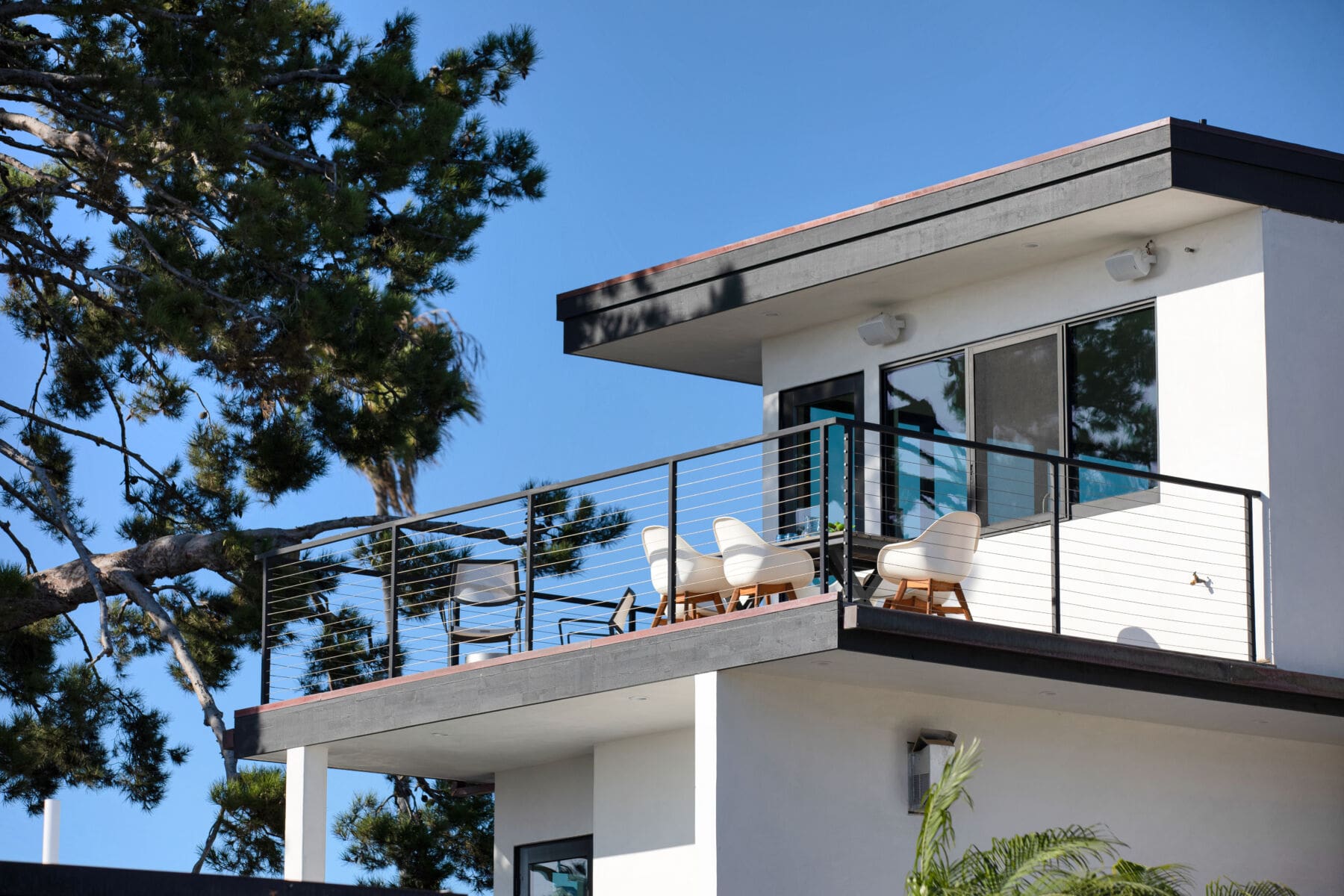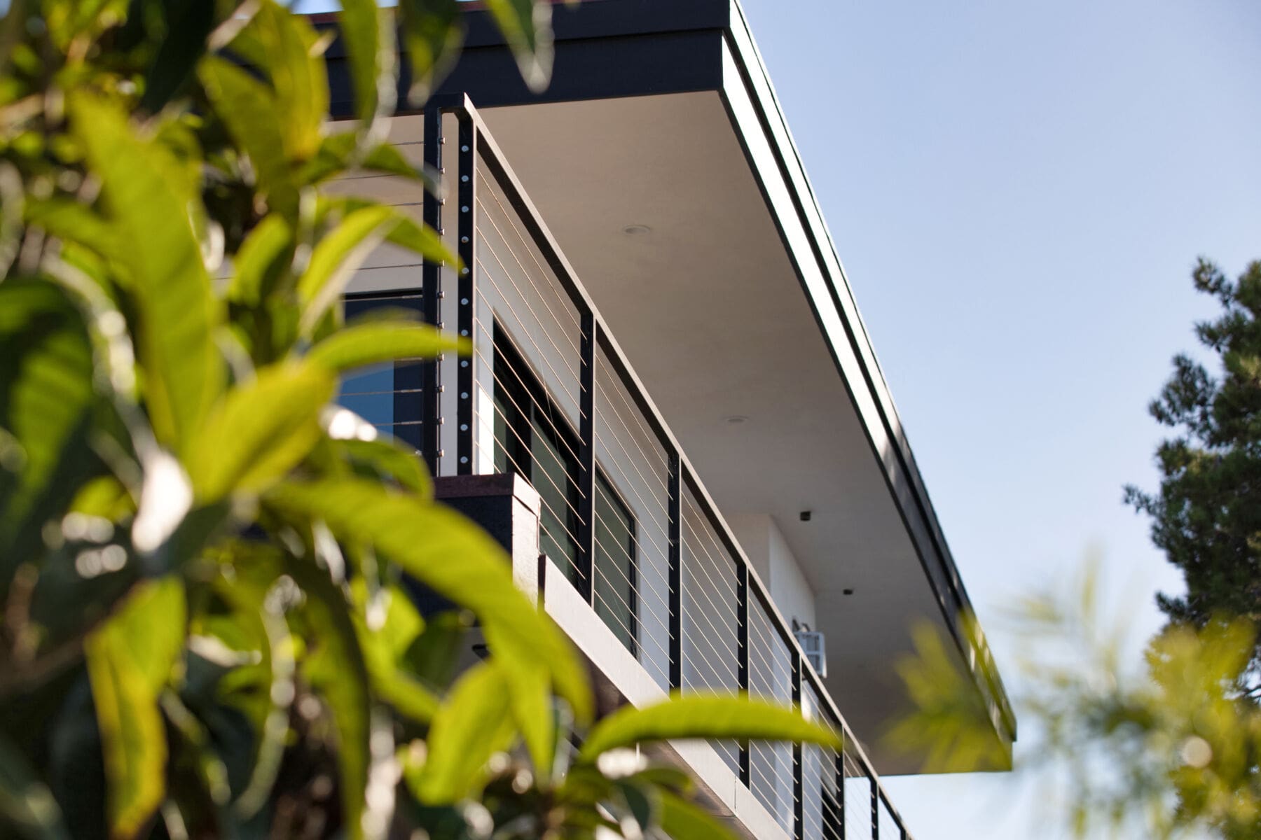 Stainless steel cable and fittings fill in this thin, welded metal railing frame, adding safety without obstructing the view from a wrapping second-story deck.