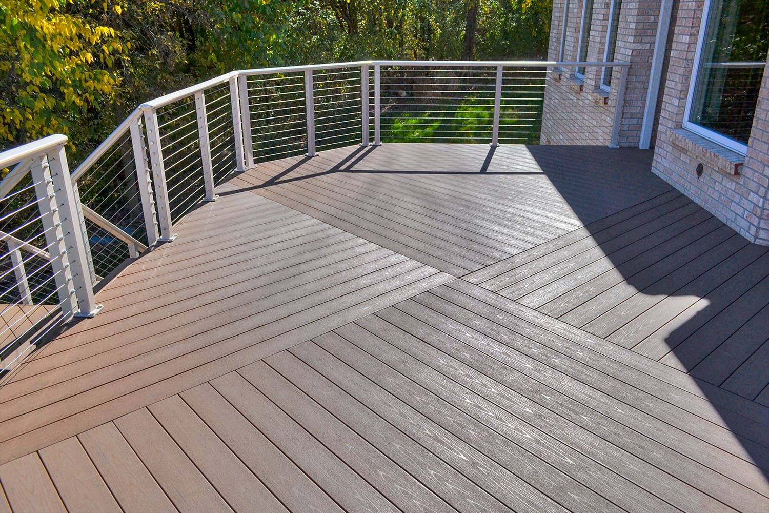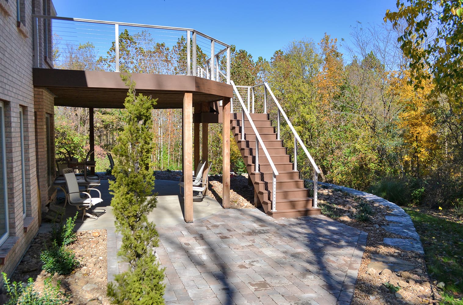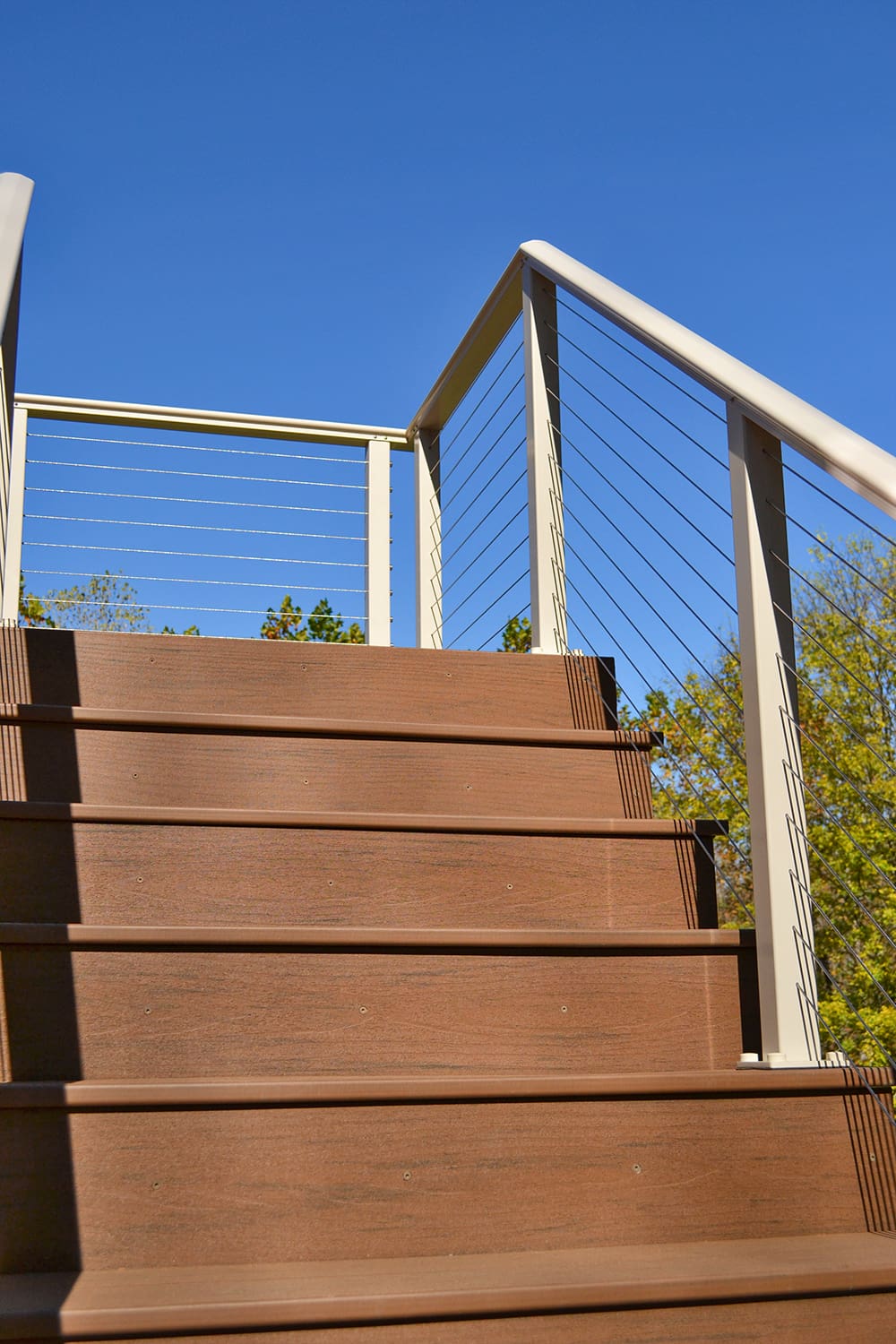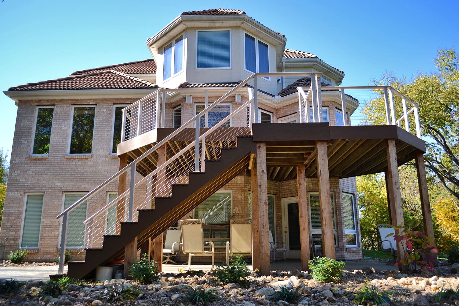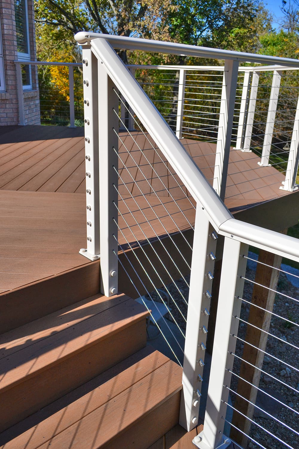 An Aluminum Cable Railing System opens the deck and stairs of this traditional home to a spacious, woodsy backyard. The clay powder-coat matches the creamy exterior and highlights in the brick siding, while the shaped top rail mimics the softened edges of the house's octagonal towers and smooth tile roofing.