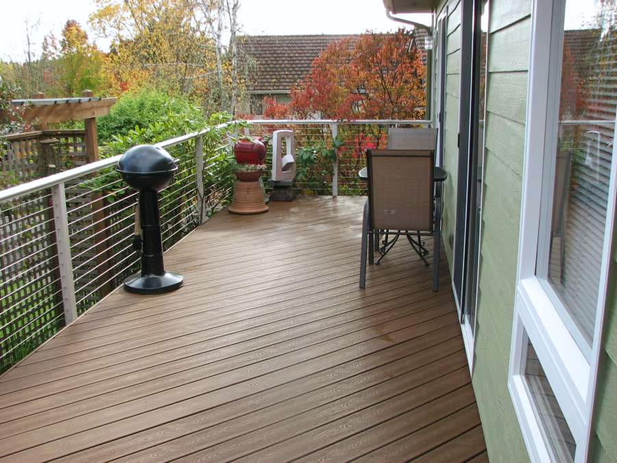 This wrapping deck maintains an open view of luscious greenery despite the tight space and narrow walkways thanks to an Aluminum Cable Railing System. The shaped top rail and clay powder-coat soften the metal rail so that it complements the creamy palette of the house.