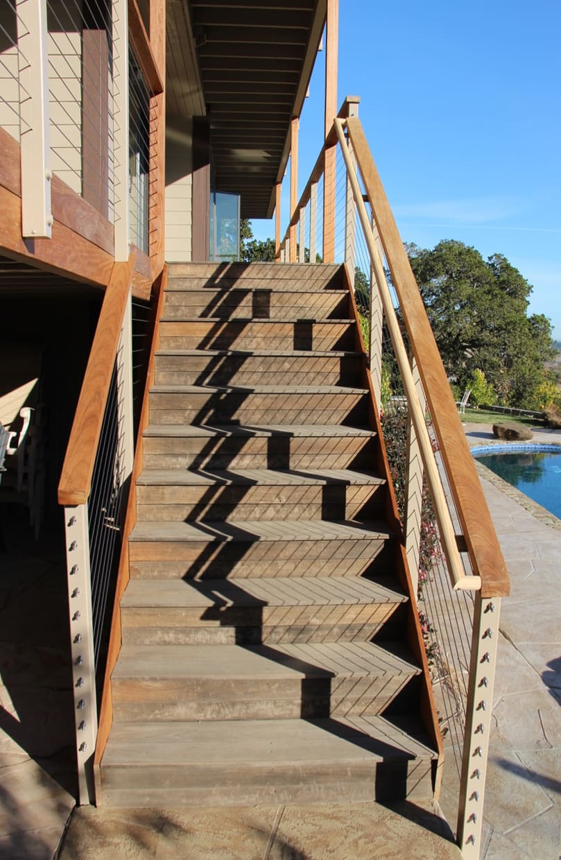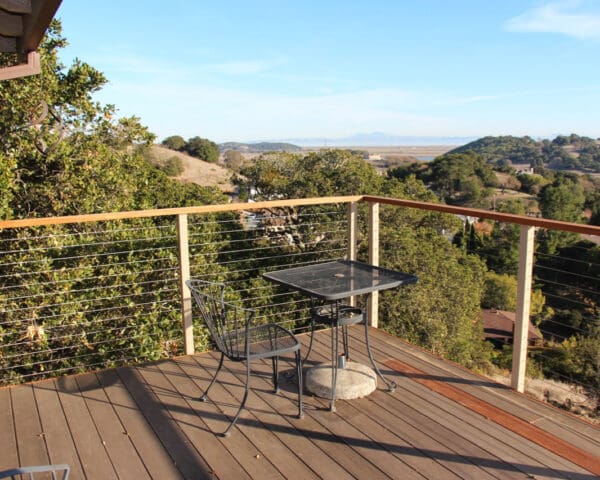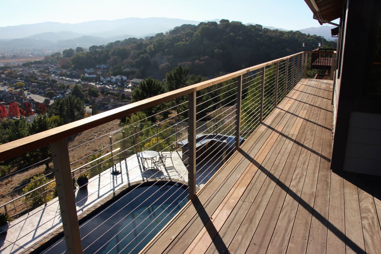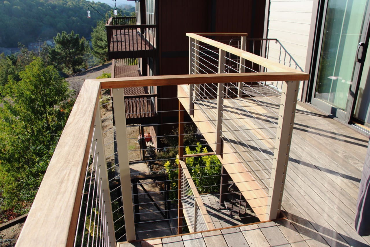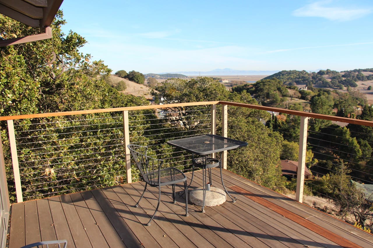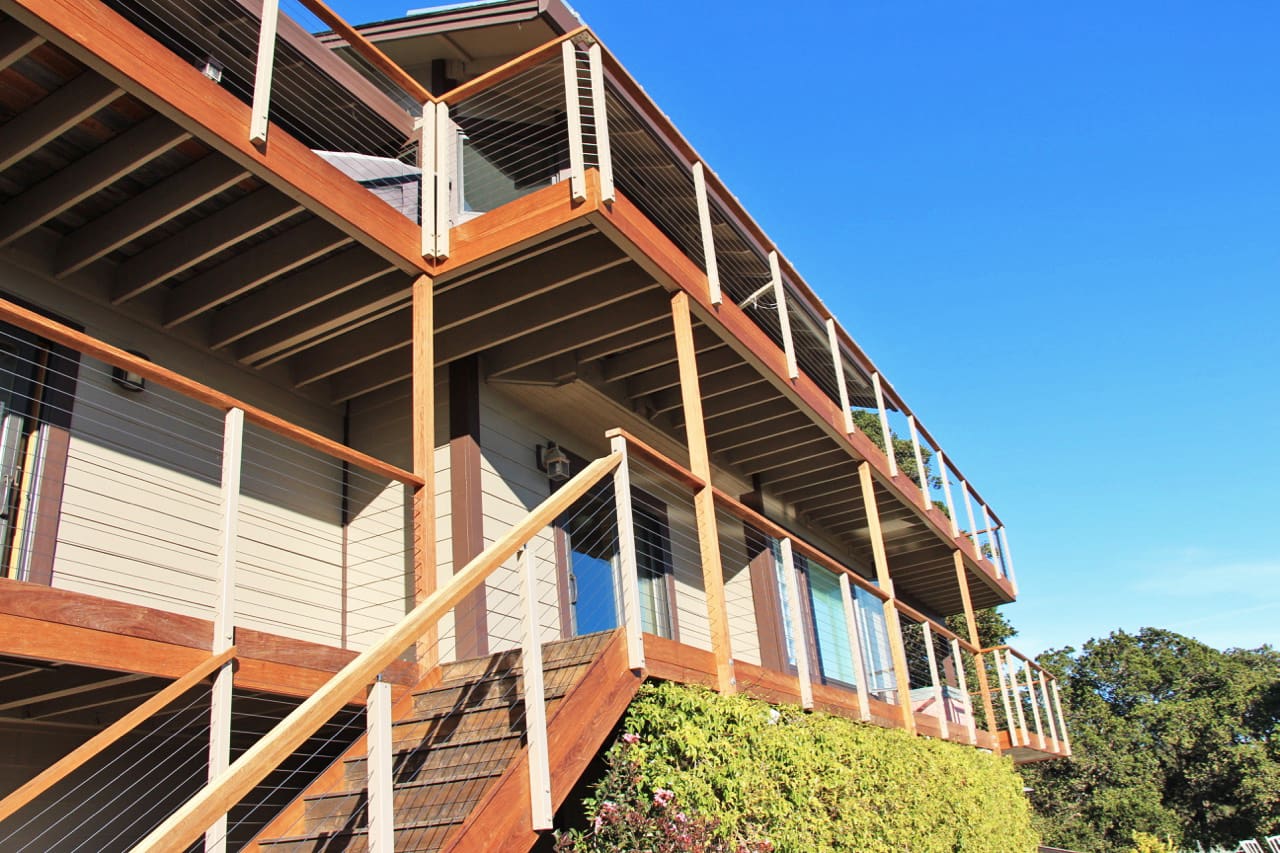 The view from these multiple-story decks overlooking a Californian valley are opened up with our Aluminum Cable Railing System. The clay color posts blend perfectly with the cream-colored house and play up the honey tones in the wood deck and matching top rail.