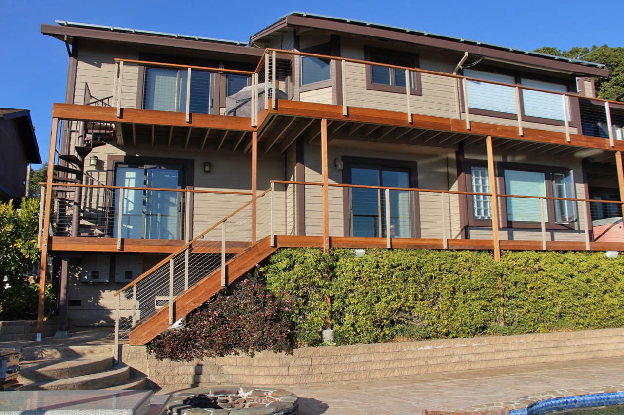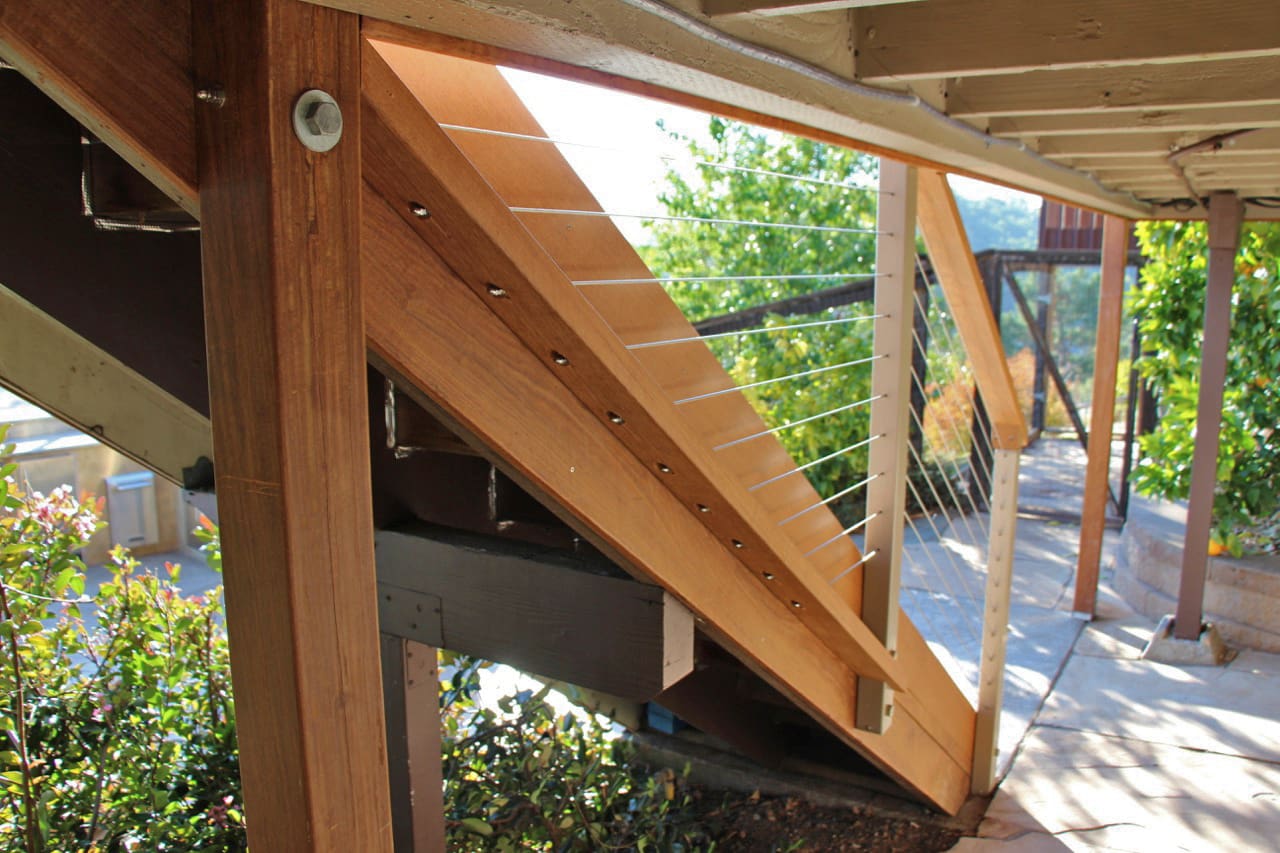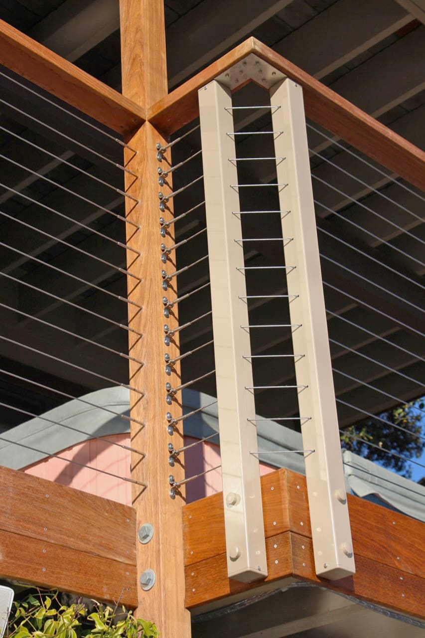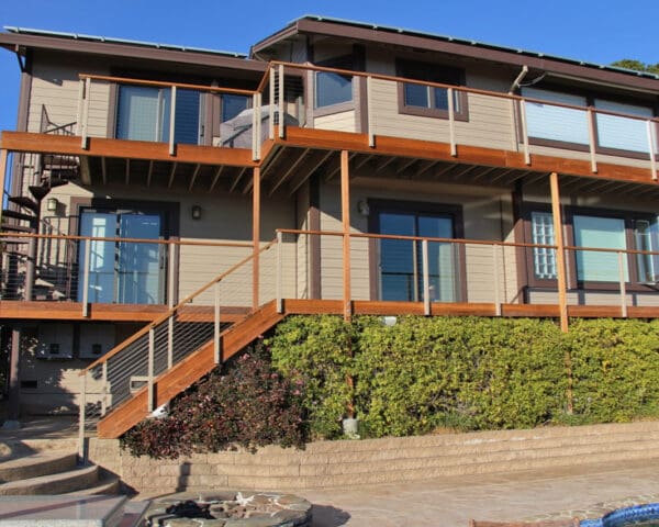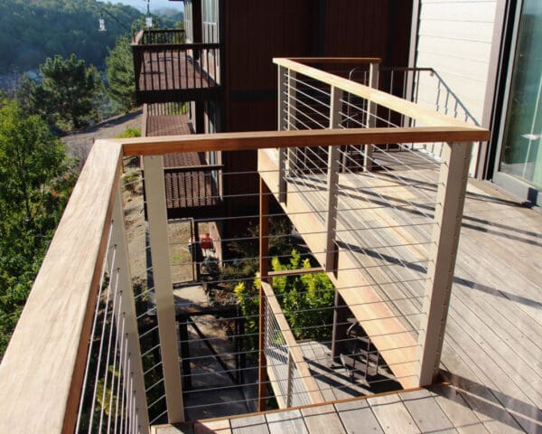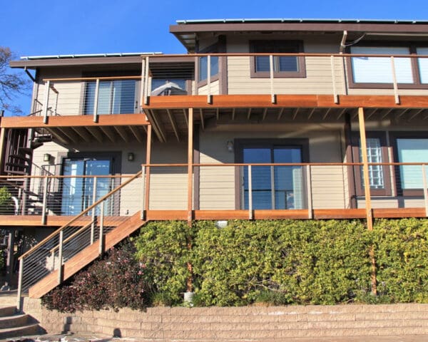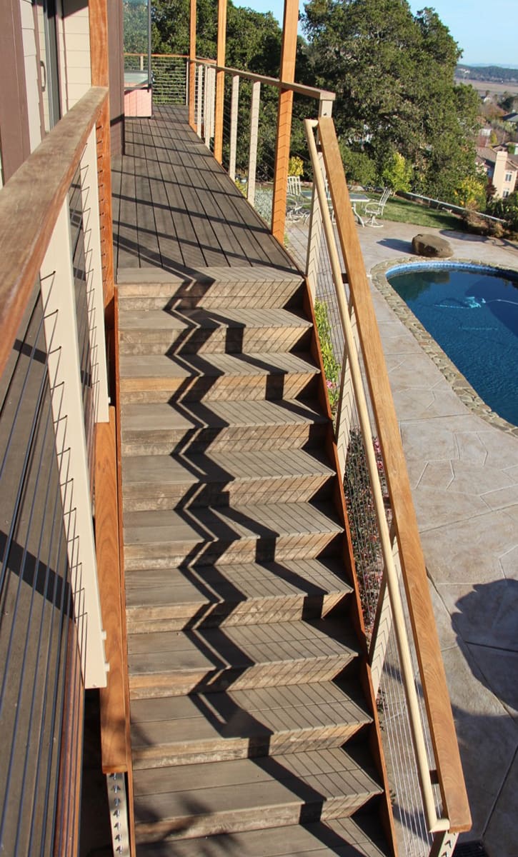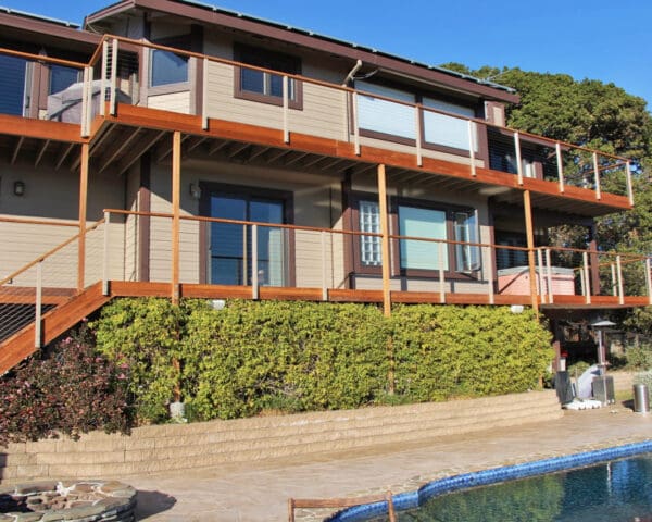 The view from these multiple-story decks overlooking a Californian valley are opened up with our Aluminum Cable Railing System. The clay color posts blend perfectly with the cream-colored house and play up the honey tones in the wood deck and matching top rail.