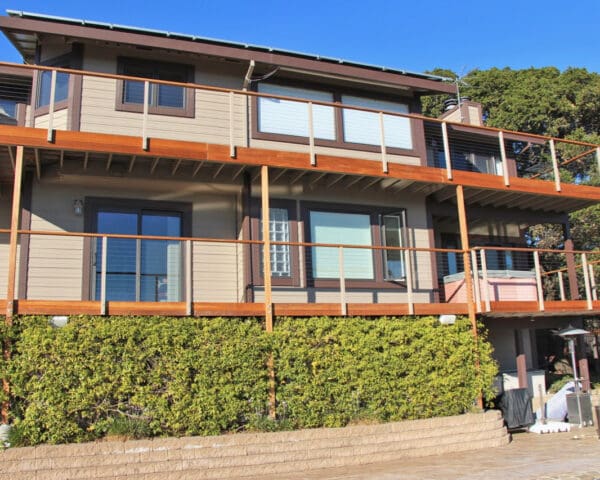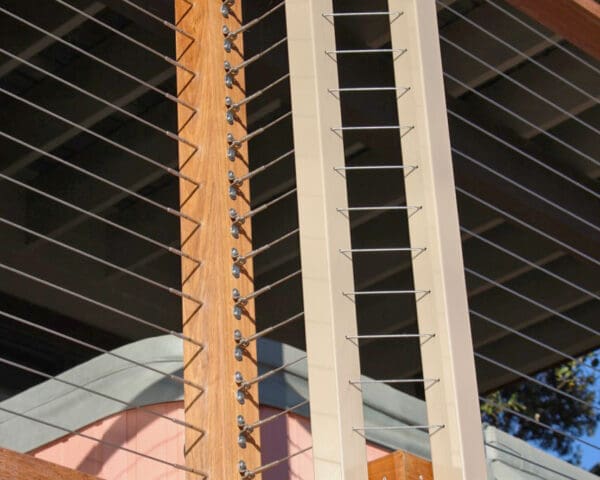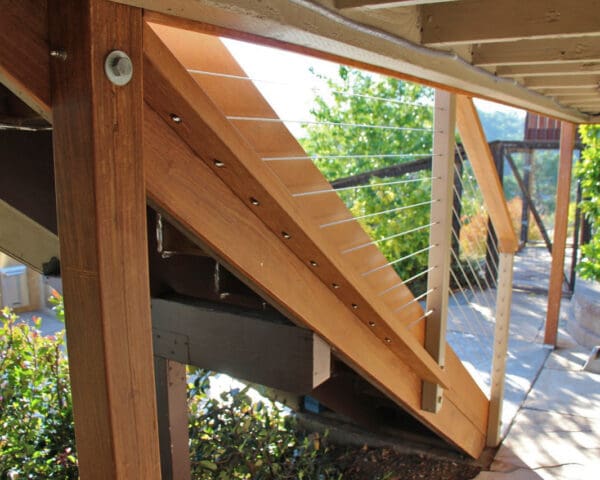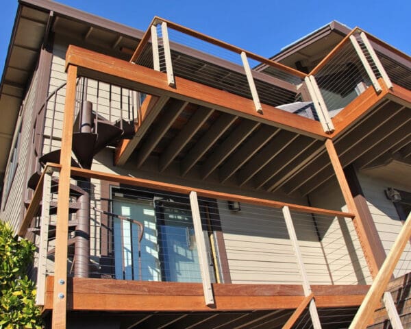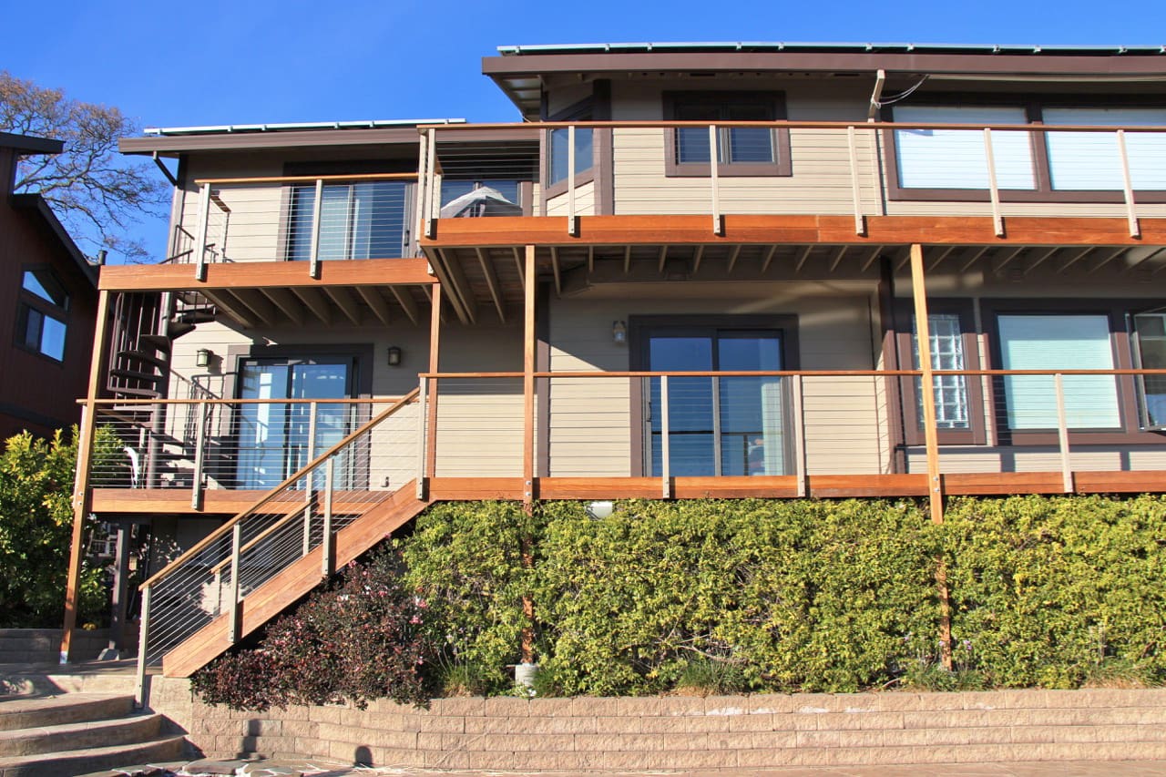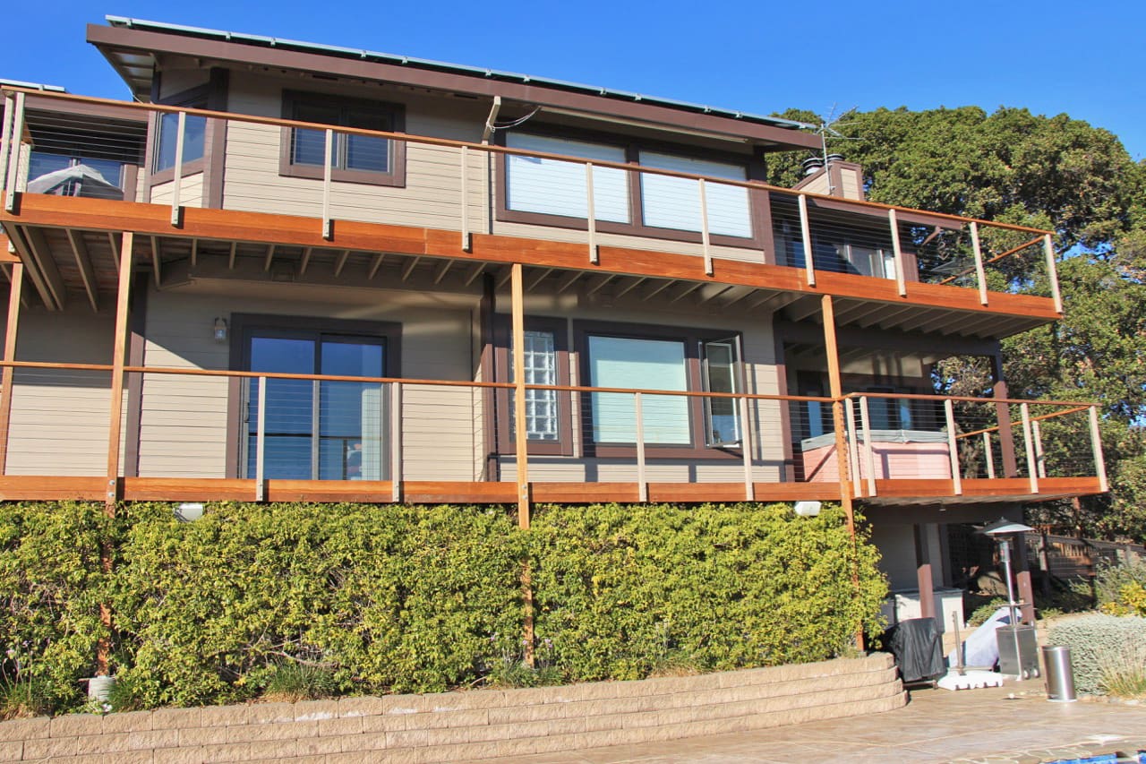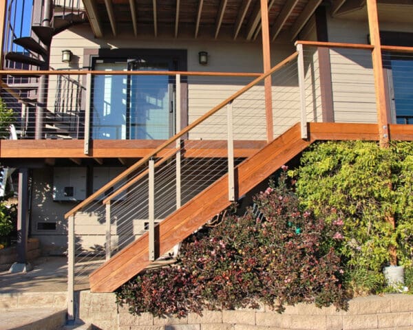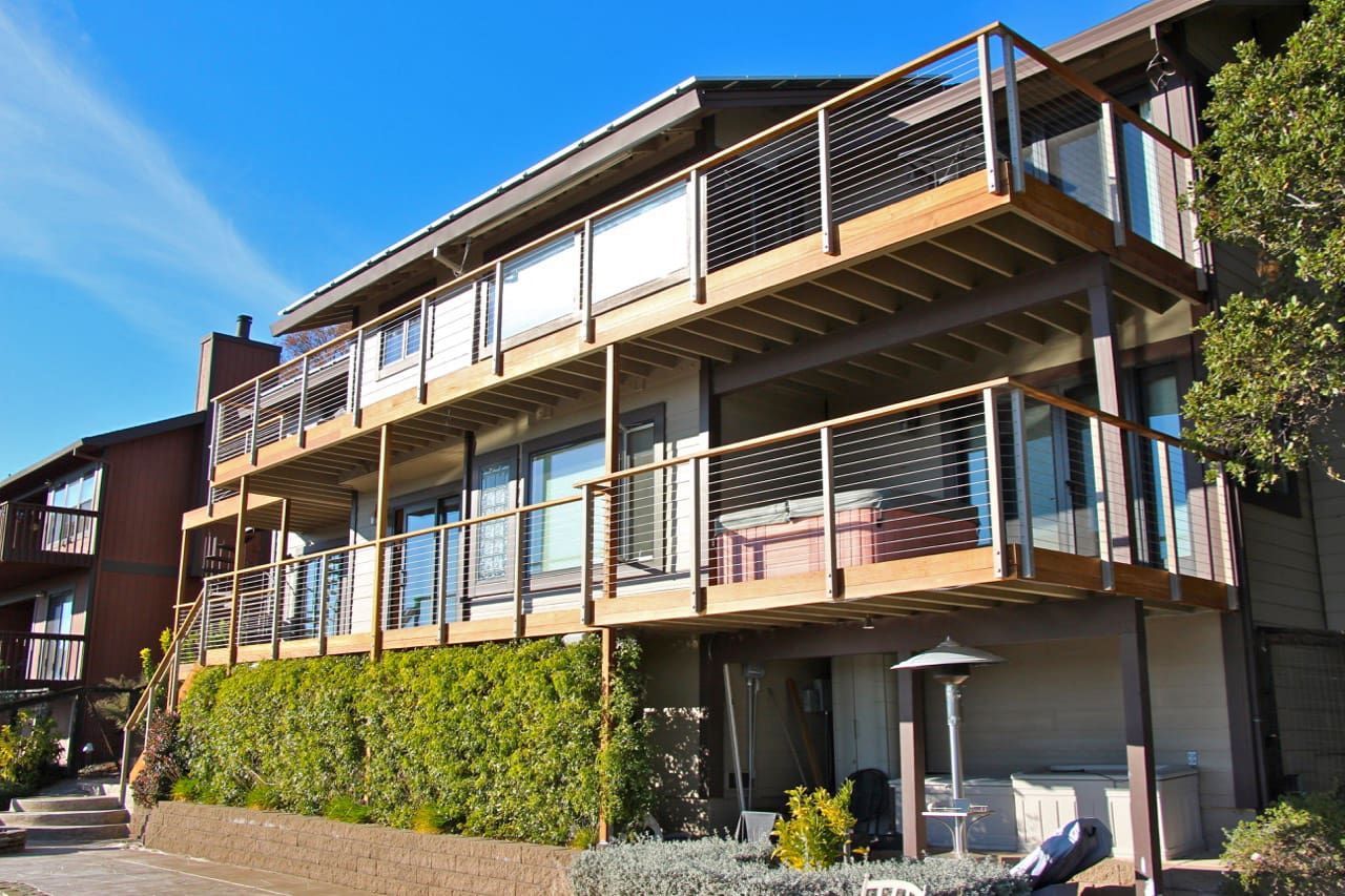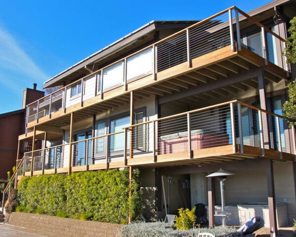 The view from these multiple-story decks overlooking a Californian valley are opened up with our Aluminum Cable Railing System. The clay color posts blend perfectly with the cream-colored house and play up the honey tones in the wood deck and matching top rail.