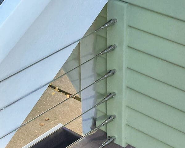 Our cable railing system keeps this small outdoor balcony from feeling cramped or cut off from the yard below. The clay color compliments the lime siding and bright wood for a charming fruit-and-cream palette. The jaw fittings easily accommodate the challenging angles of this project while cleanly embedding the attachment hardware into the siding and rail.