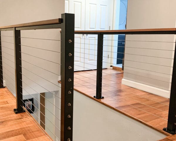 The open black frame of this cable railing stands out elegantly against white walls and rich wood flooring. Toggle anchors secure the cable ends inside hollow posts, allowing these homeowners to install their terminal posts right up against the back wall without a gap.