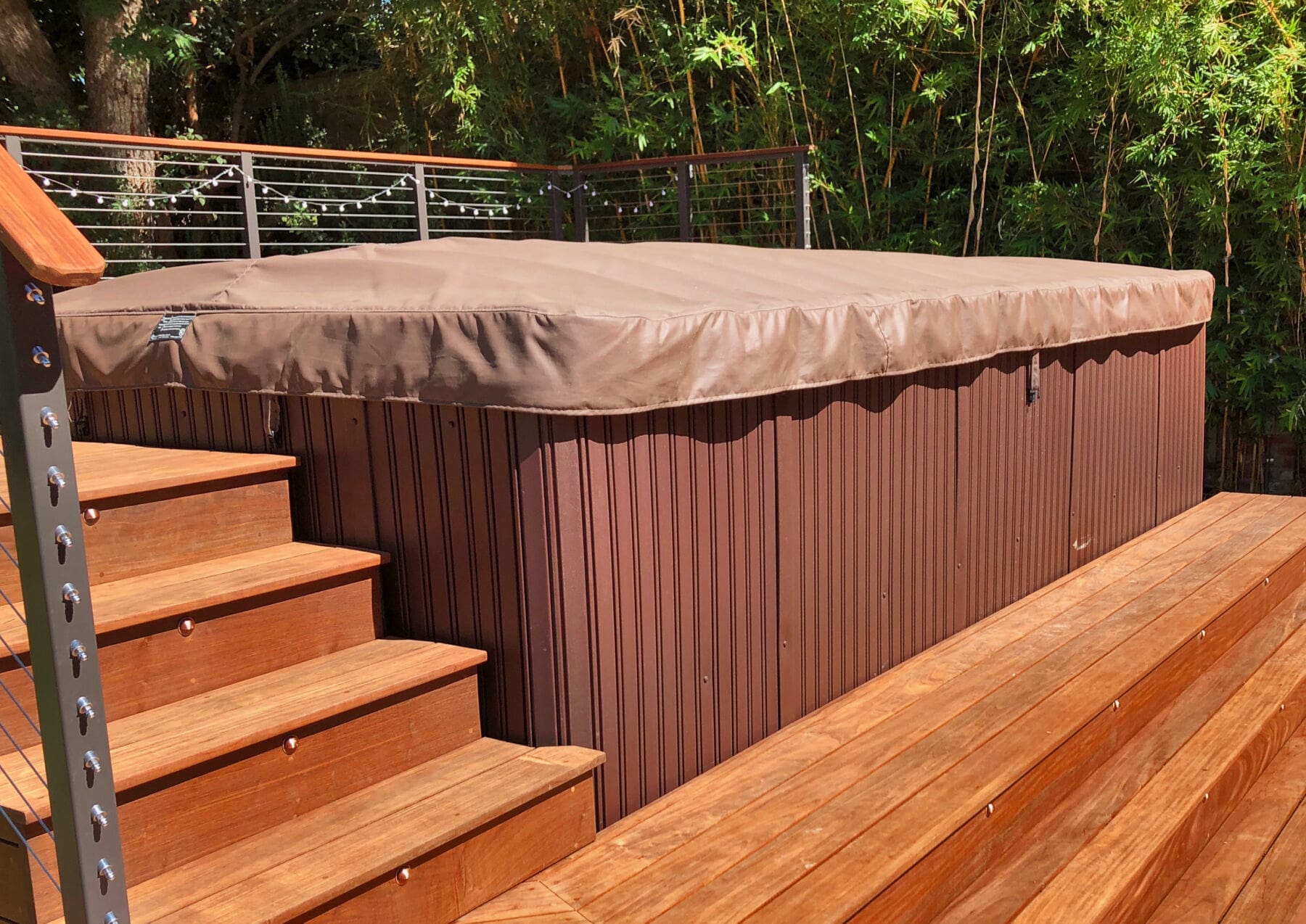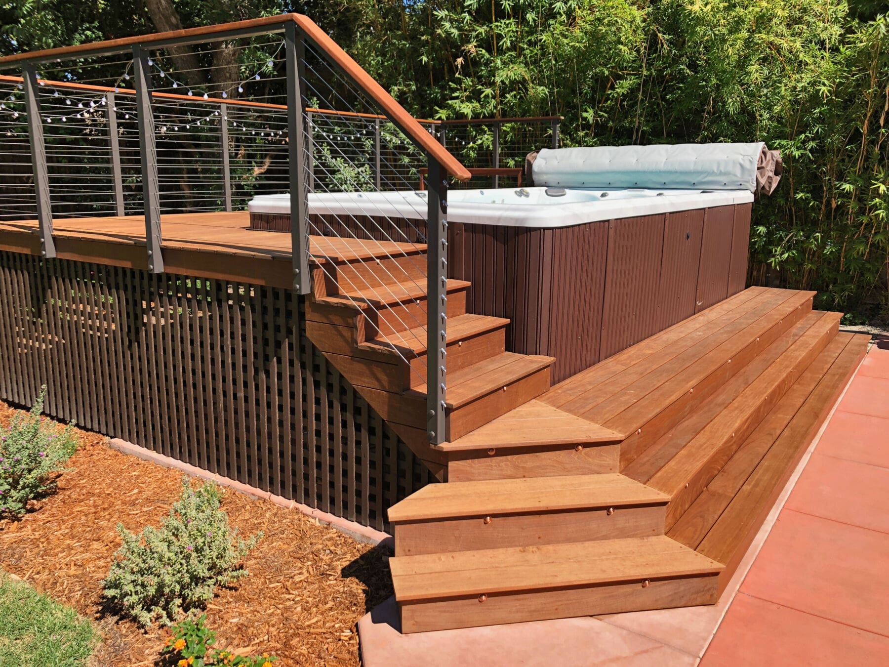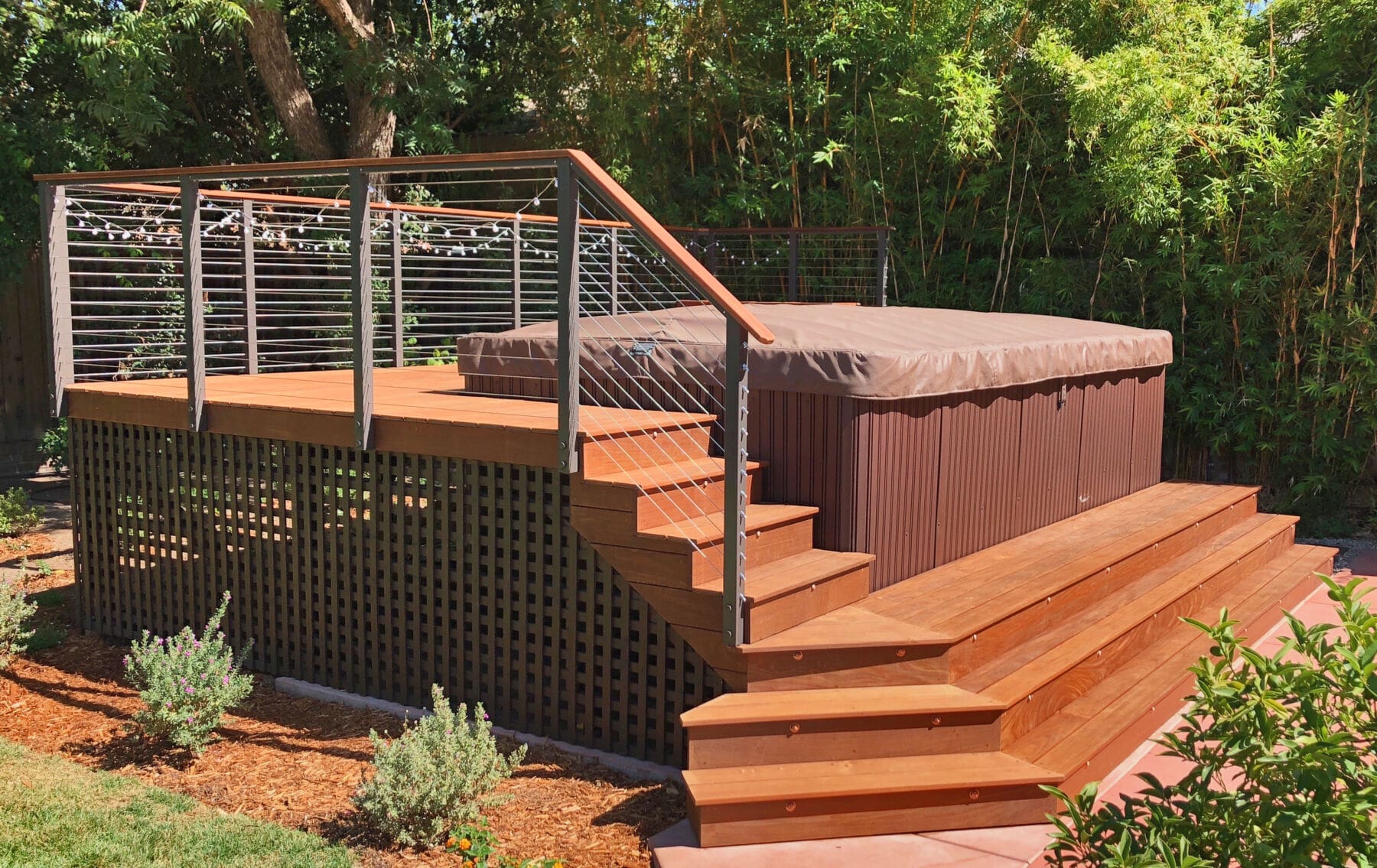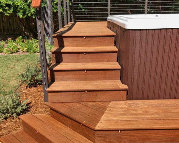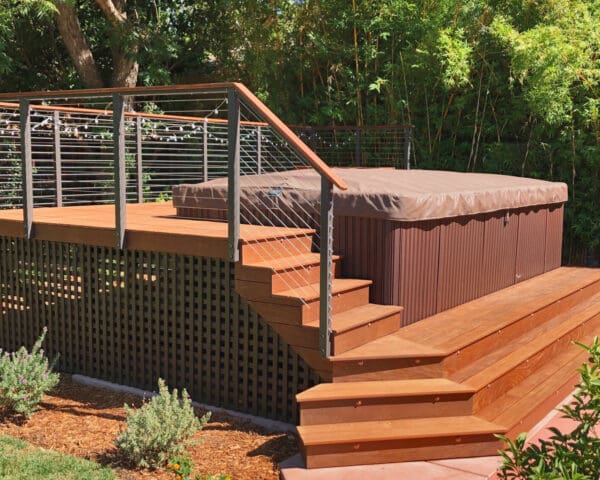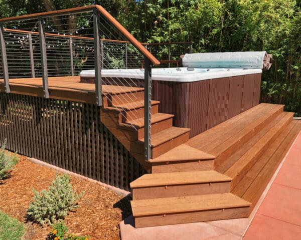 Bronze fascia-mount posts and an Ipe top rail ring this beautiful backyard hot tub sanctuary. The open railing design keeps the platform from feeling cramped or cut off from the rest of the yard while the earthy colors fit perfectly with the rich wood of the deck and lush surrounding flora.