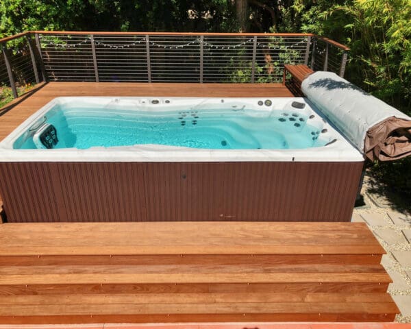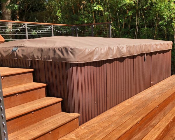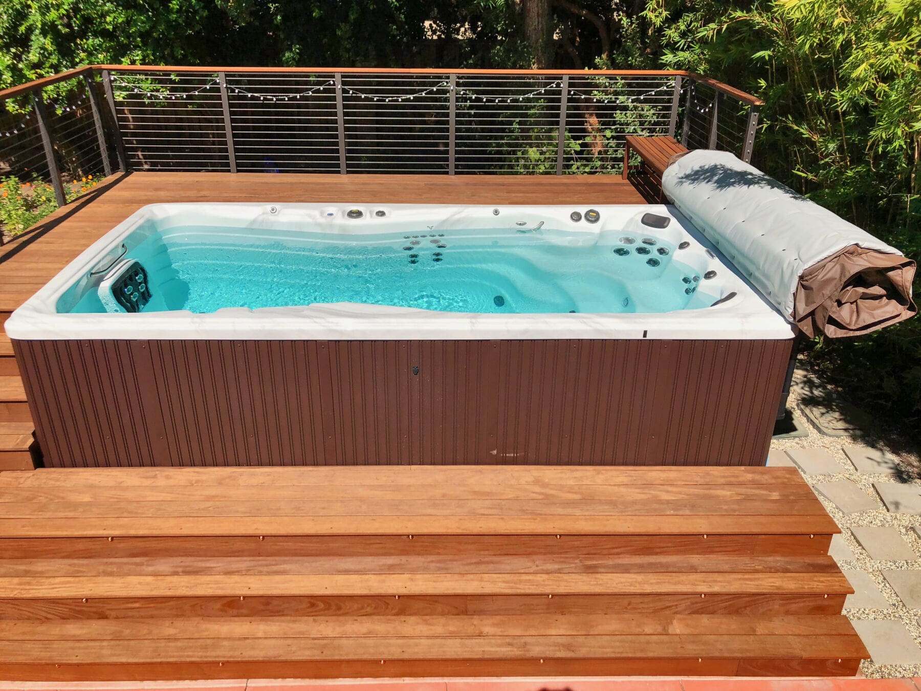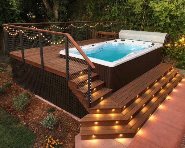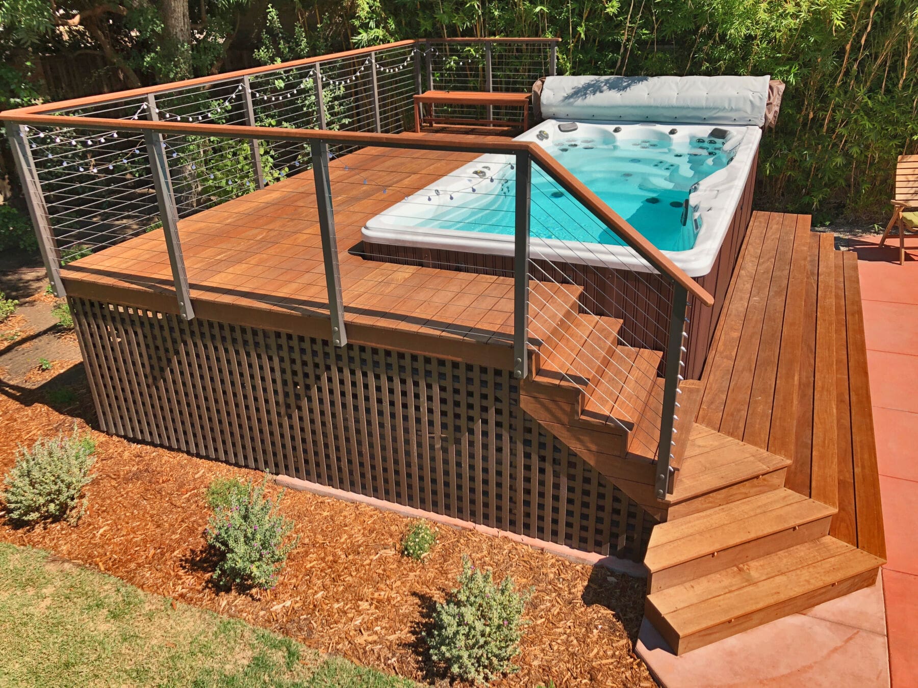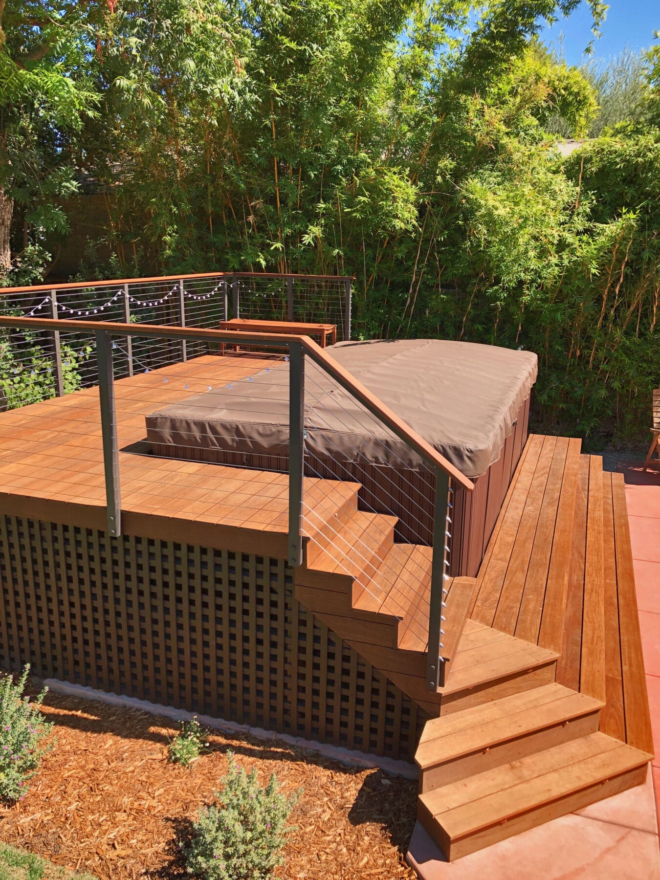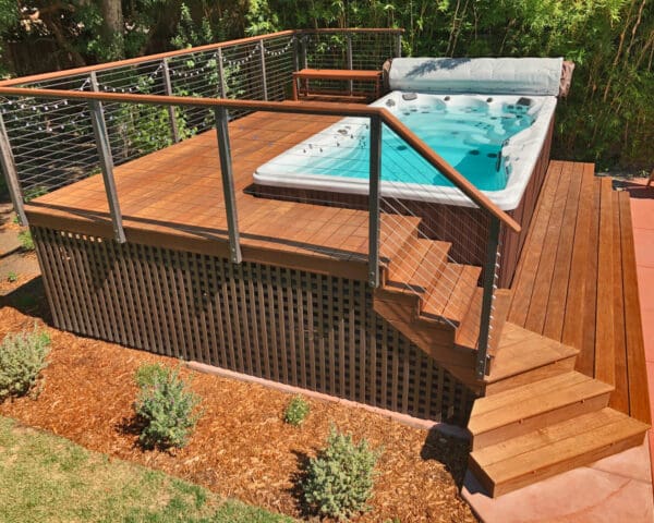 Bronze fascia-mount posts and an Ipe top rail ring this beautiful backyard hot tub sanctuary. The open railing design keeps the platform from feeling cramped or cut off from the rest of the yard while the earthy colors fit perfectly with the rich wood of the deck and lush surrounding flora.