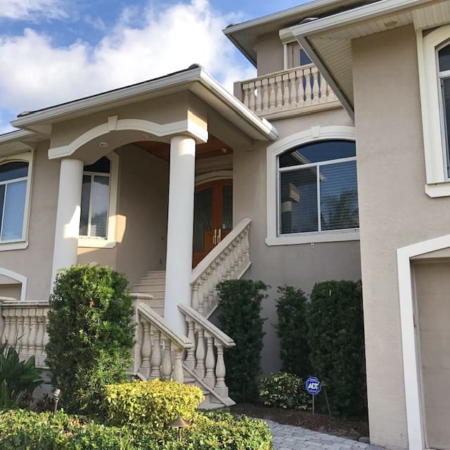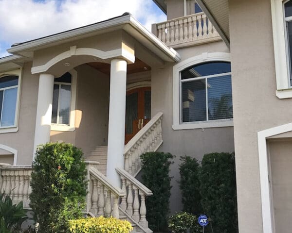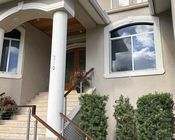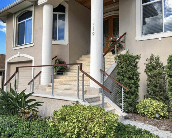 Stainless steel and Ipe Brazilian Walnut add a touch of contemporary style to this classy stucco home in Naples, FL. Bulky colonnades were replaced with thin, open framing and cable infill to open up the front door staircase and second-story balcony.