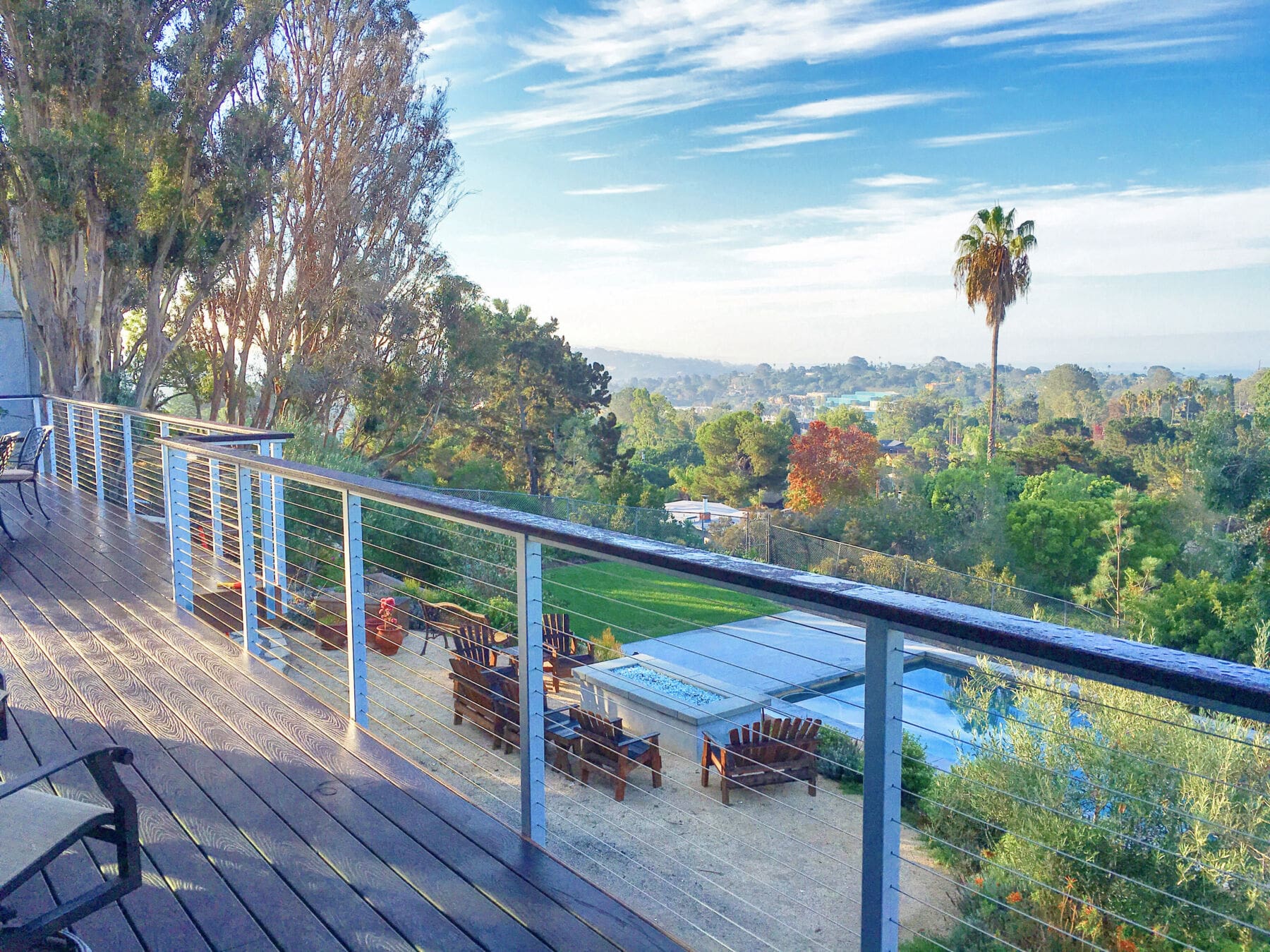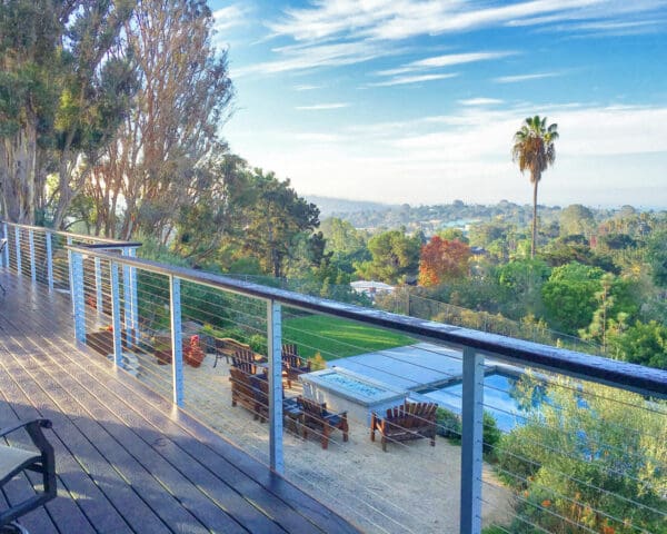 The Natural Aluminum Cable Railing on this Californian home perfectly compliments the cool-toned elements and clean lines that characterize a contemporary deck, fire pit, and pool area.