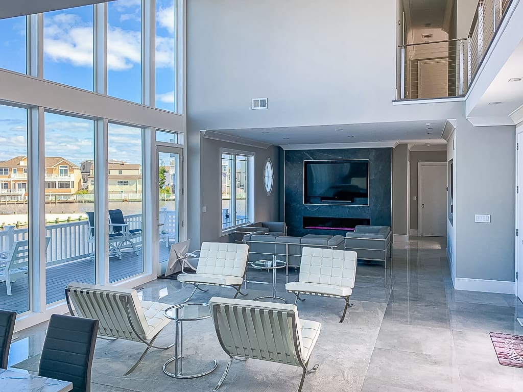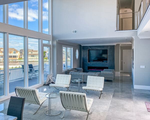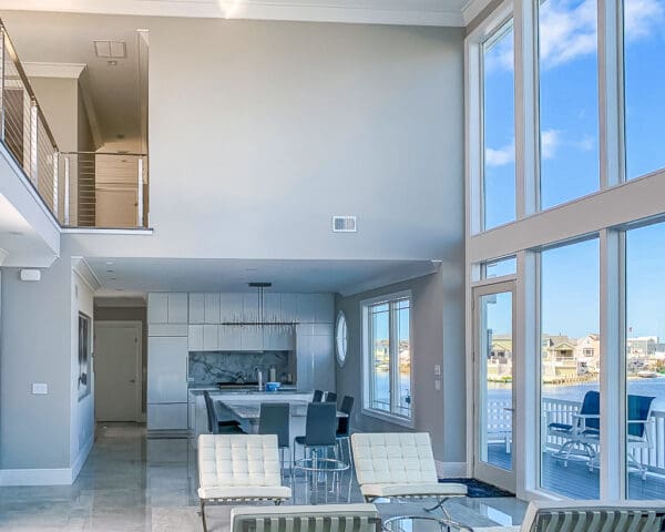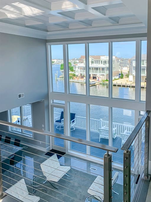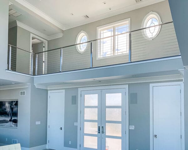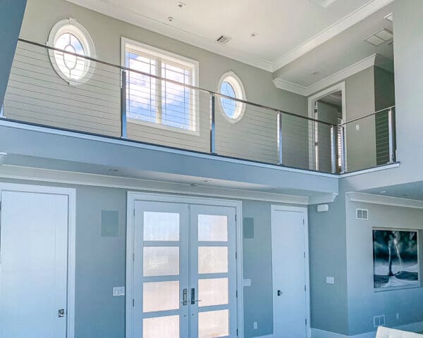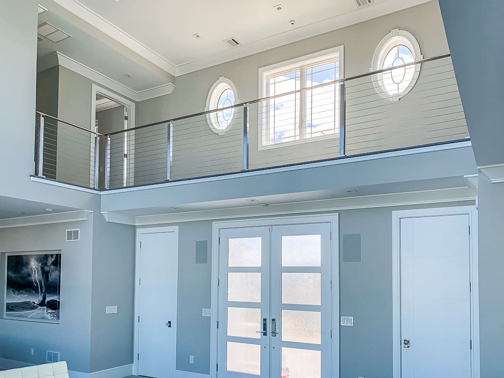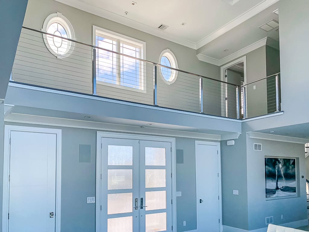 Every aspect of this two-story home is designed with the view in mind. Our stainless steel cable railing system keeps the catwalk over the front door open and airy, for easy enjoyment of the living area below and the wall of windows beyond.