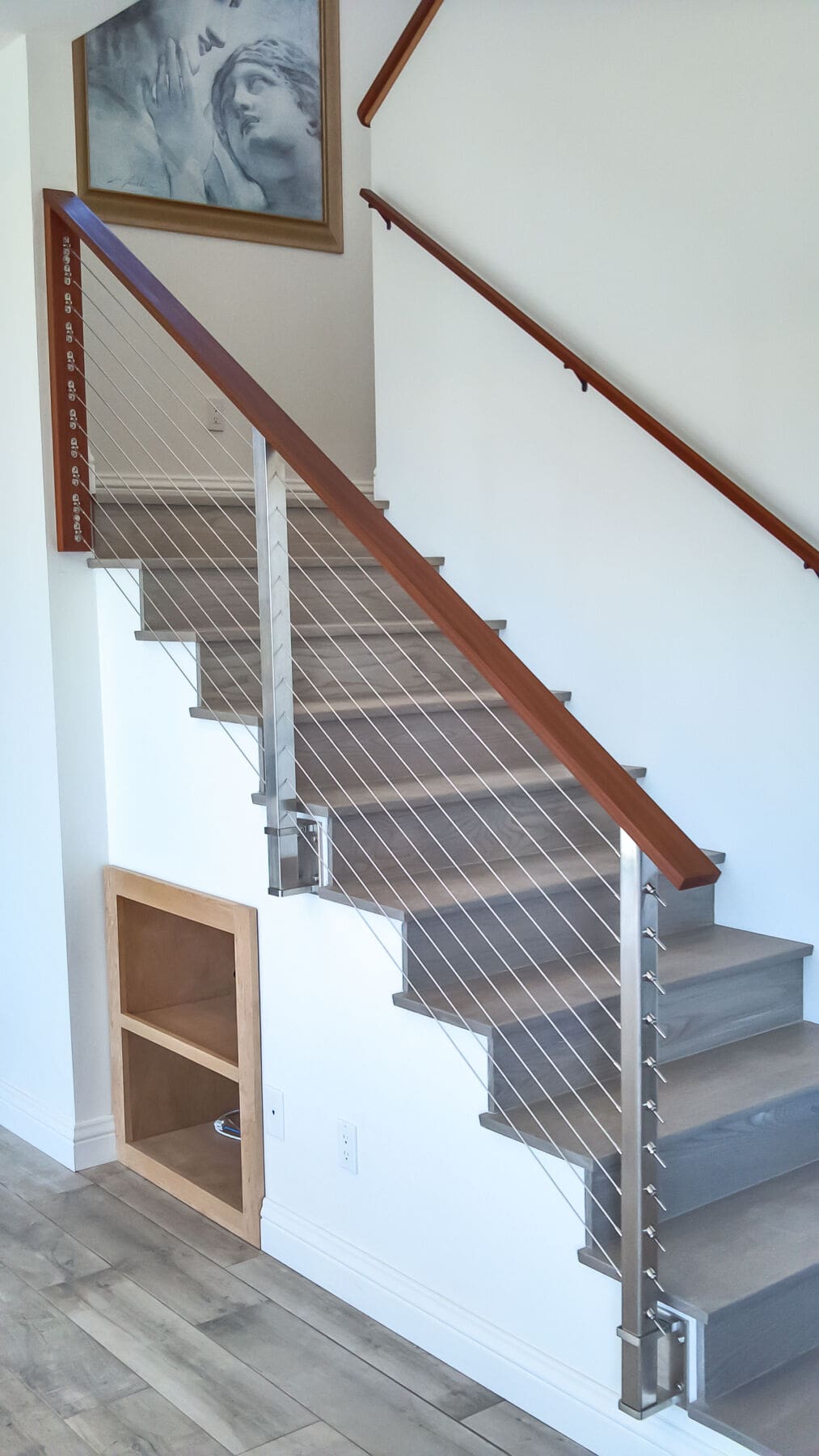 Glossy stainless steel and deep red wood strikingly accent this bright interior stairway in Encinitas, CA. The fascia-mounted posts keep the surface area of the stairs themselves open. Cable infill all but disappears against the similarly-colored tread.