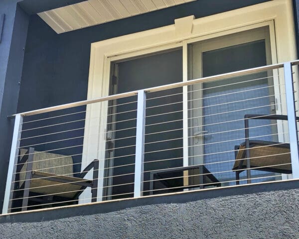 With a small balcony overlooking the front yard and a regal exterior of bold shapes and colors, this home needed a railing that was safe, yet subtle. Our stainless steel square cable railing is the perfect fit, as it complements the rectangular shape of the house while reflecting the colors around it.