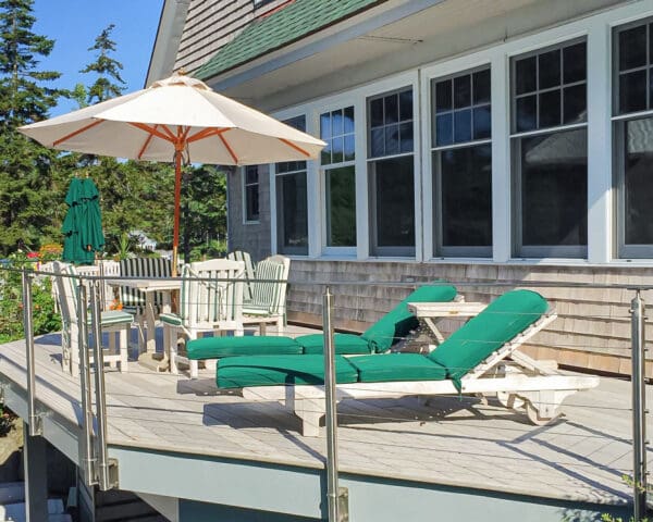 Stainless cable railing makes this beautiful outdoor lounge area safe and stylish. Visitors can easy enjoy their view of the lake while remaining seated.