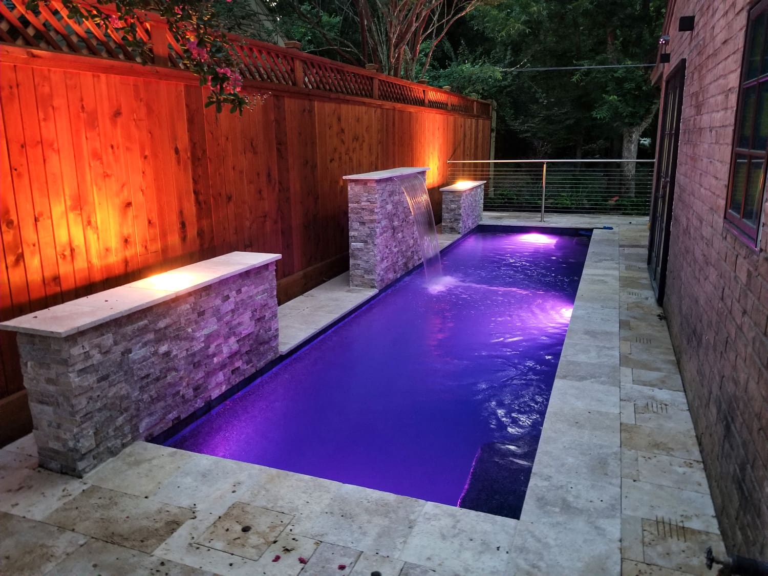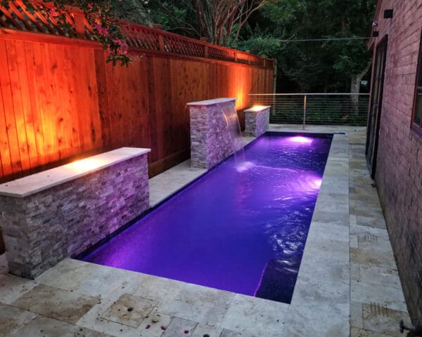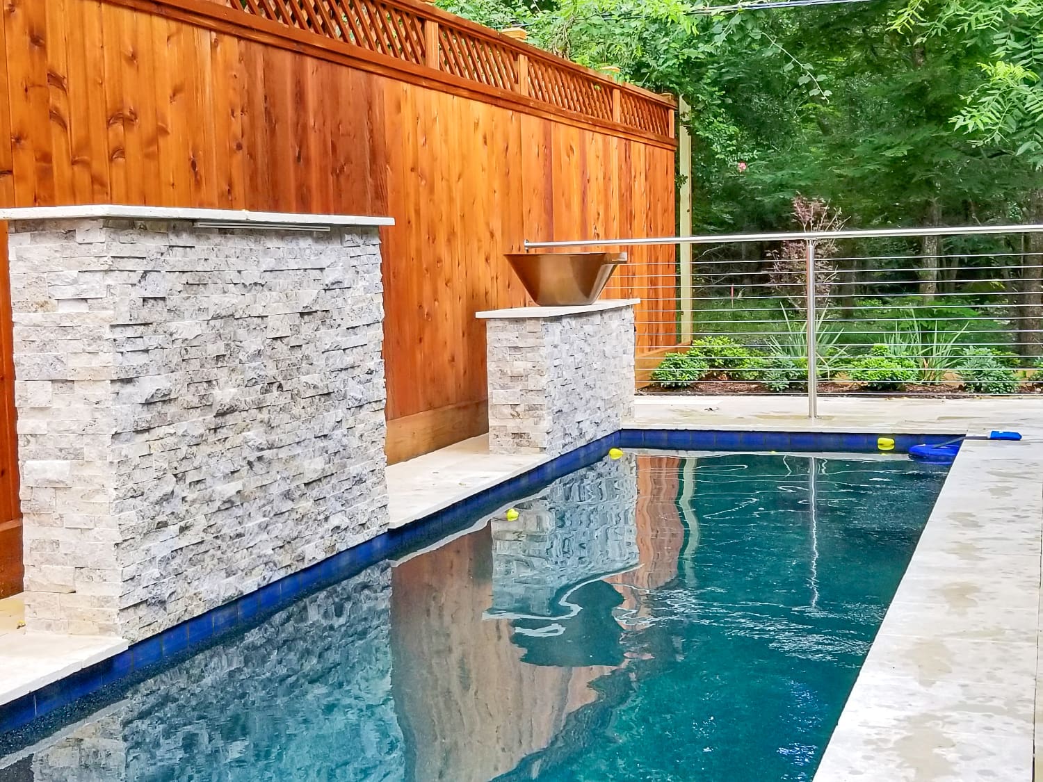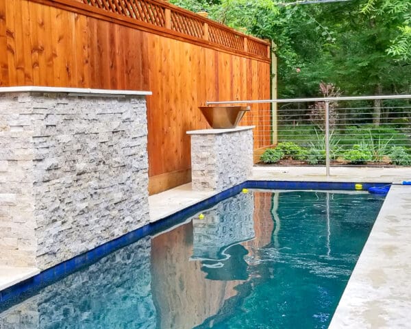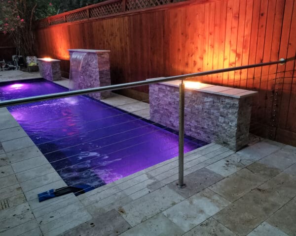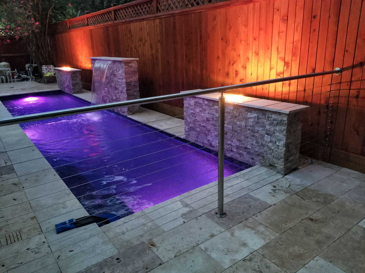 This slender pool is quite the show-stopper, with water features and lighting that really amp up the luxury. Our customer needed a perimeter fence that complemented the look of the pool area without drawing the eye away from it. Our round stainless steel railing accomplishes just that and seals the area off elegantly.