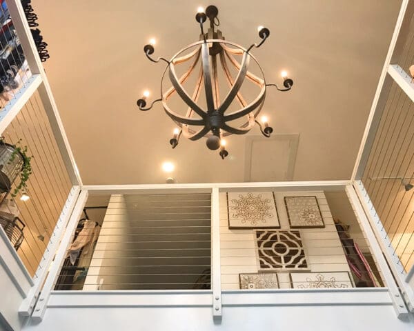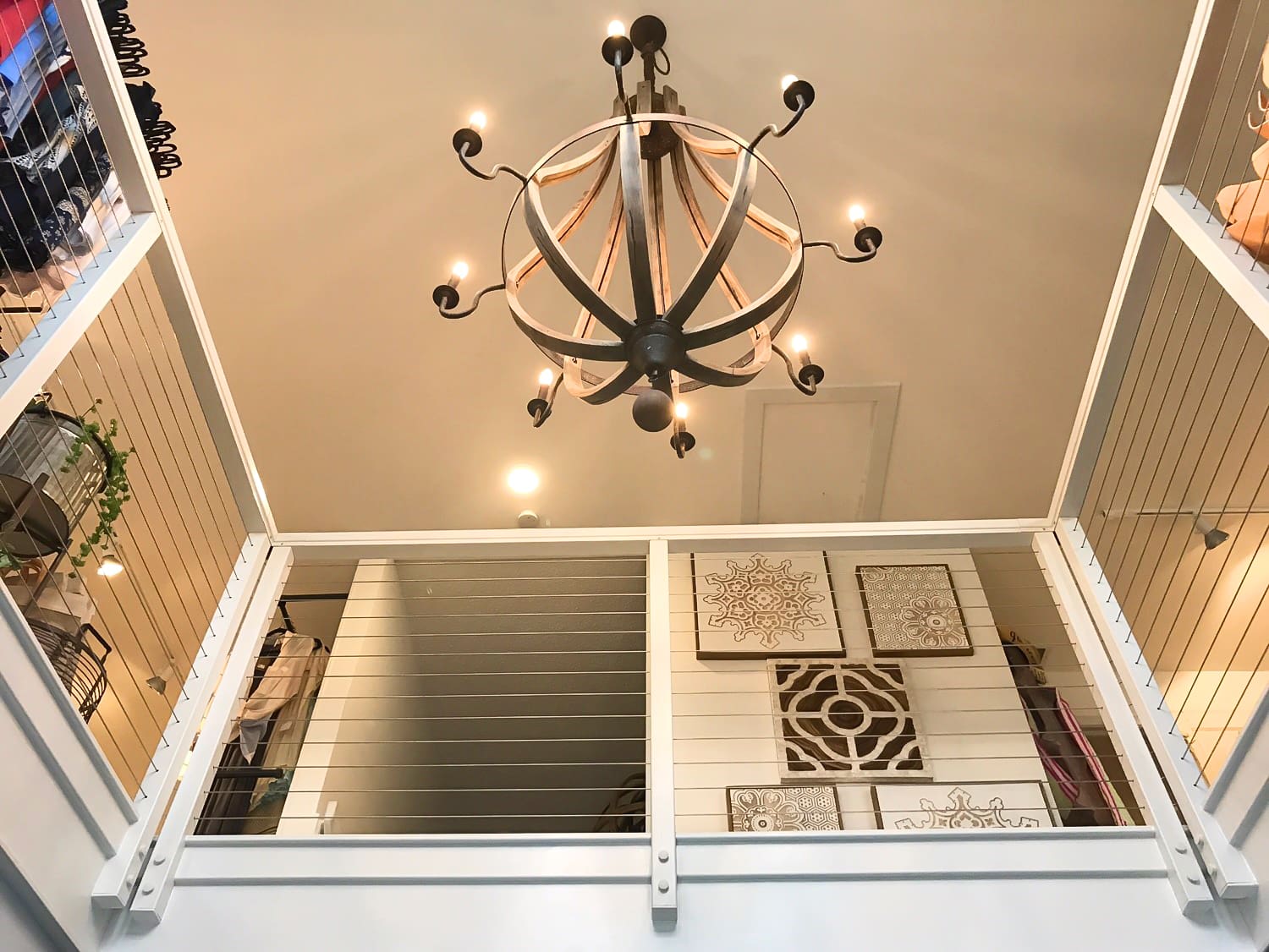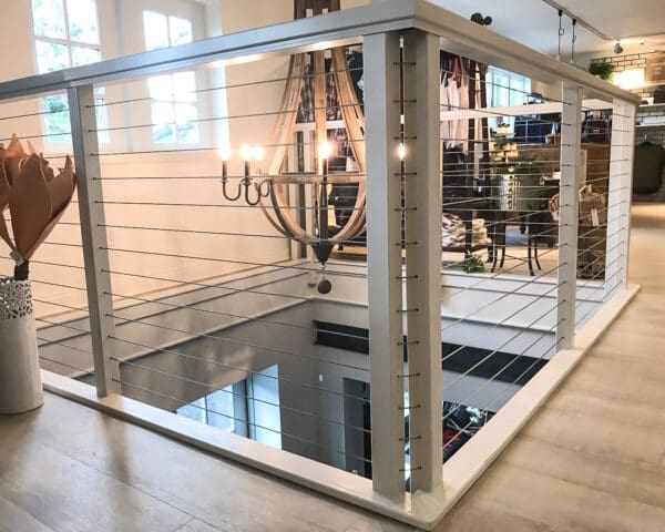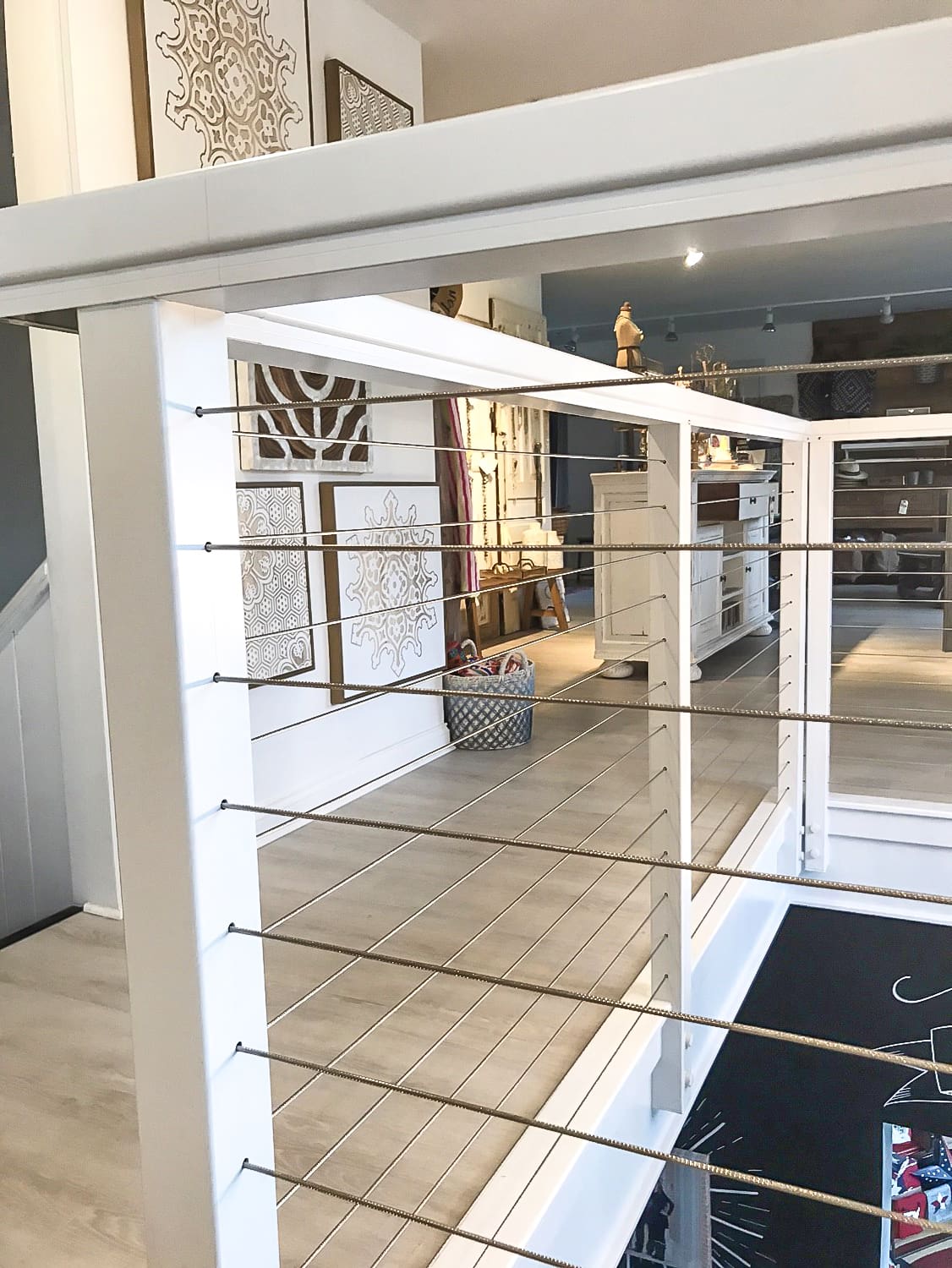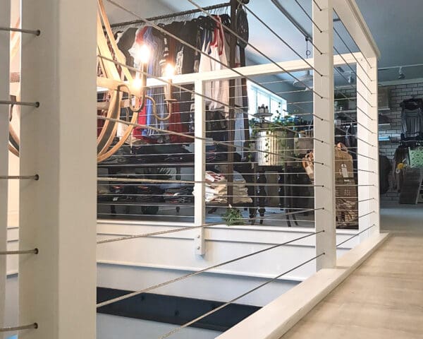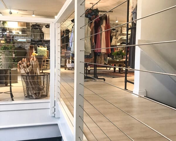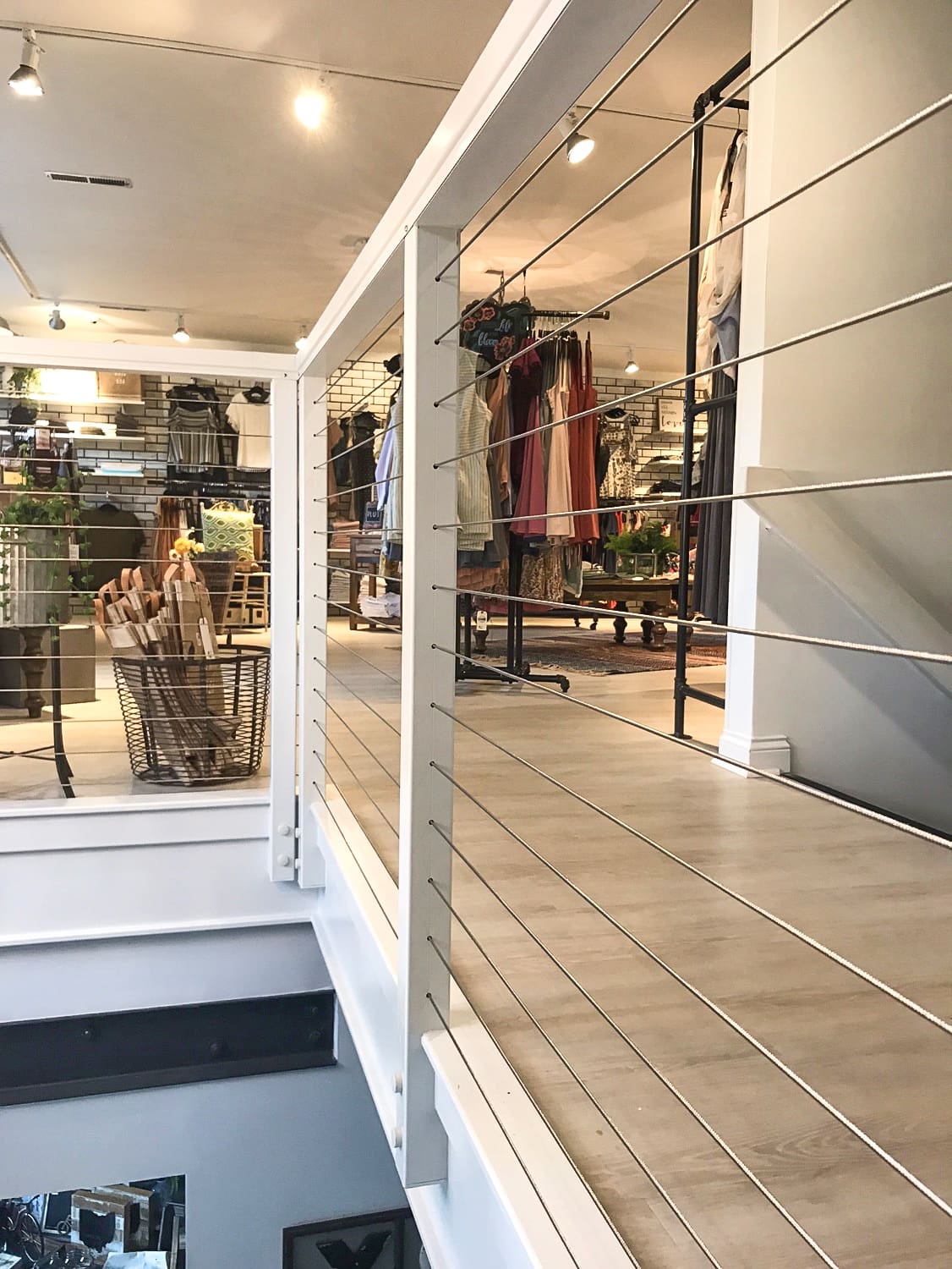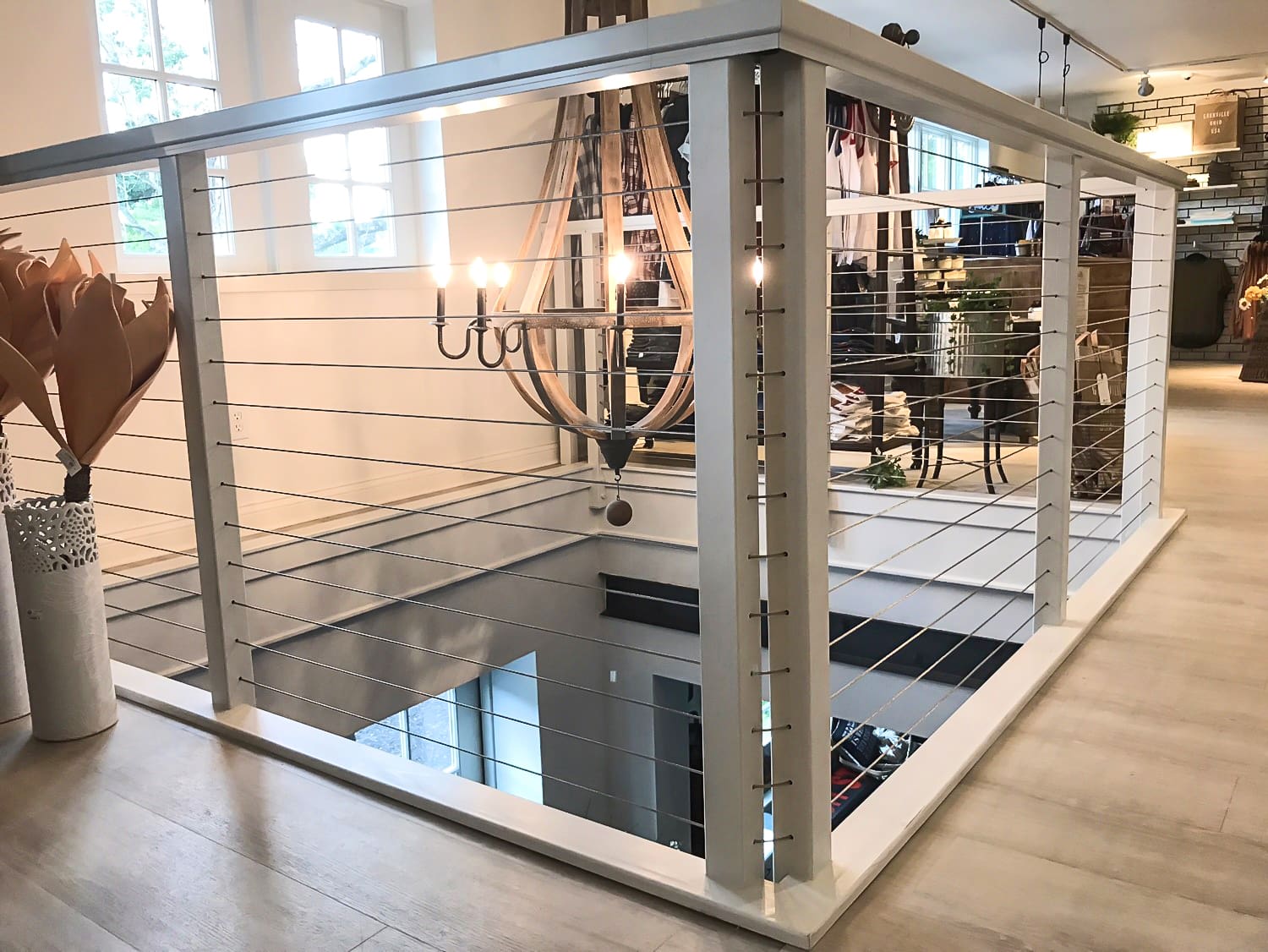 This chic shop in Granville, OH looks fresh and inviting with its white and cream palette. Fascia mount posts and cable infill open up a second-story balcony overlooking the entrance. The white frame blends perfectly with the trim.