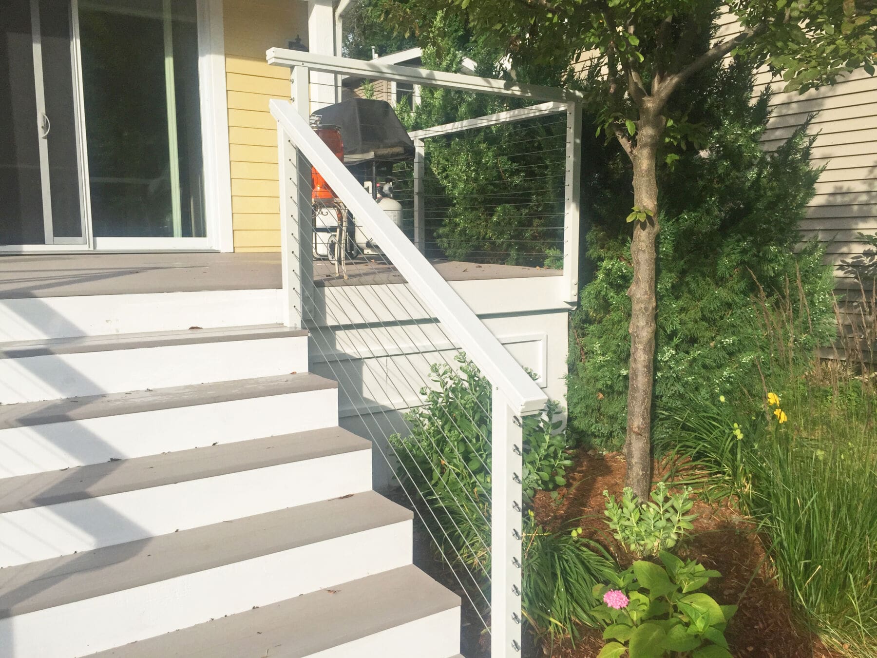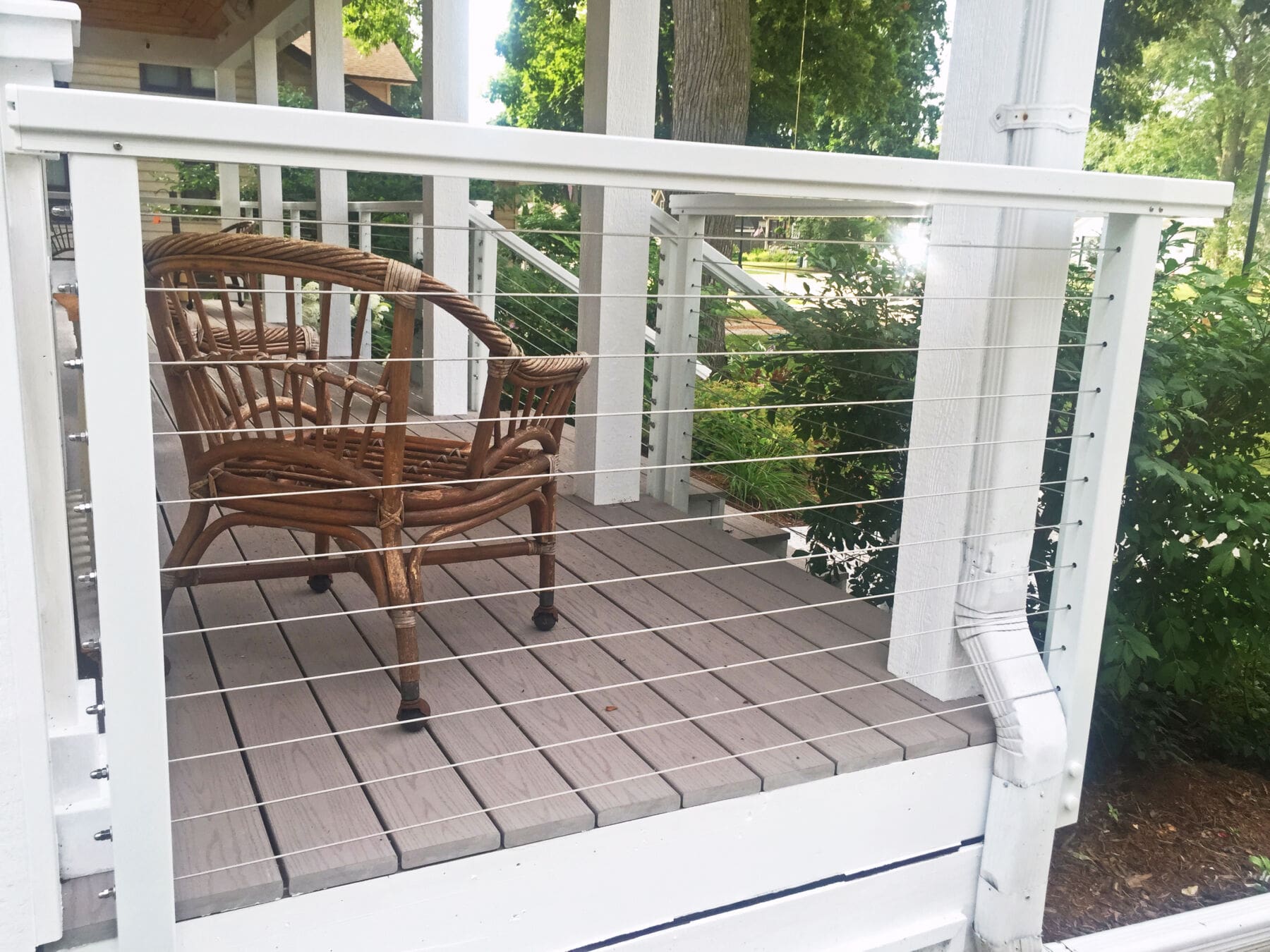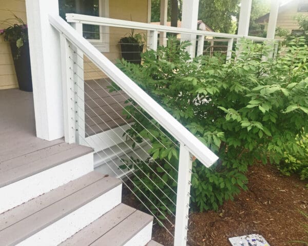 This fascia-mounted White Aluminum Cable Railing System completes a welcoming wrap-around porch with its bright coloration and open design.
