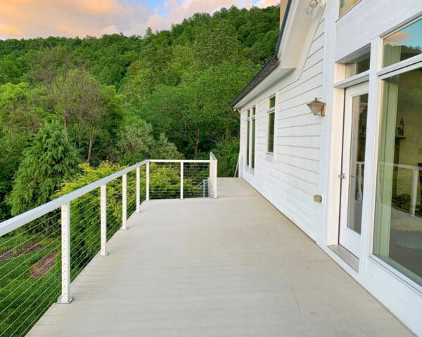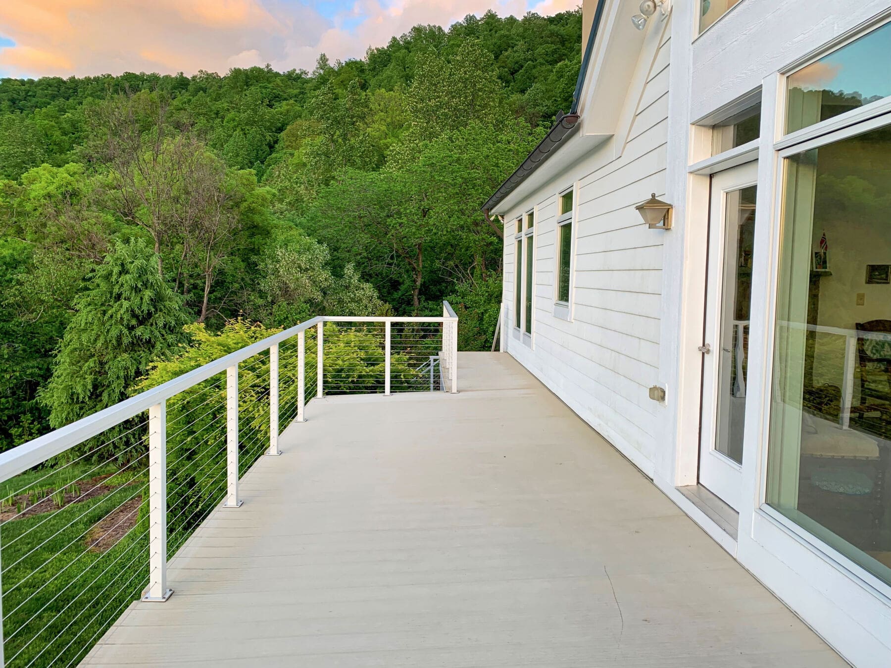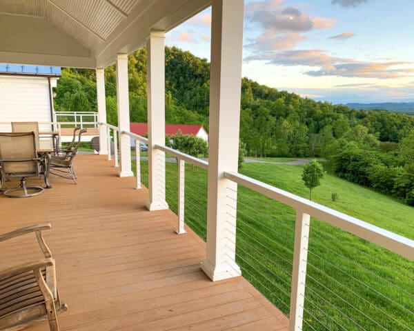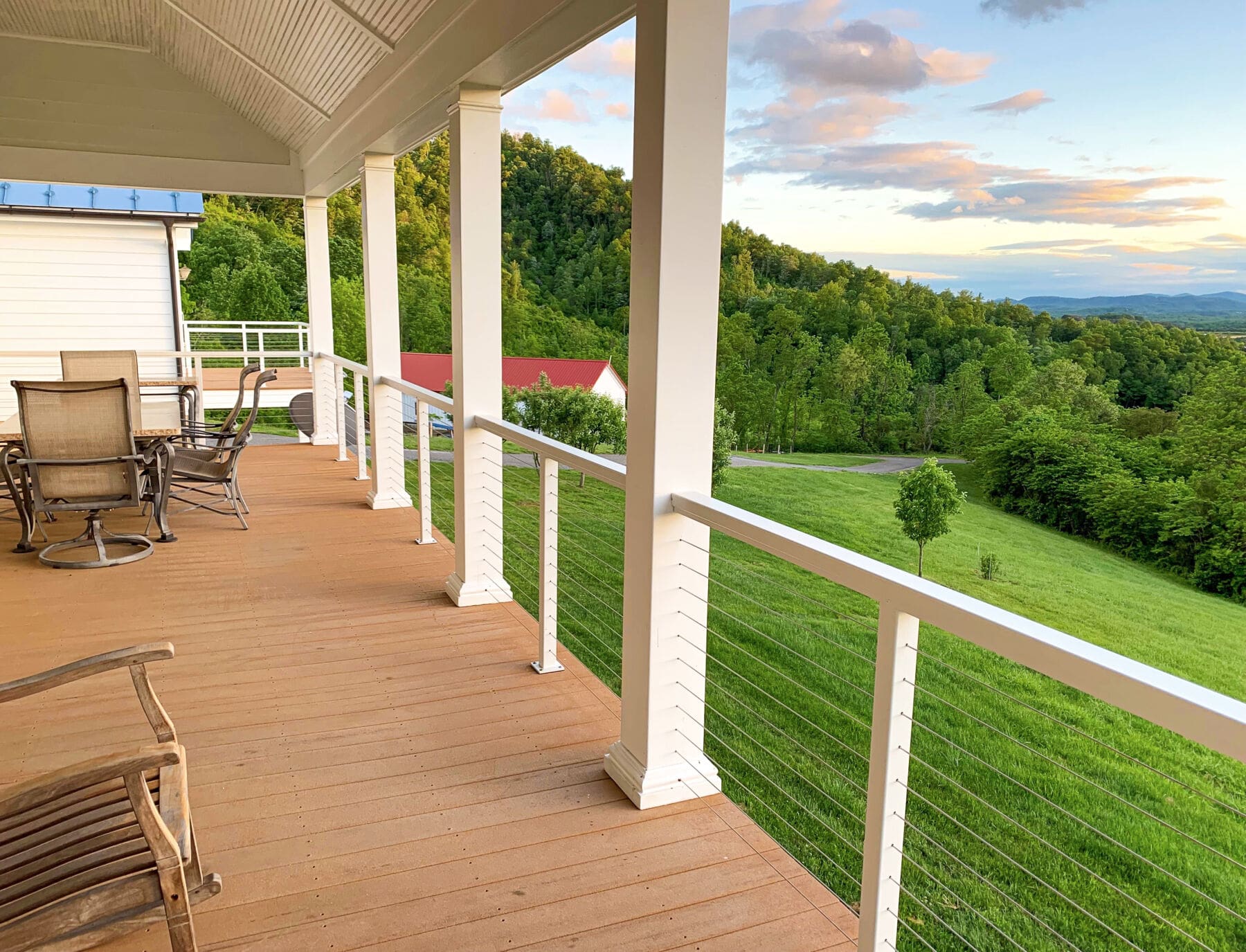 This Virginian home has an extensive porch that wraps around most of the house, with beautiful views of forests and distant hills. Our white cable railing fits perfectly between the white columns, completing this bright, inviting outdoor area.