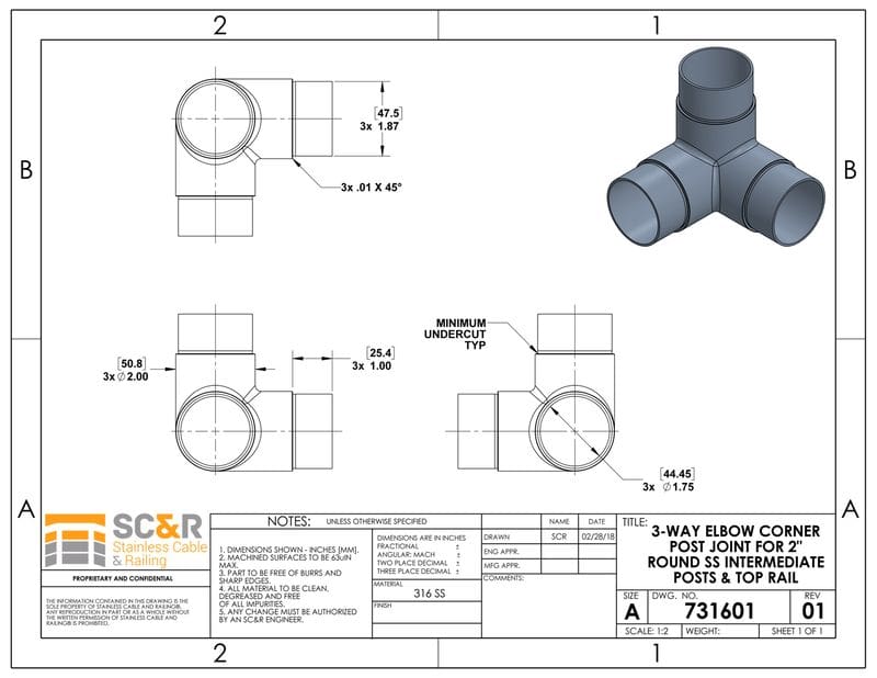 3-Way Elbow Corner Post Joint for 2″ Round Stainless Steel Intermediate Posts & Top Rail