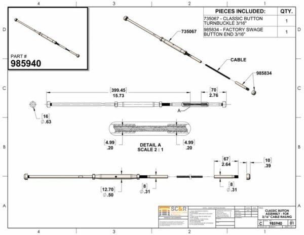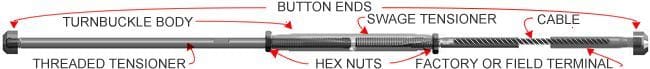 If using our PROFESSIONAL SWAGING SERVICE, choose a FACTORY SWAGED BUTTON END and provide us with your measurements at checkout. - Note: For all Assembly lengths >50′ (70′ max) and/or runs from 0-70′ with more than 1 90 degree corner, it is recommended to omit the SWAGE BUTTON END and use 2 CLASSIC BUTTON TURNBUCKLES instead to allow cable tightening at both ends of your run.