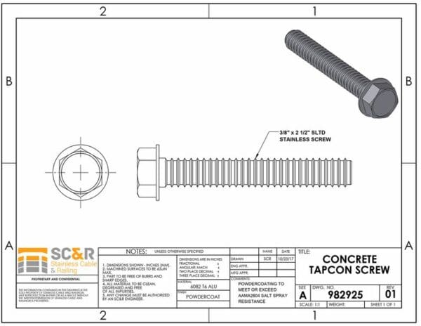 Tapcon Screws for Deck Mount onto Concrete Surfaces are Large Diameter Tapcon (LDT) Anchor screws that cut their own threads into concrete. Use to secure aluminum and stainless steel base plates and decks mounts into concrete surfaces.
