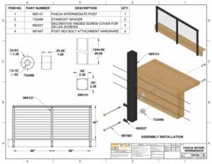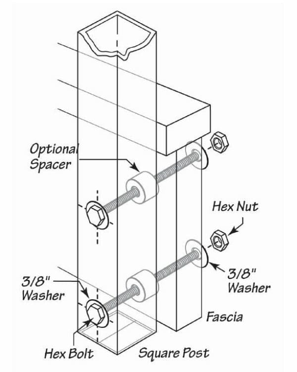 The FASCIA MOUNT INTERMEDIATE POST mounts directly to the rim joist or fascia board by attachment hardware. Usually these are lag bolts (sold separately).